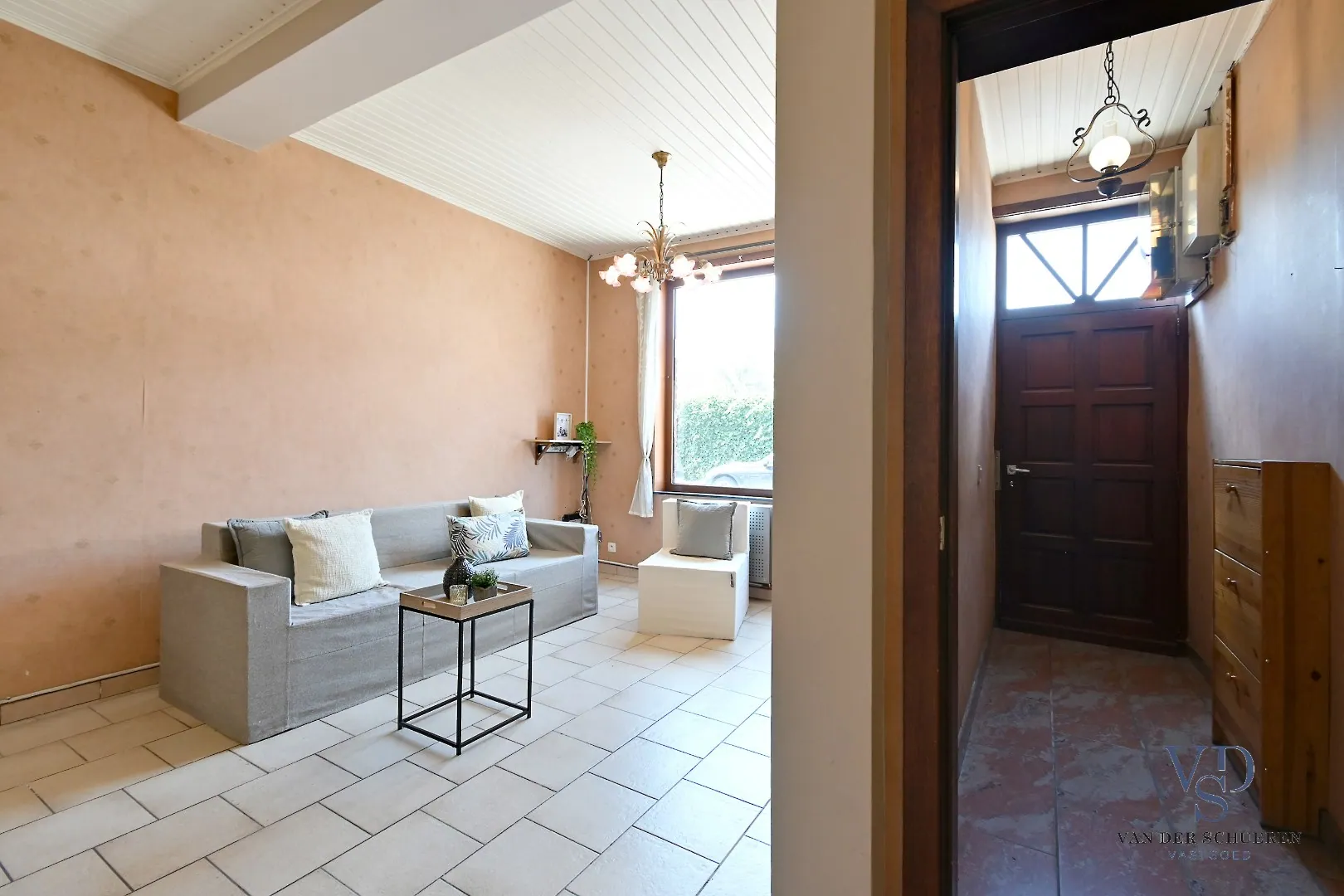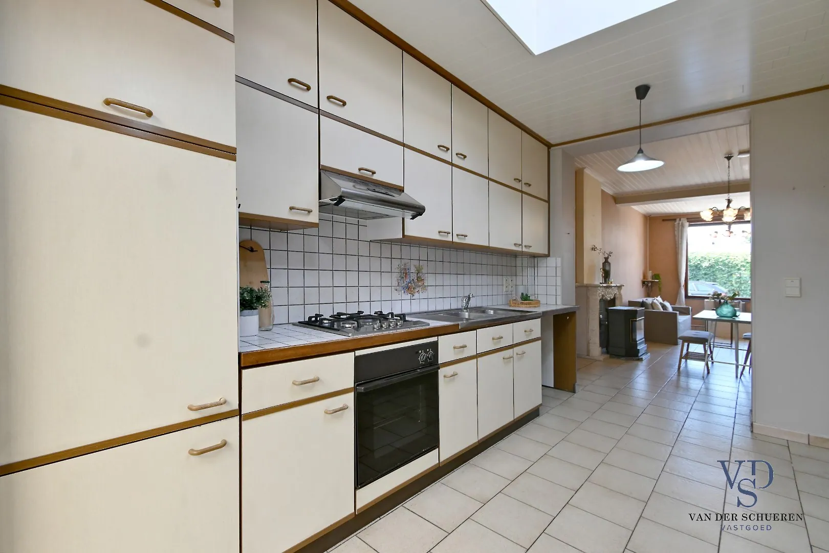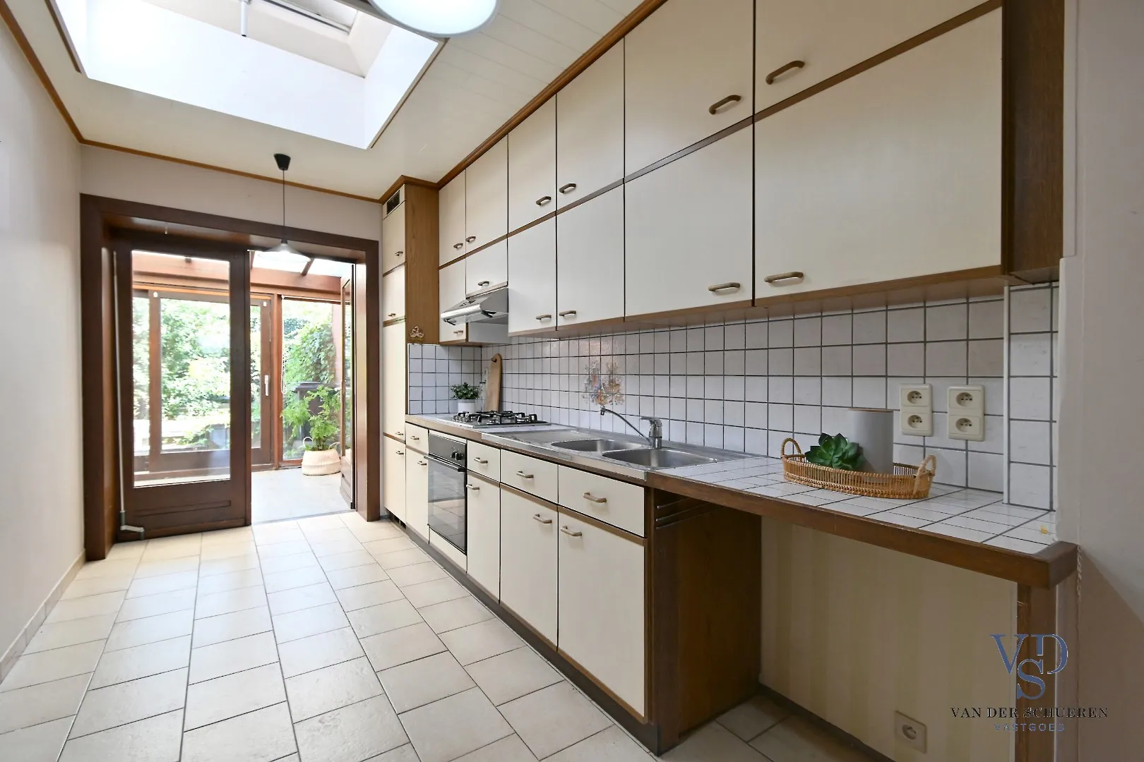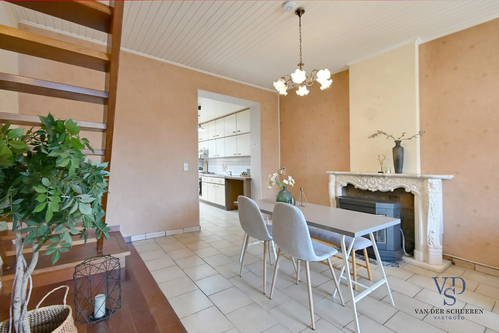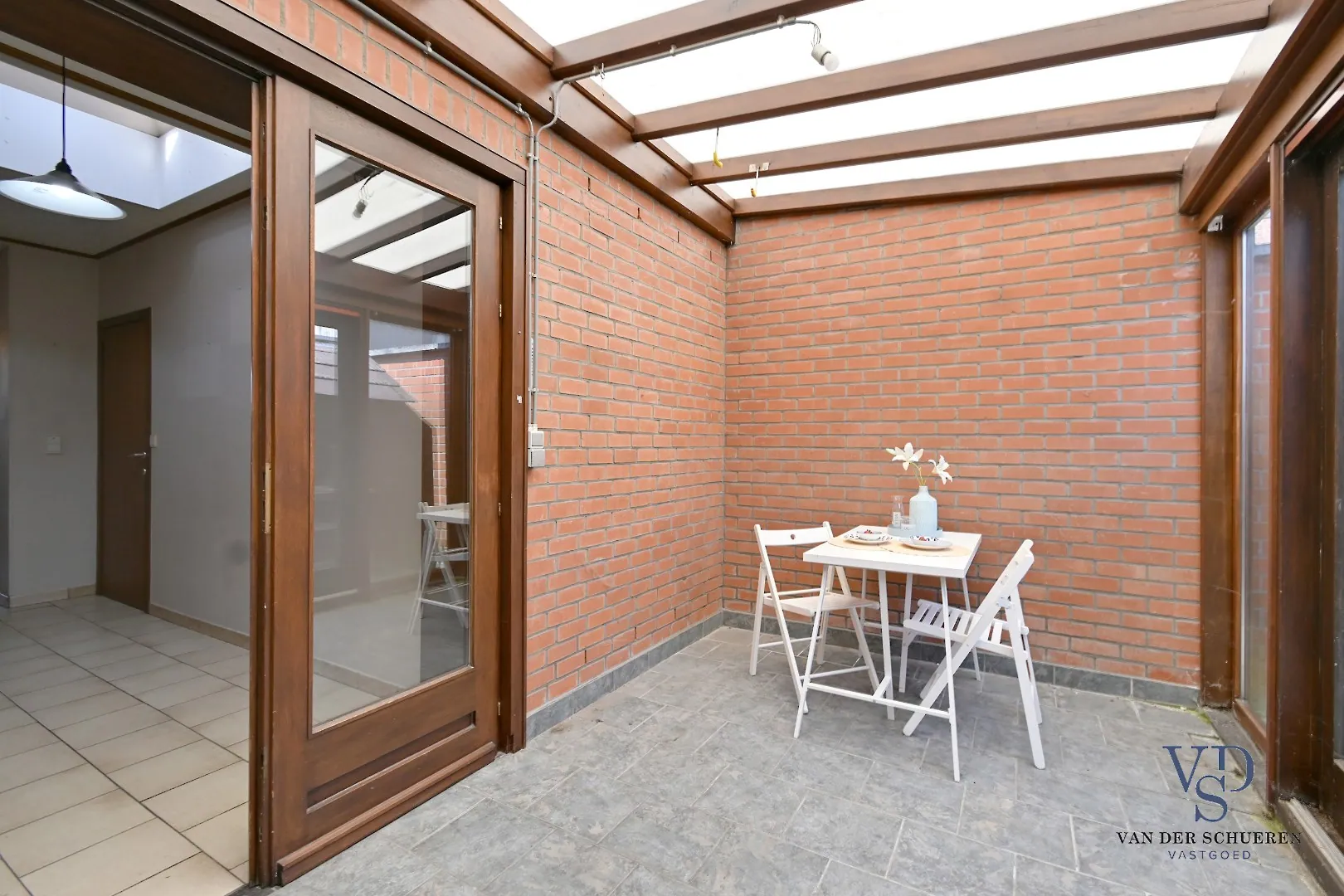 Op het gelijkvloers treffen we een functionele inkom, ruime leefruimte, keuken, badkamer en veranda. Eveneens een gezellige stadstuin.