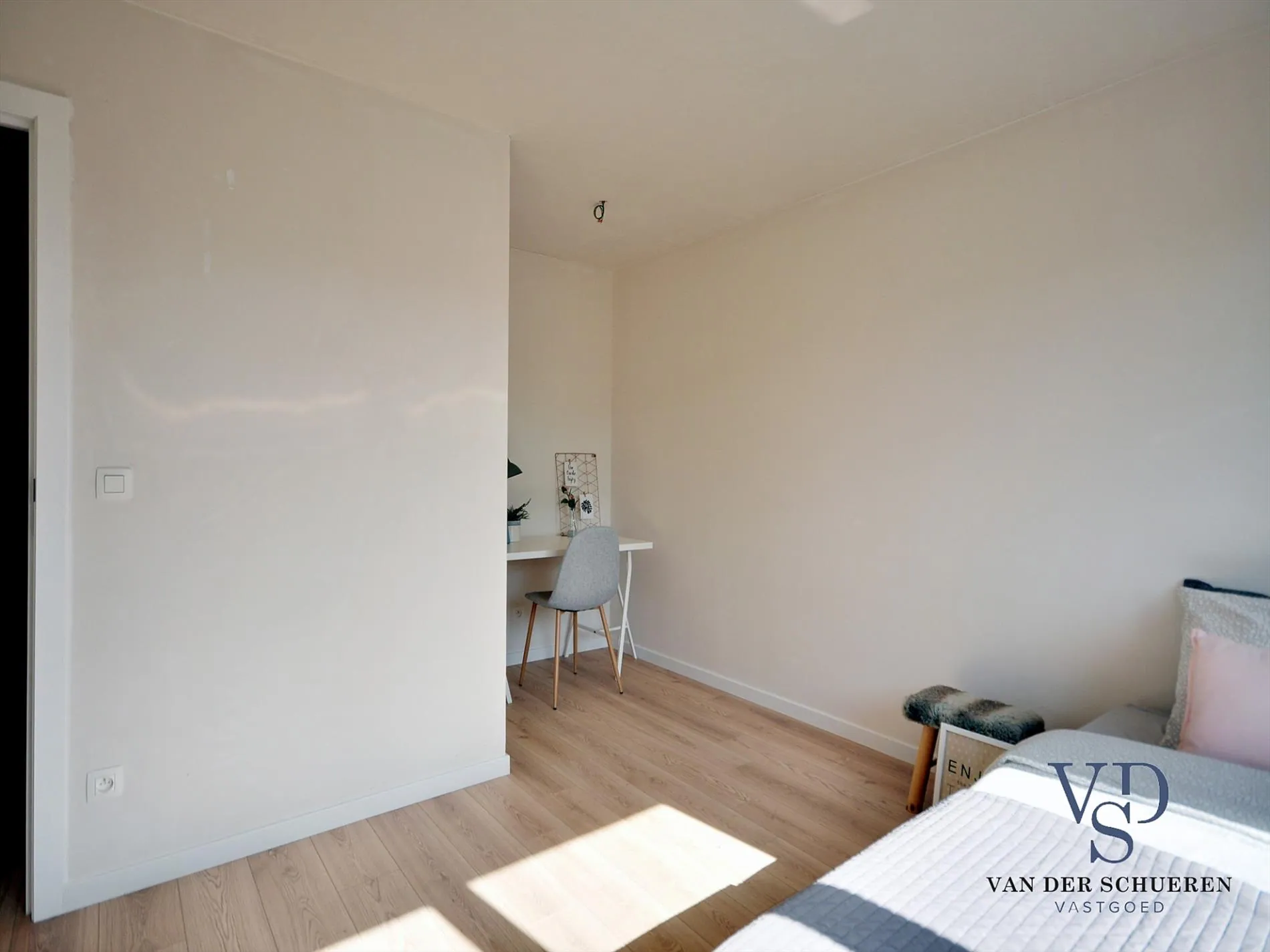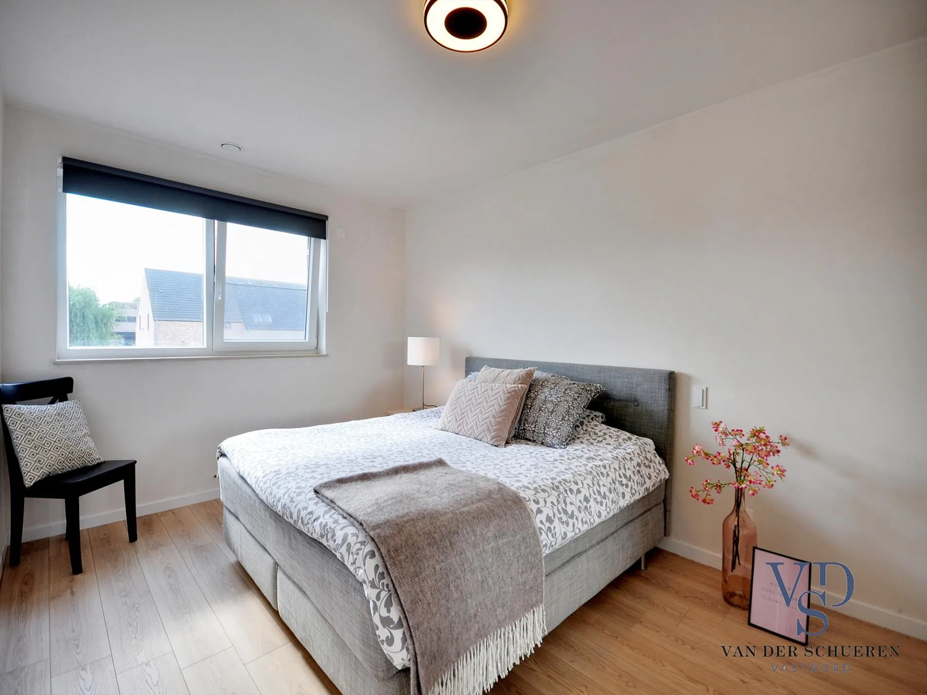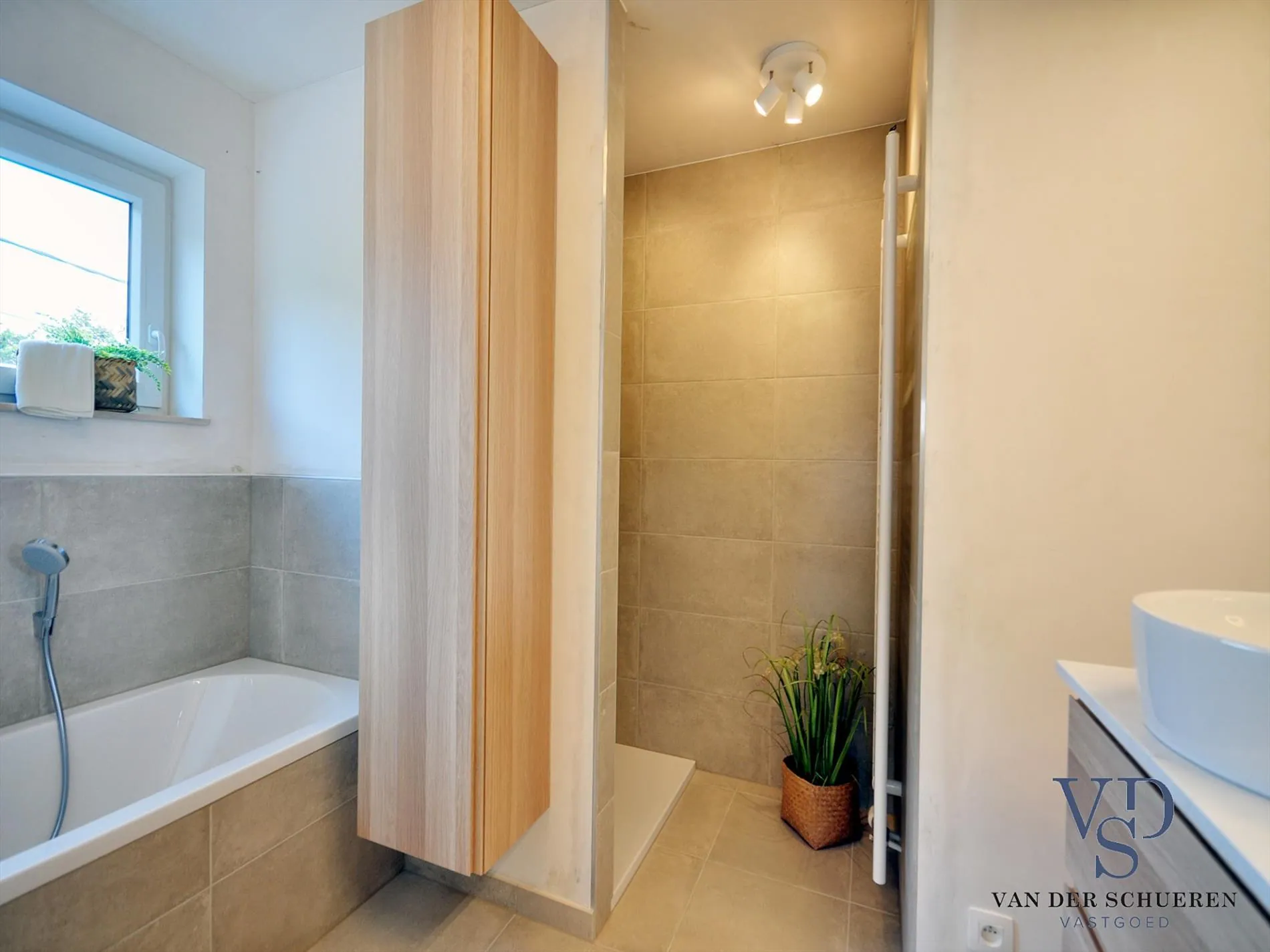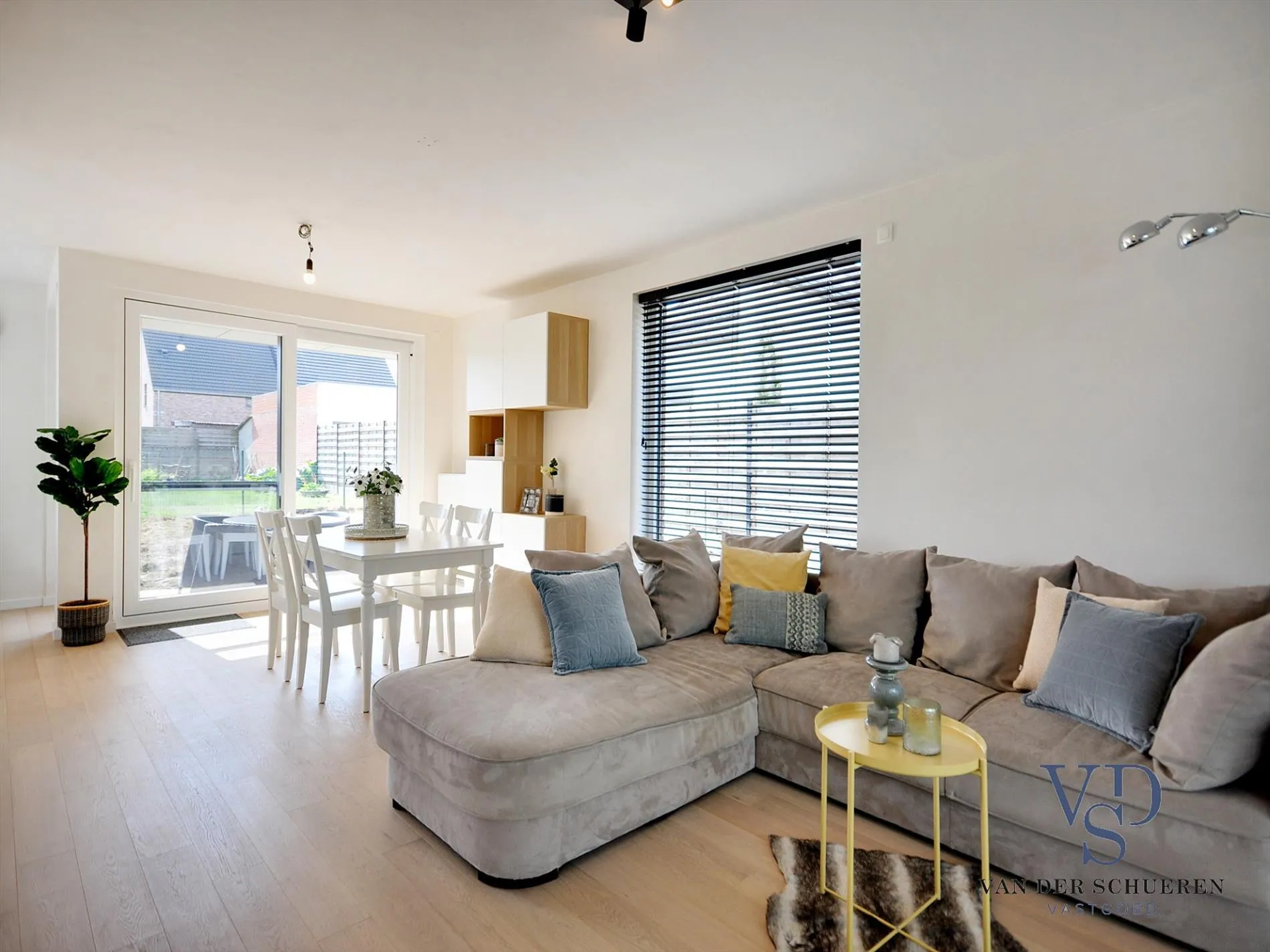 Boven het zonneterras kraagt de eerste verdieping plaatselijk uit, zodat de lente- en herfstzon steeds een maximaal resultaat geeft, én in de zomer oververhitting vermeden wordt.