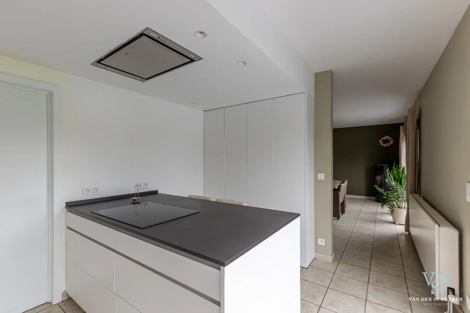 Ruime leefruimte met moderne keuken en praktische berging en wasplaats.