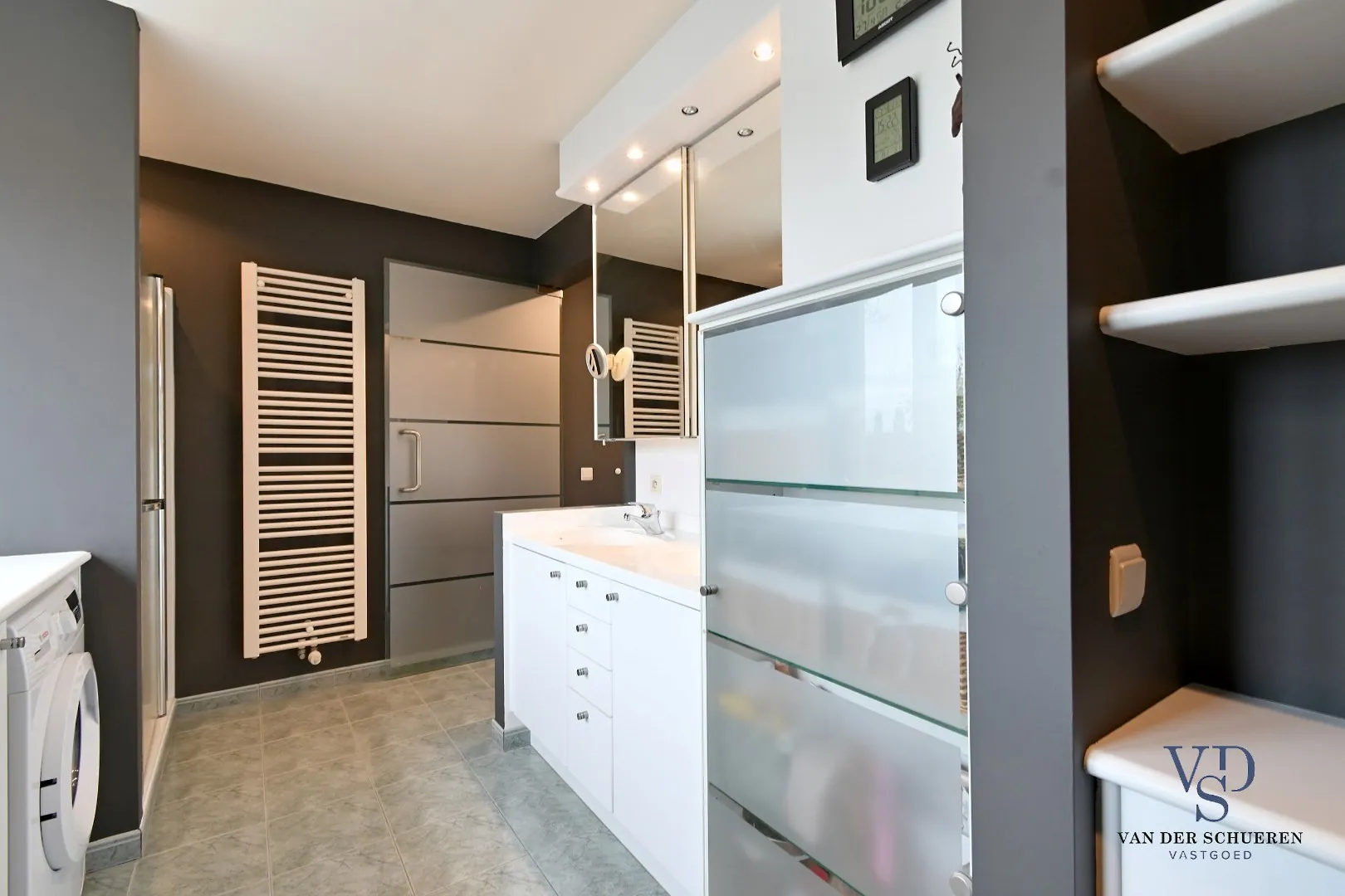 Het gelijkvloerse niveau beschikt, naast een praktische, stijlvolle keuken (gasfornuis én vitrokeramische kookplaat) en leefruimte, salon, bar,... eveneens over een afzonderlijke slaapkamer en badkamer. De stijlvolle inkom brengt u eveneens naar de verdieping met mogelijkheid voor 3 slaapkamers, badkamer, berging.