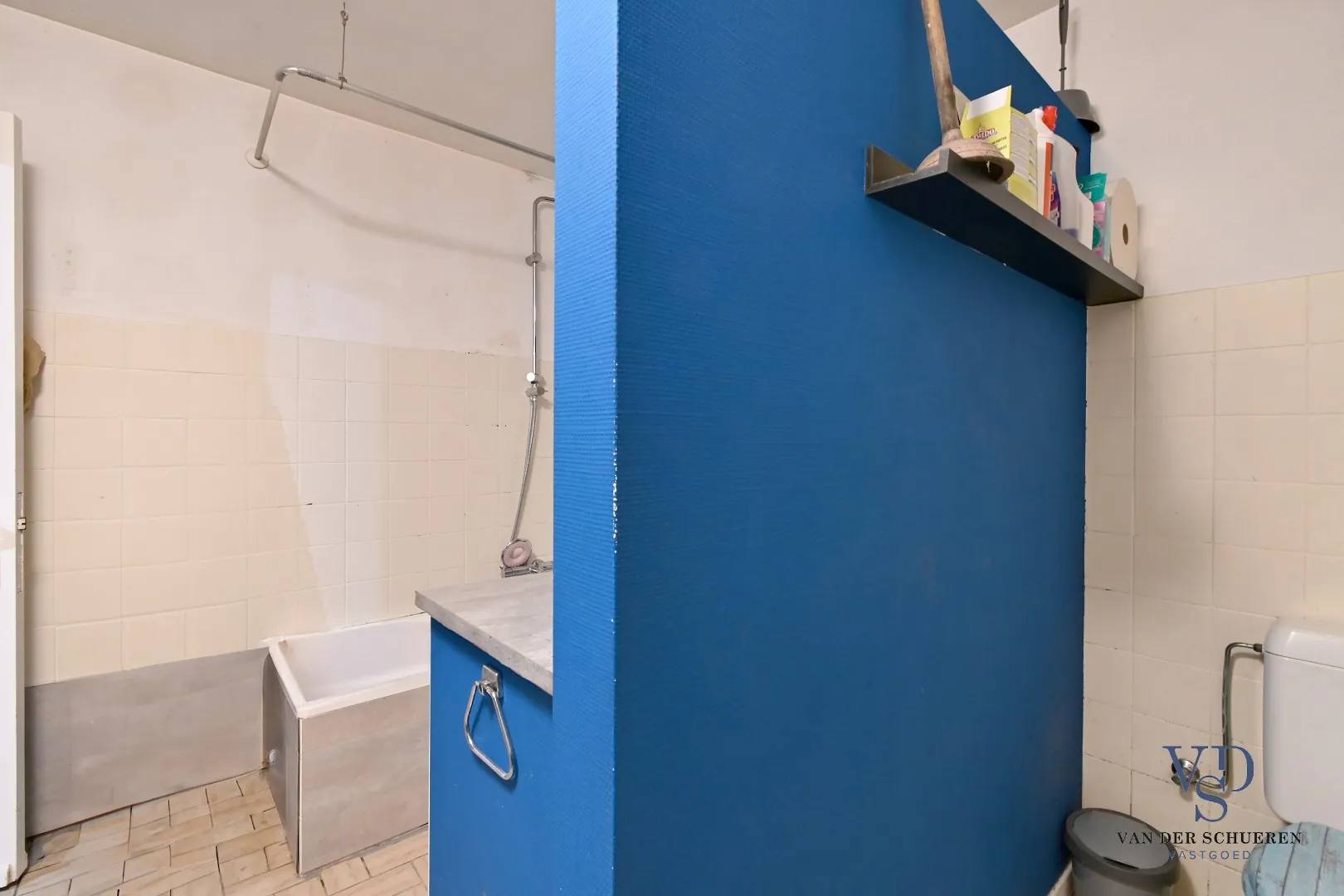 Deze woning is opgedeeld in een inkomhal, leefruimte met eetplaats, keuken met aanpalende badkamer en berging.