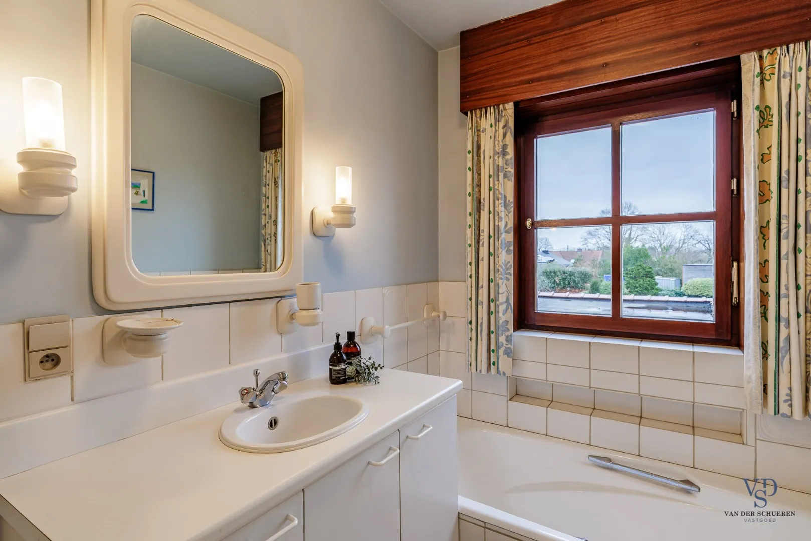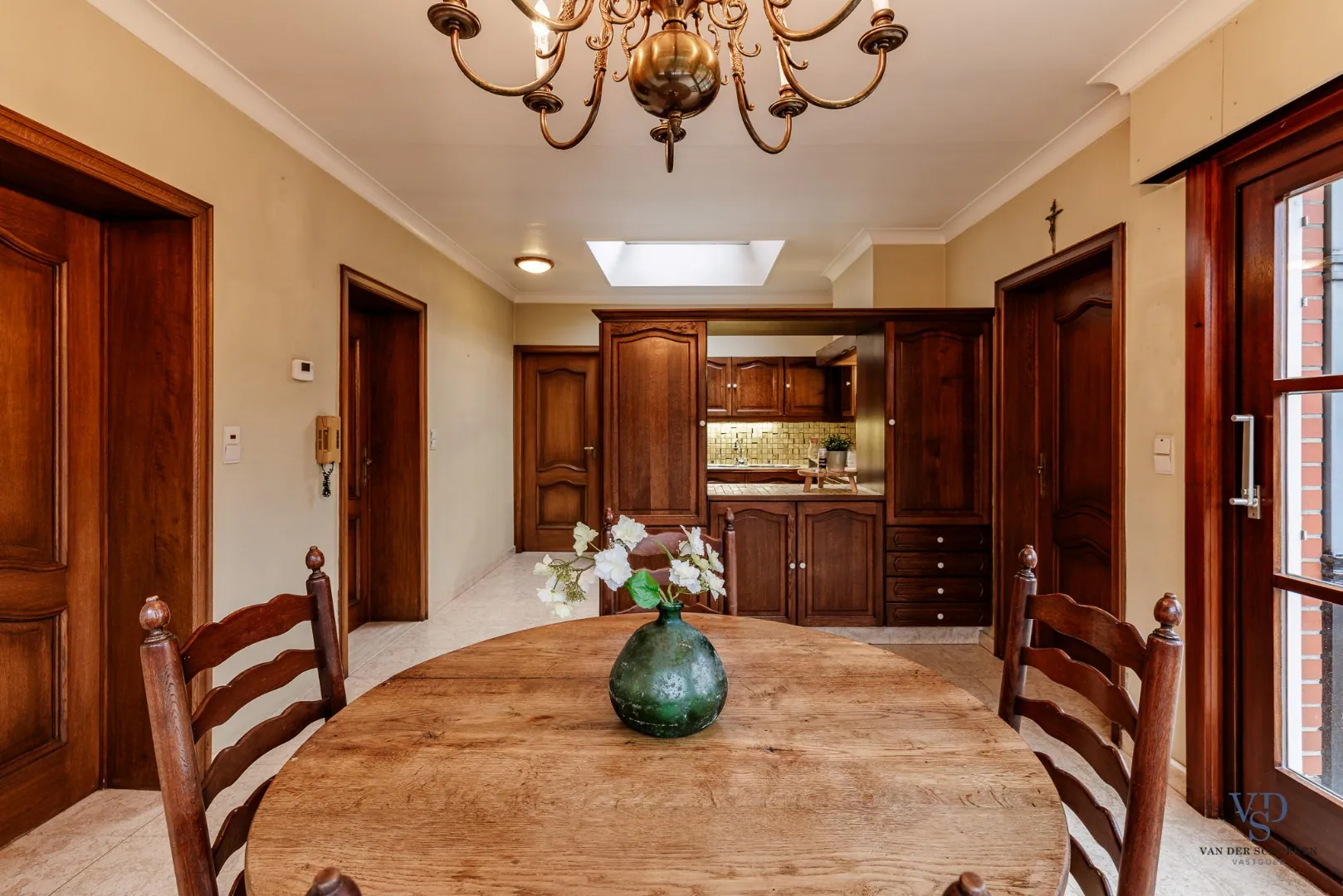 De woning heeft een afzonderlijke keuken met uitzicht op de tuin, vanwaar u tevens toegang heeft tot de kelder. Verder zijn er een ruime wasruimte, een eerste badkamer en een inpandige garage aanwezig.