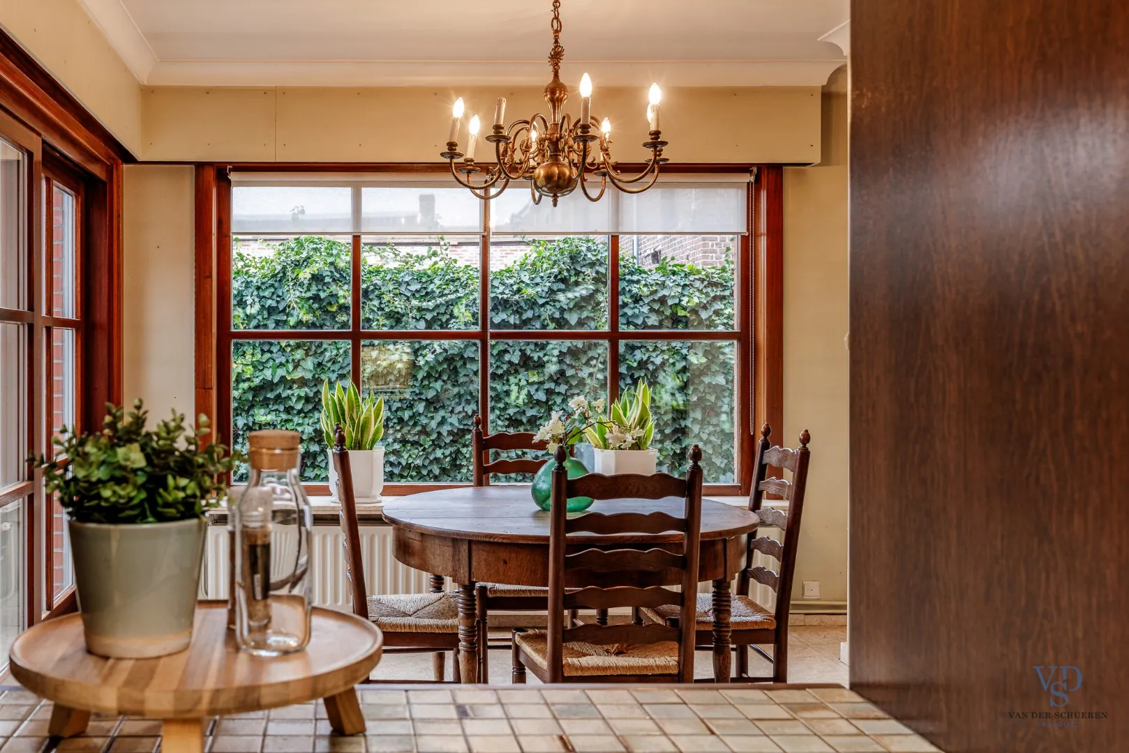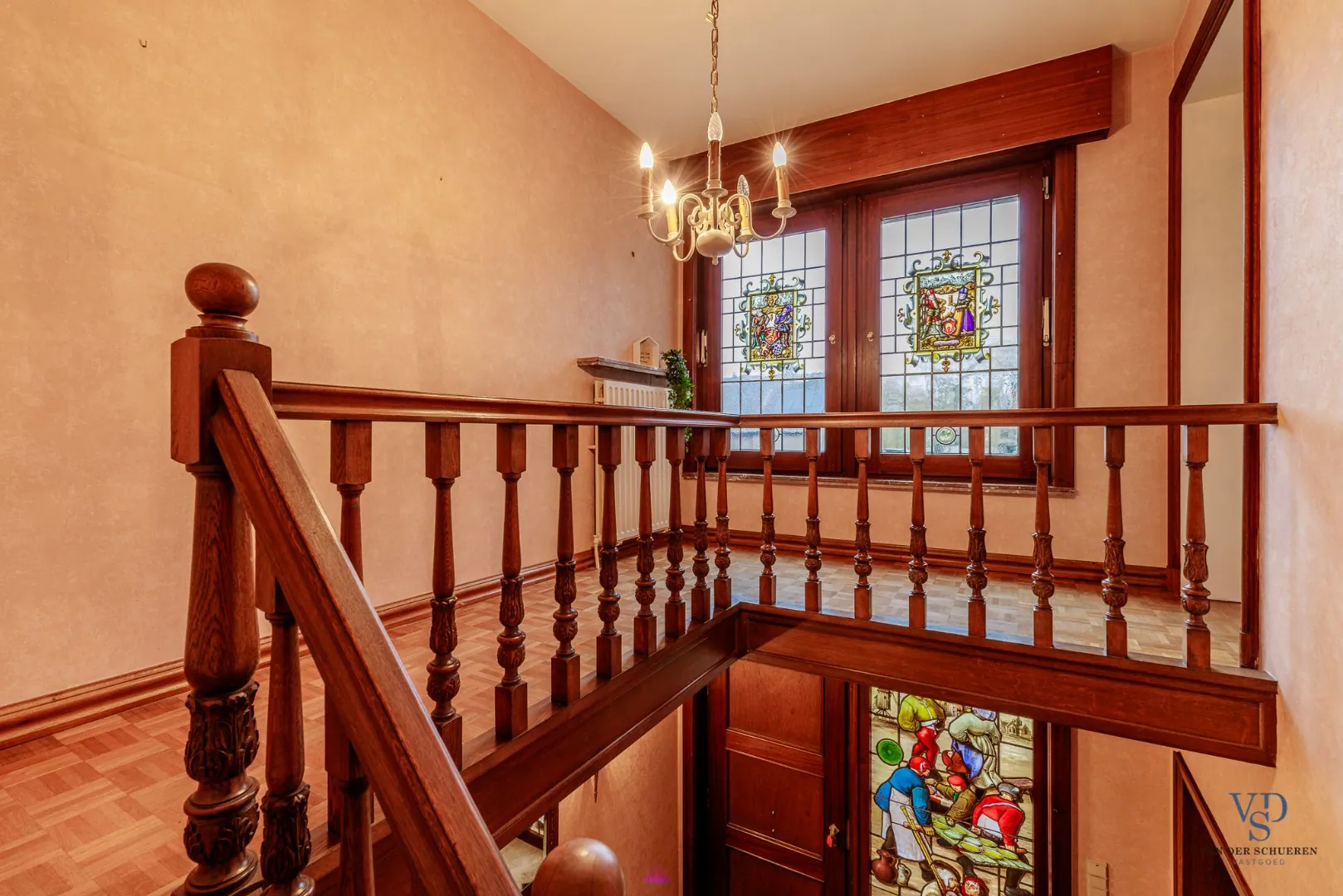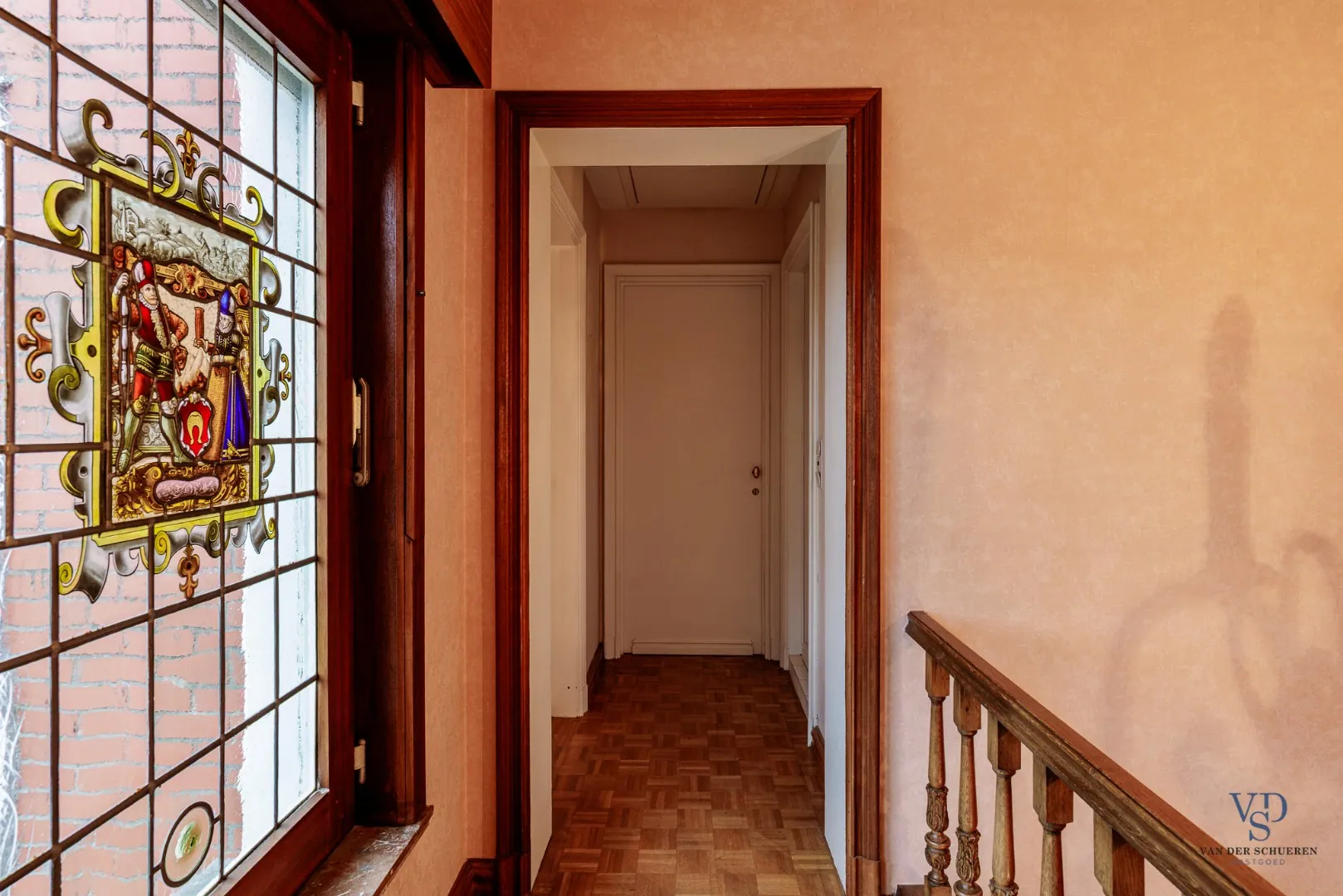 Een echte eyecatcher van deze woning is het glas-in-lood, dat op verschillende plaatsen aanwezig is en de woning karakter en charme verleent.