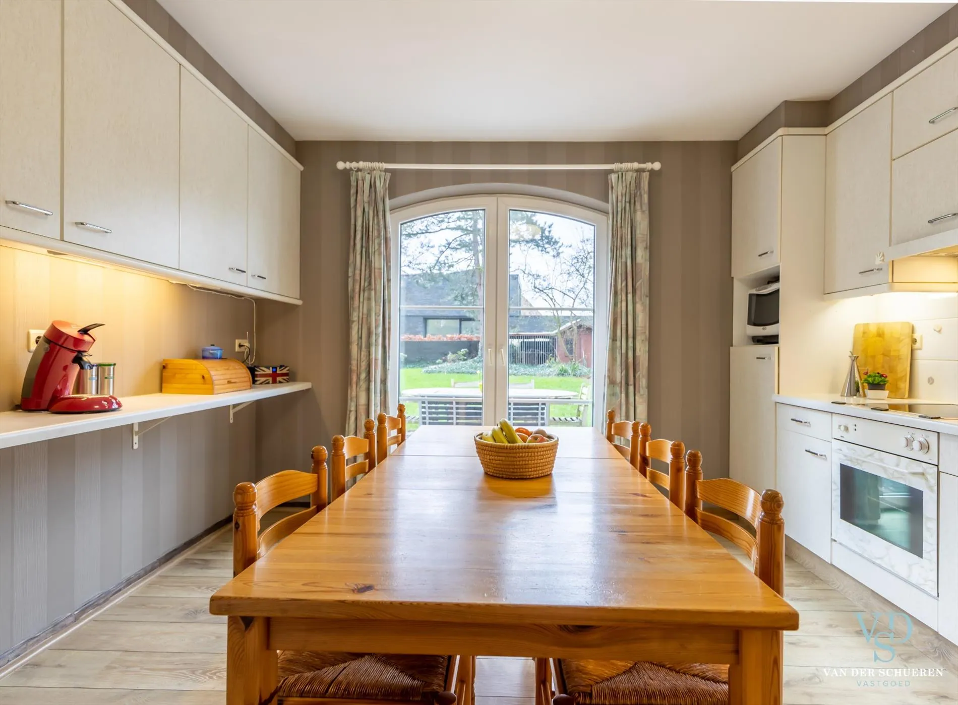 Het ruimtegevoel van deze bijzonder ruime leefruimte wordt nog versterkt door licht en de groene omgeving.