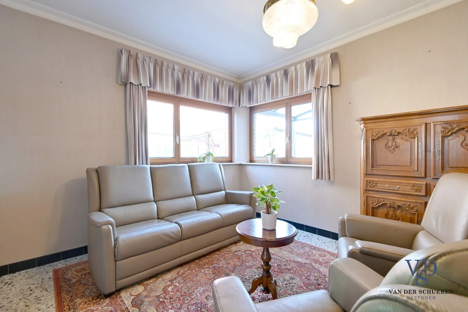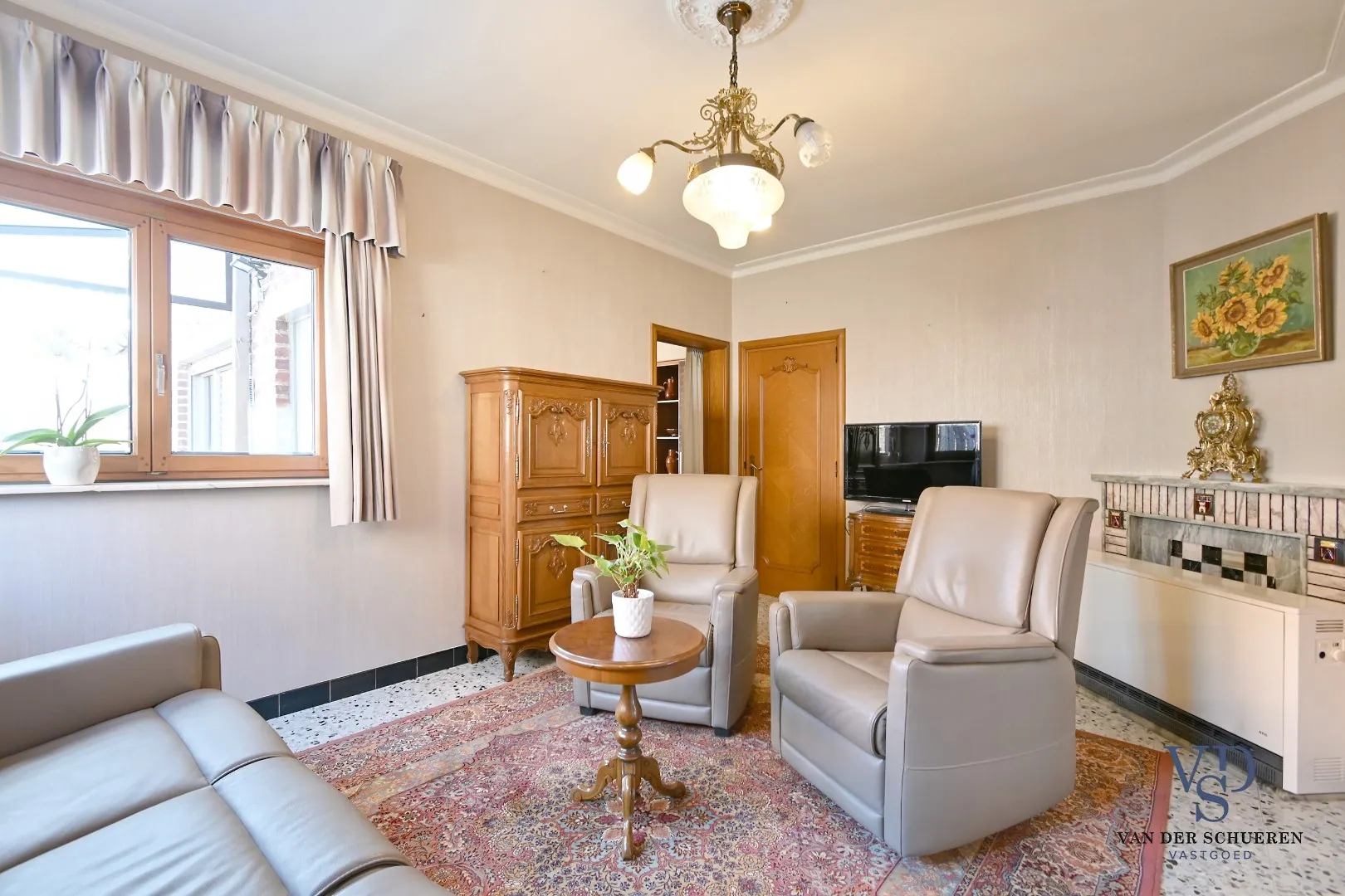 Deze bijzonder degelijke, halfopen bebouwing is op het gelijkvloers voorzien van een aangename inkomhal met gastentoilet, ruime leefruimte, afzonderlijk salon, keuken en badkamer.