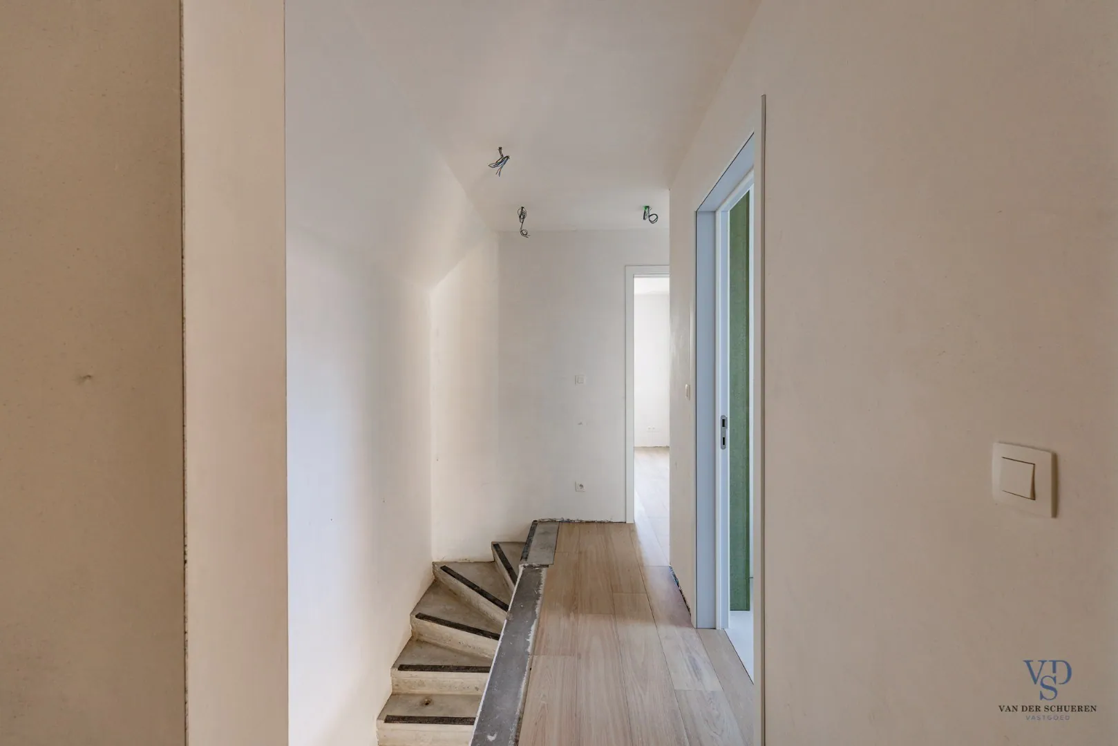 Via de inkom kunnen we zowel de zithoek (links) als de open keuken met eethoek (rechts) binnenkomen. In de overloop tussen beide ruimten (zithoek en eethoek) situeert de trap naar de verdieping evenals een pc-hoek.
