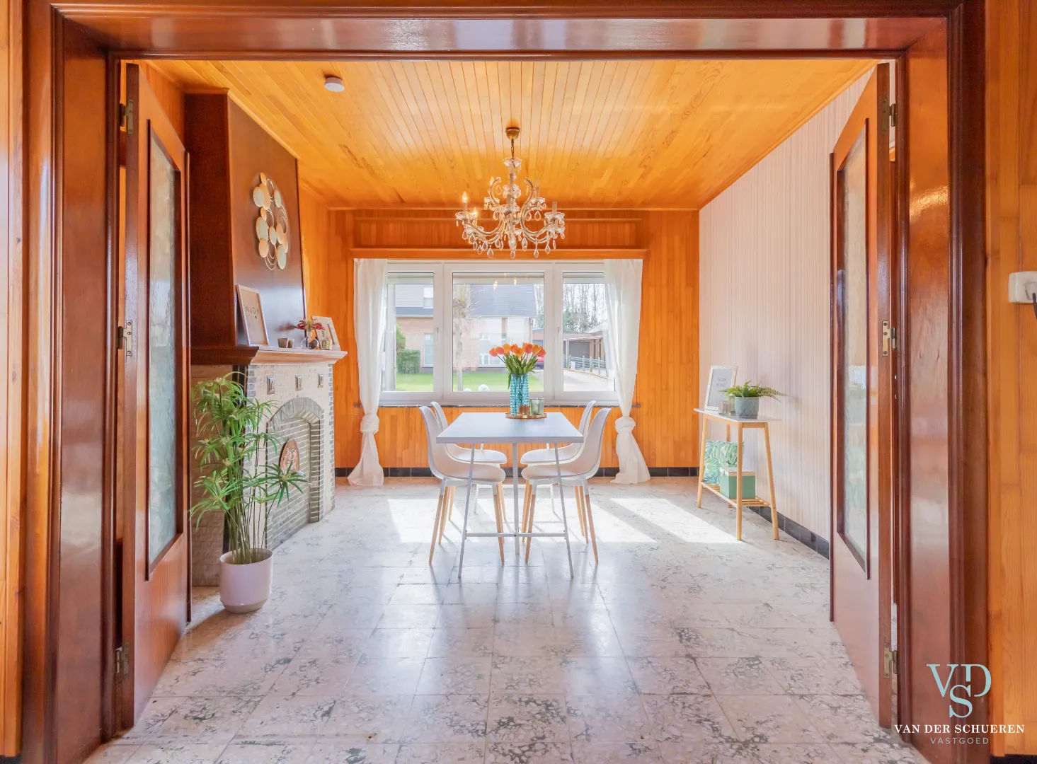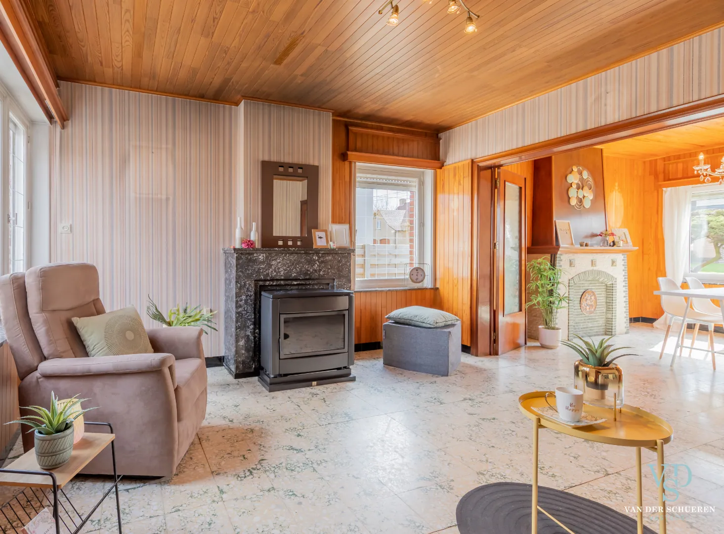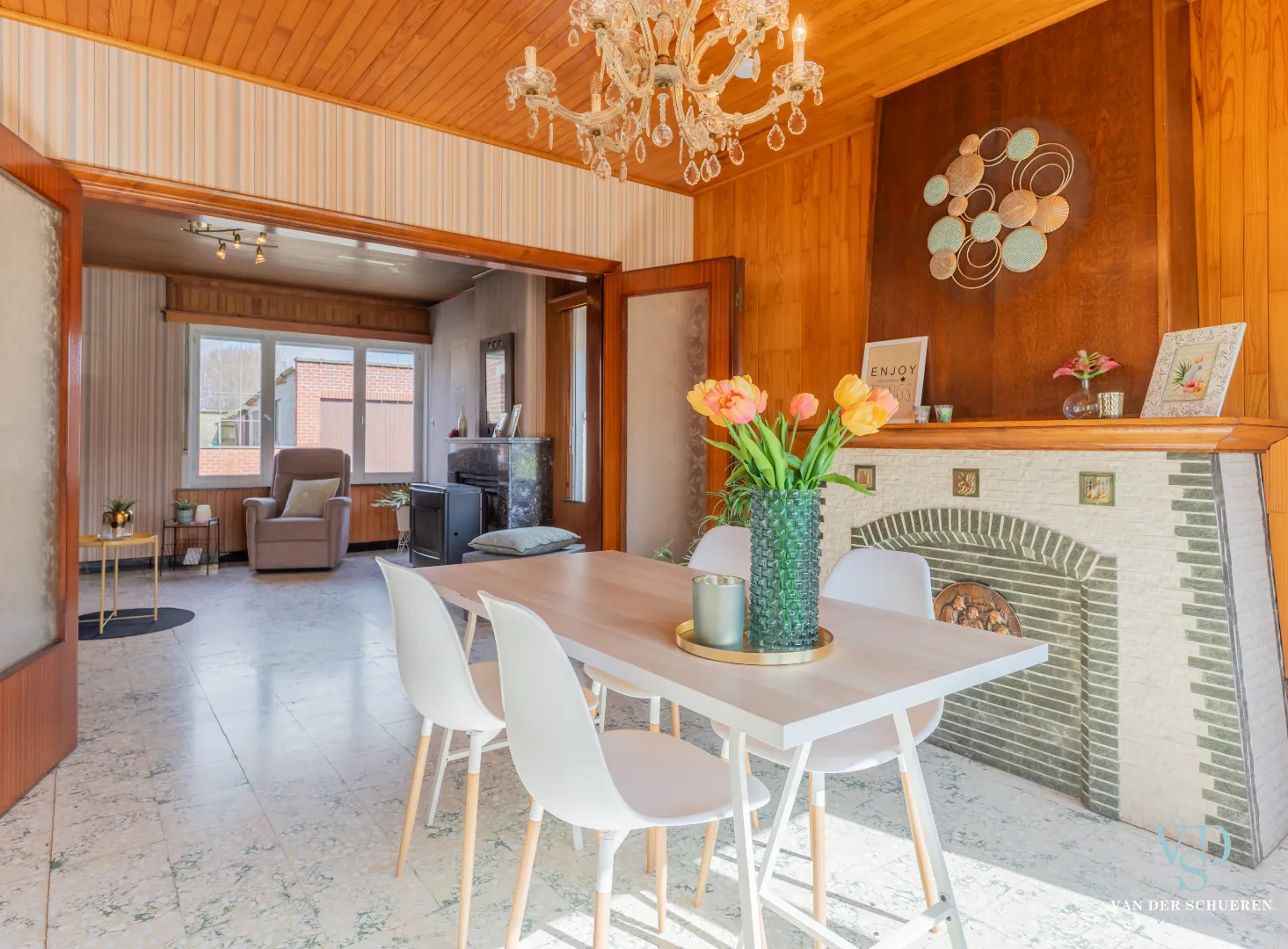 Deze bijzonder degelijke woning is op het gelijkvloers voorzien van een ruime inkomhal, lichtrijke dinerruimte, leefruimte, keuken en badkamer.