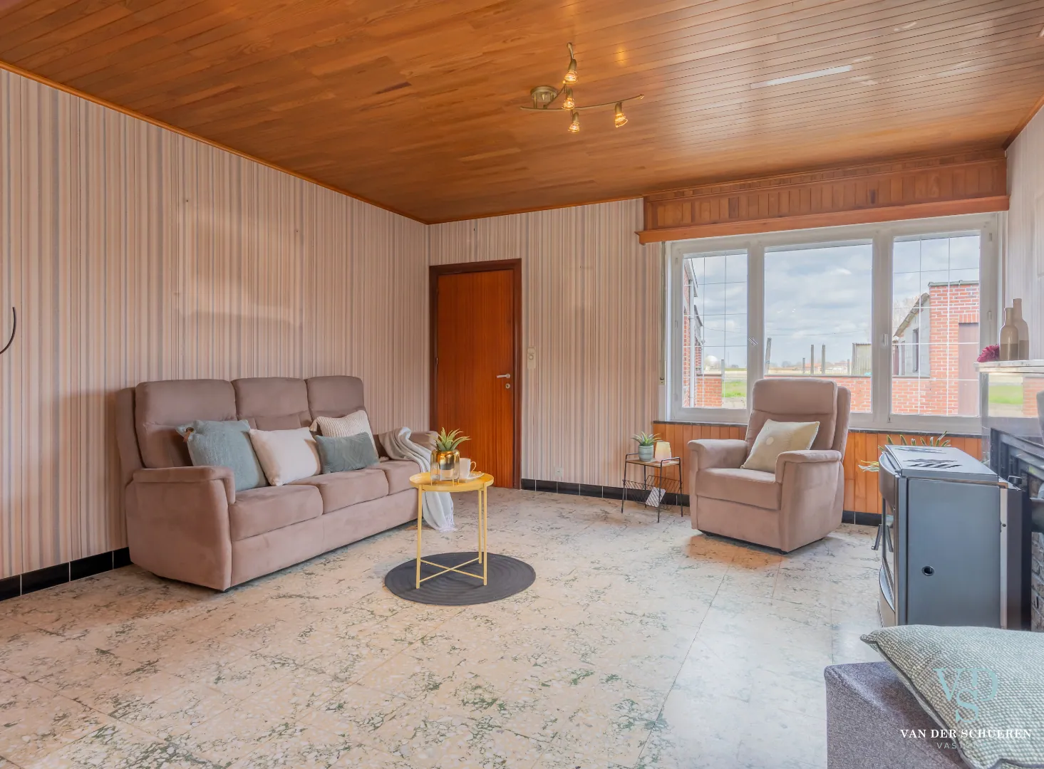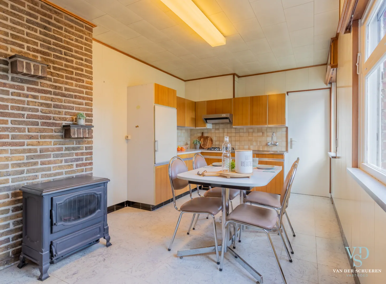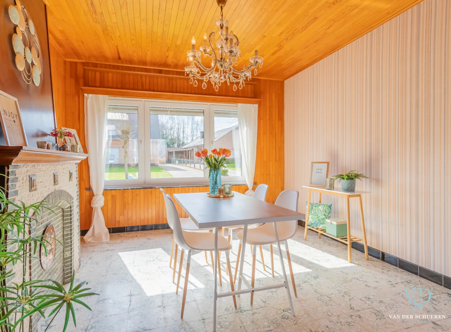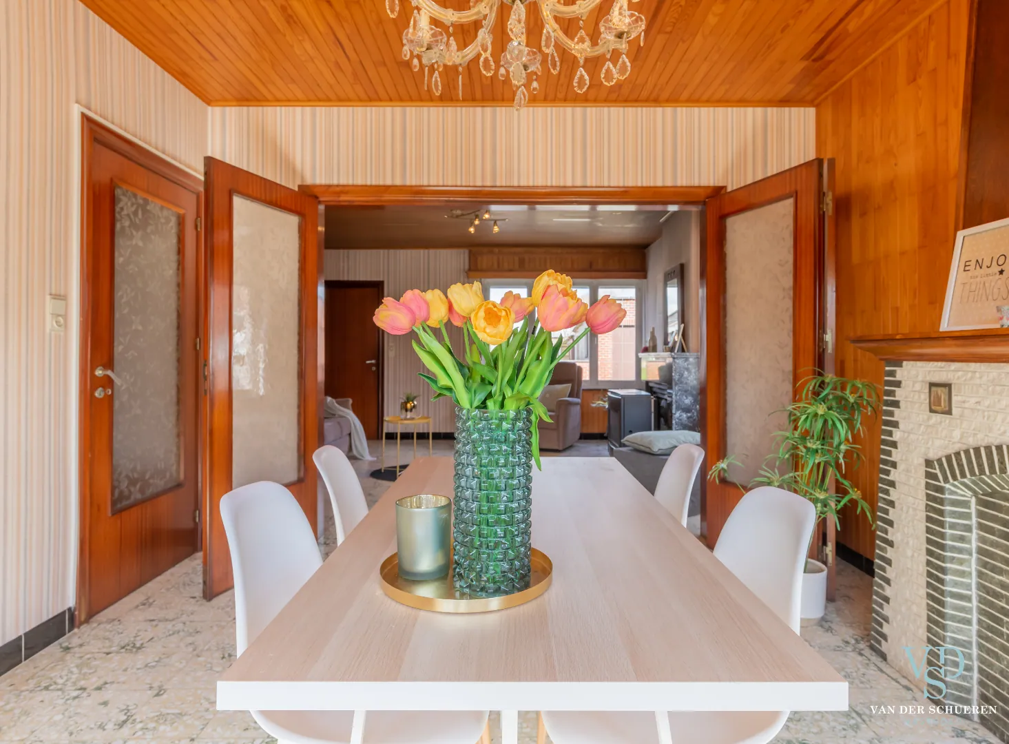 Deze bijzonder degelijke woning is op het gelijkvloers voorzien van een ruime inkomhal, lichtrijke dinerruimte, leefruimte, keuken en badkamer.