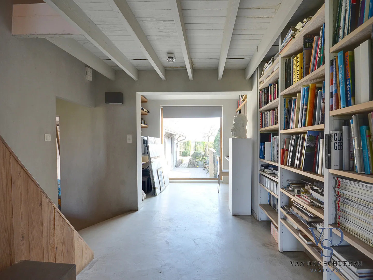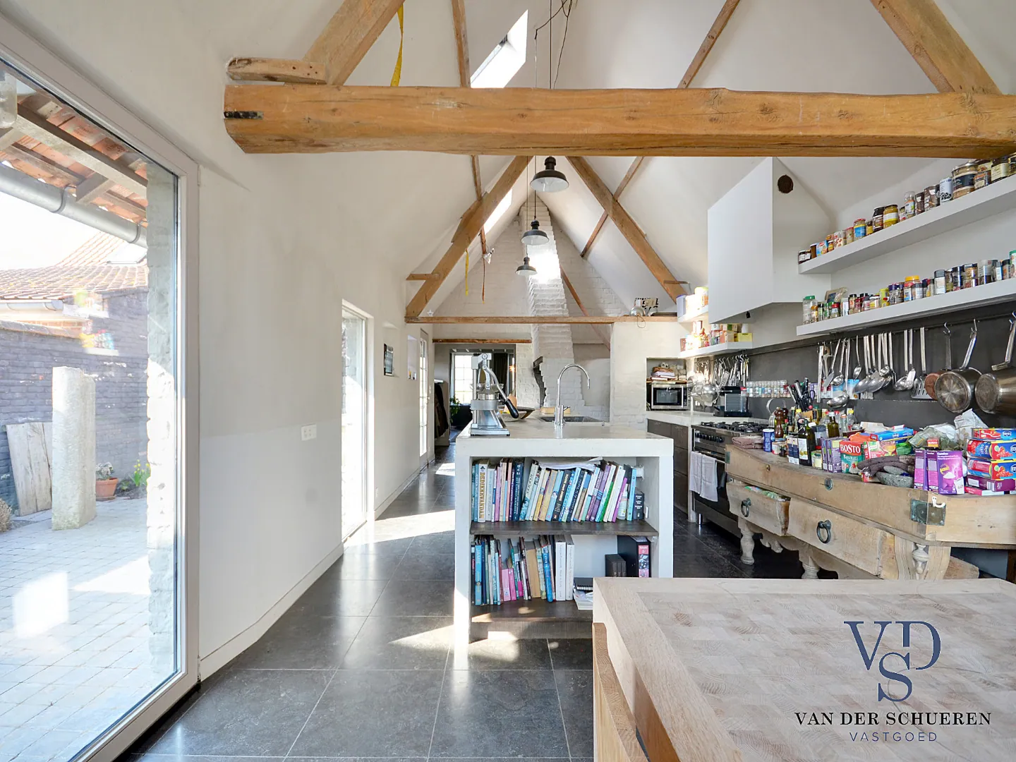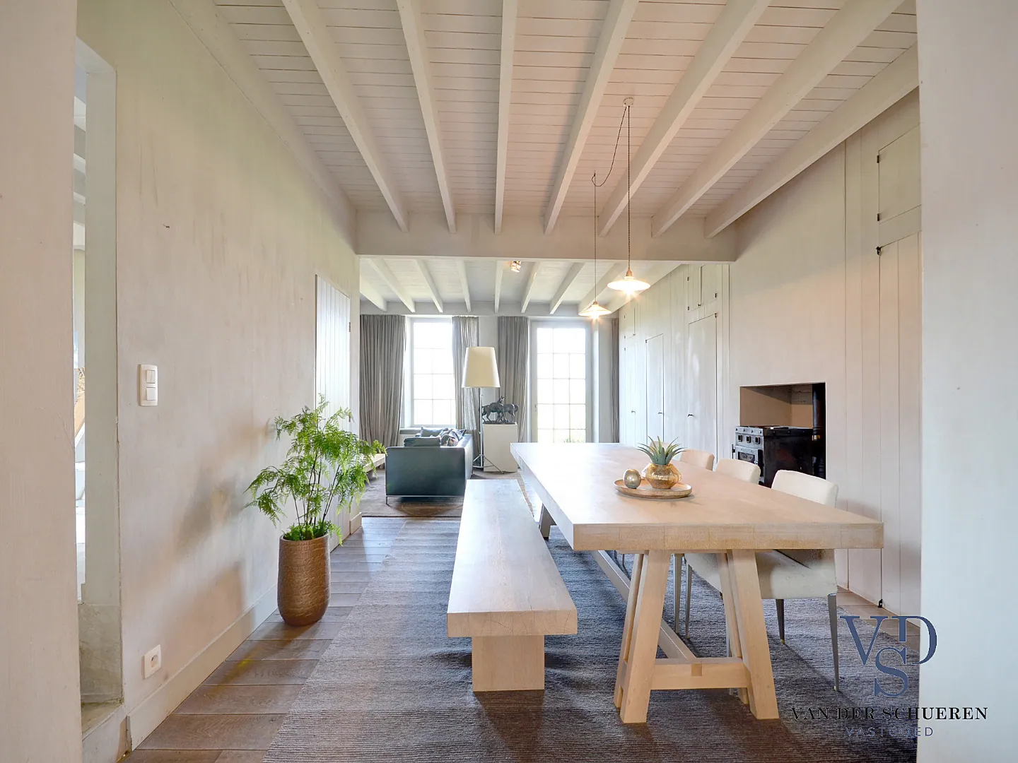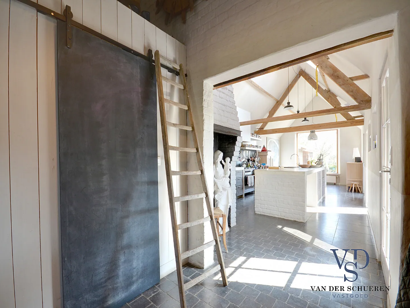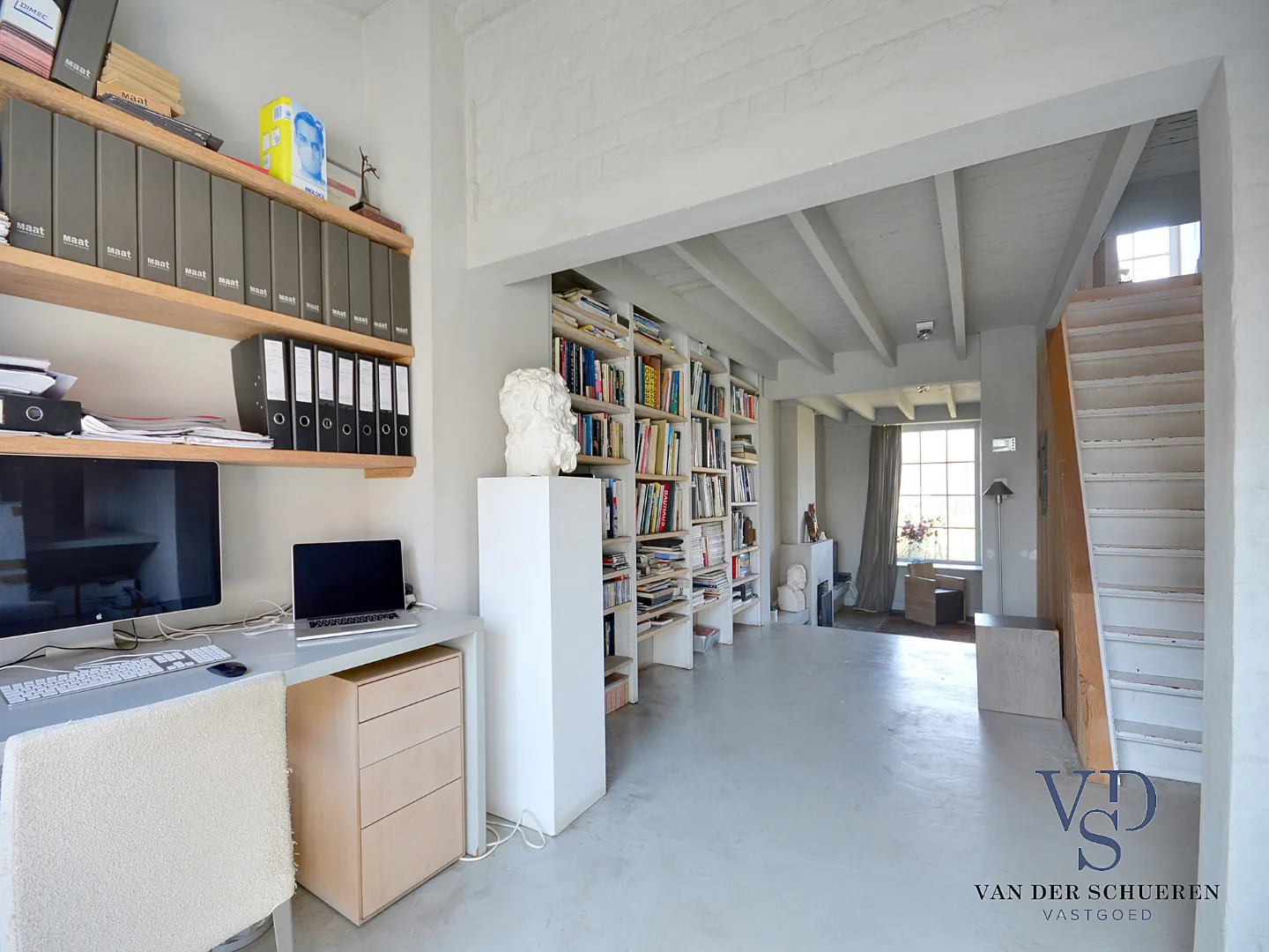 De ruime, bijzonder aangename leef- en zitruimte sluit aan op de thans als bureau ingerichte voute-kamer (met mortex-vloer). De praktische keuken baadt eveneens in stijl en licht. Deze huisstijl vinden we ook in tuin en terras terug.