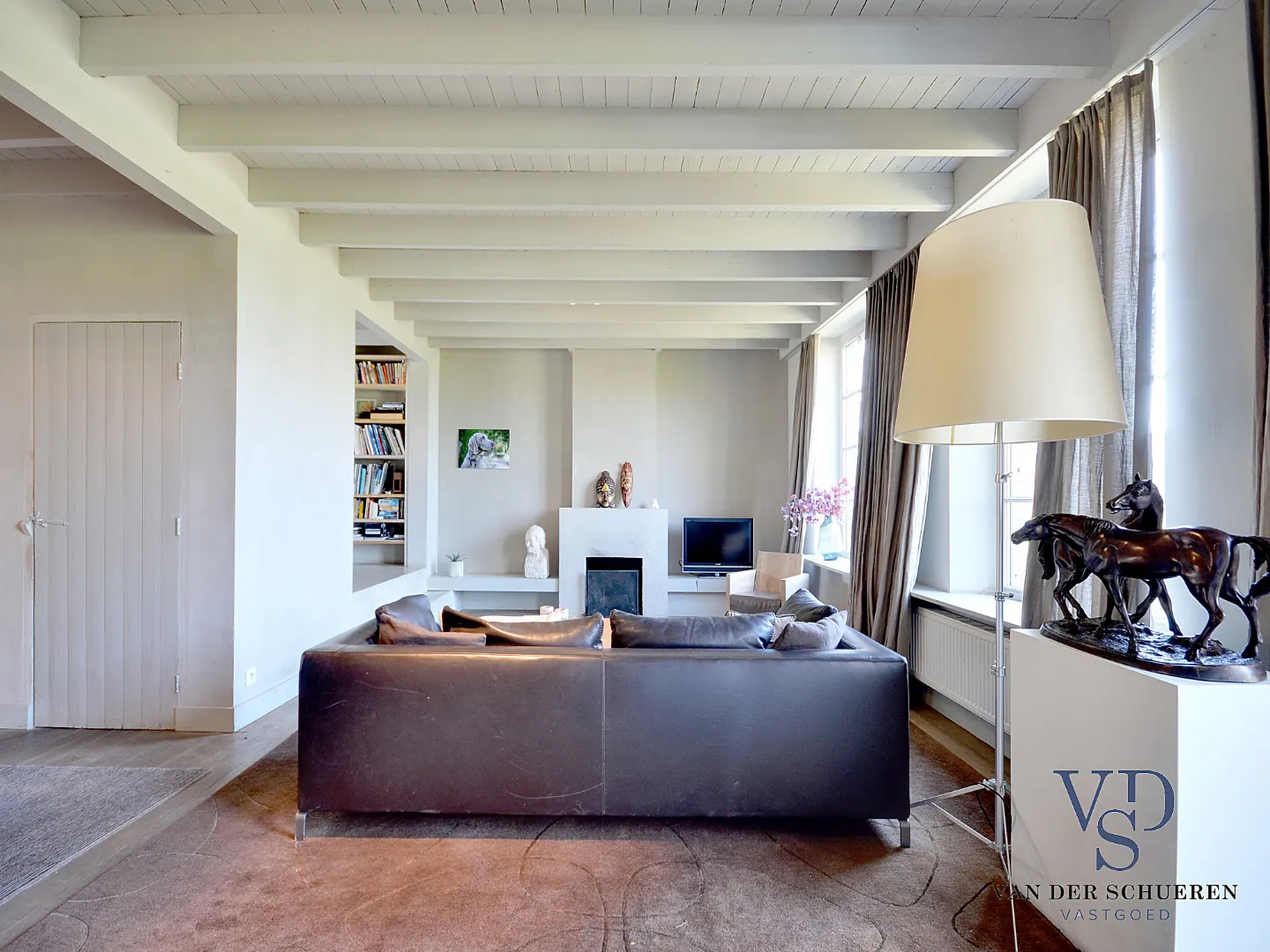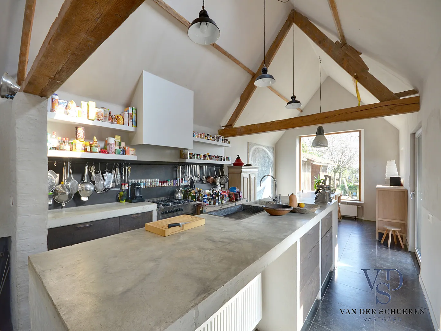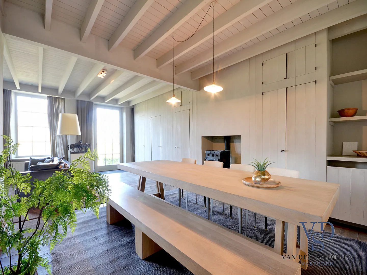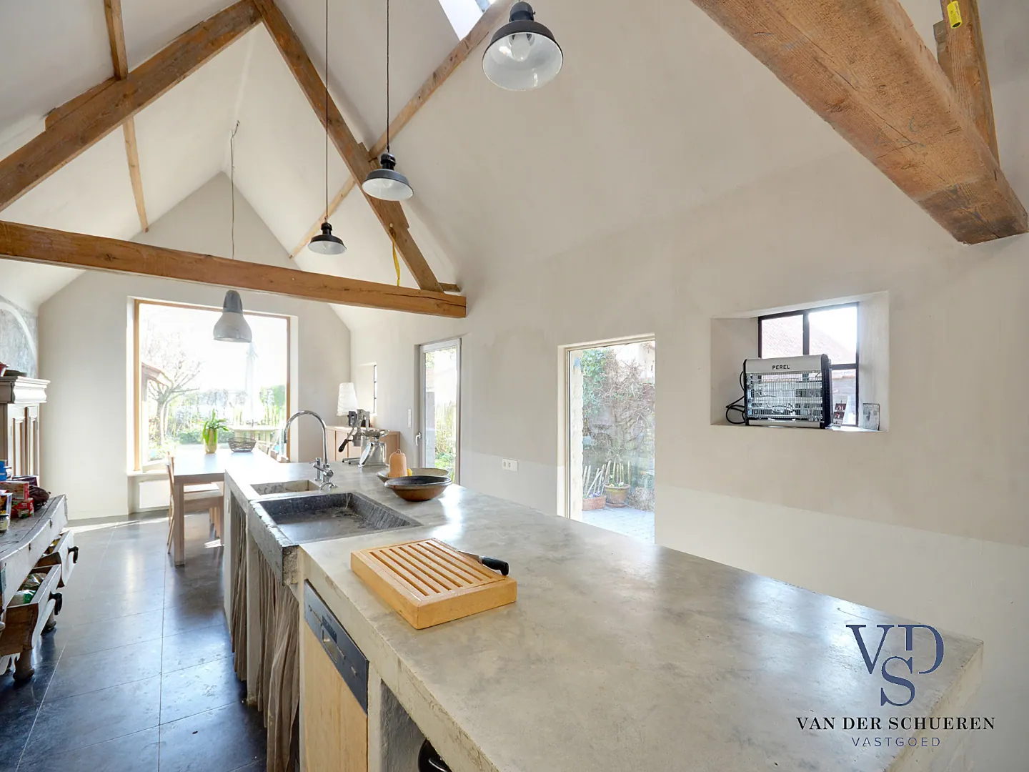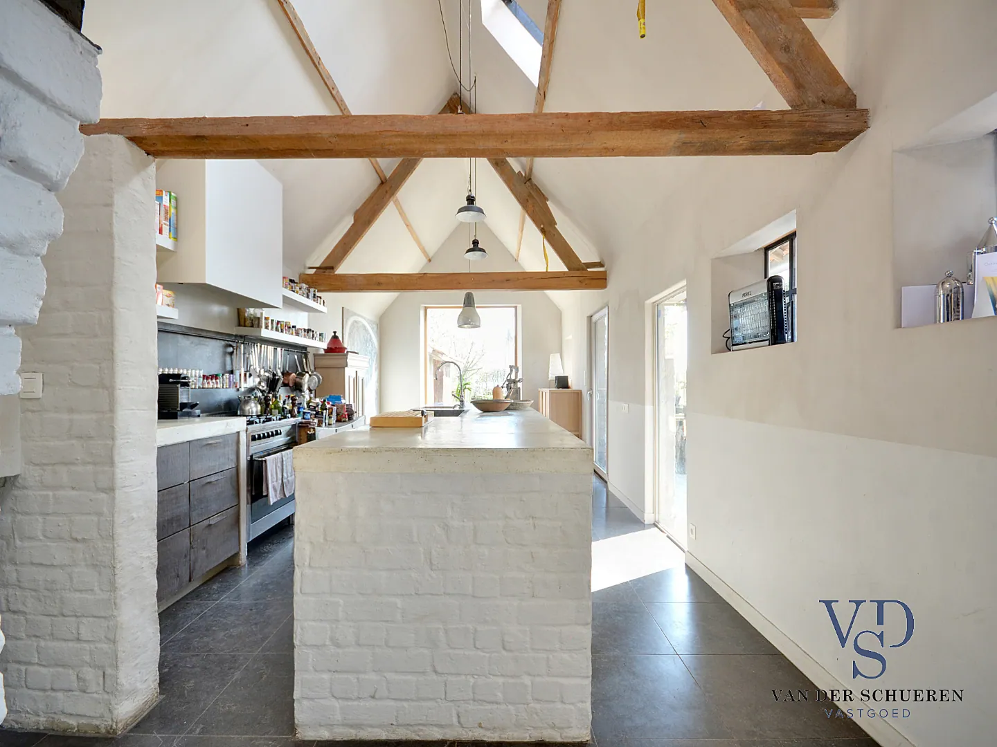 De ruime, bijzonder aangename leef- en zitruimte sluit aan op de thans als bureau ingerichte voute-kamer (met mortex-vloer). De praktische keuken baadt eveneens in stijl en licht. Deze huisstijl vinden we ook in tuin en terras terug.