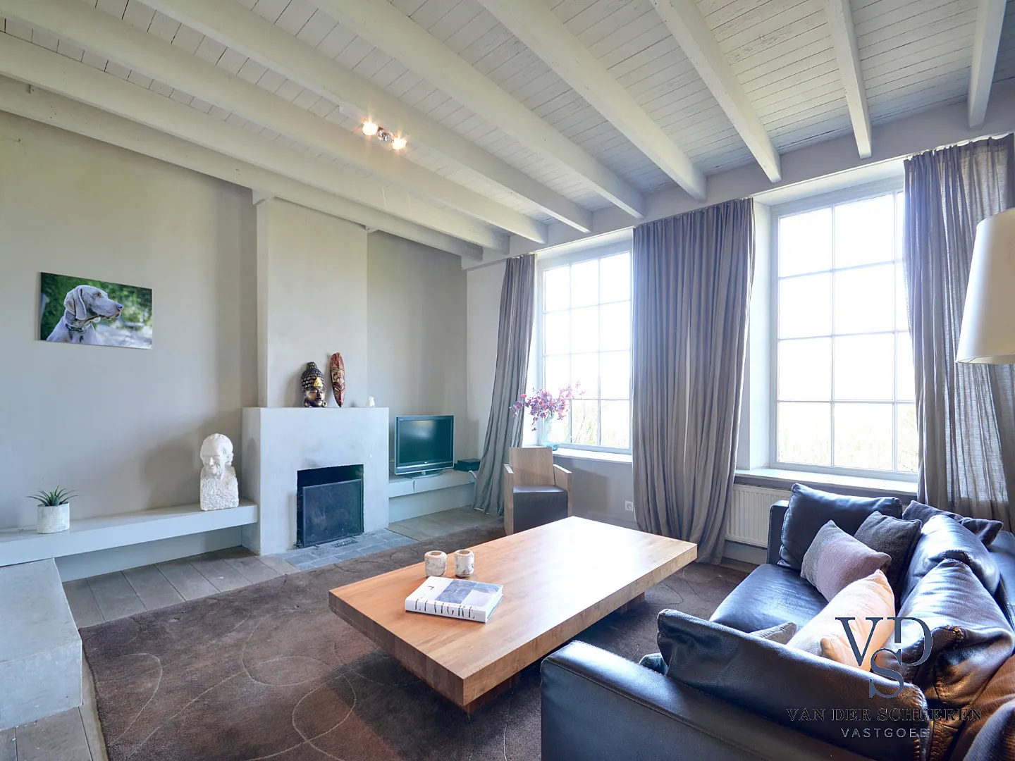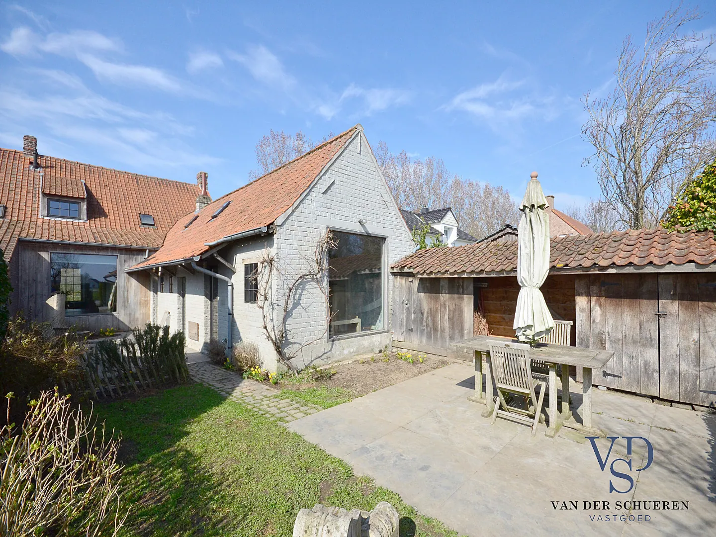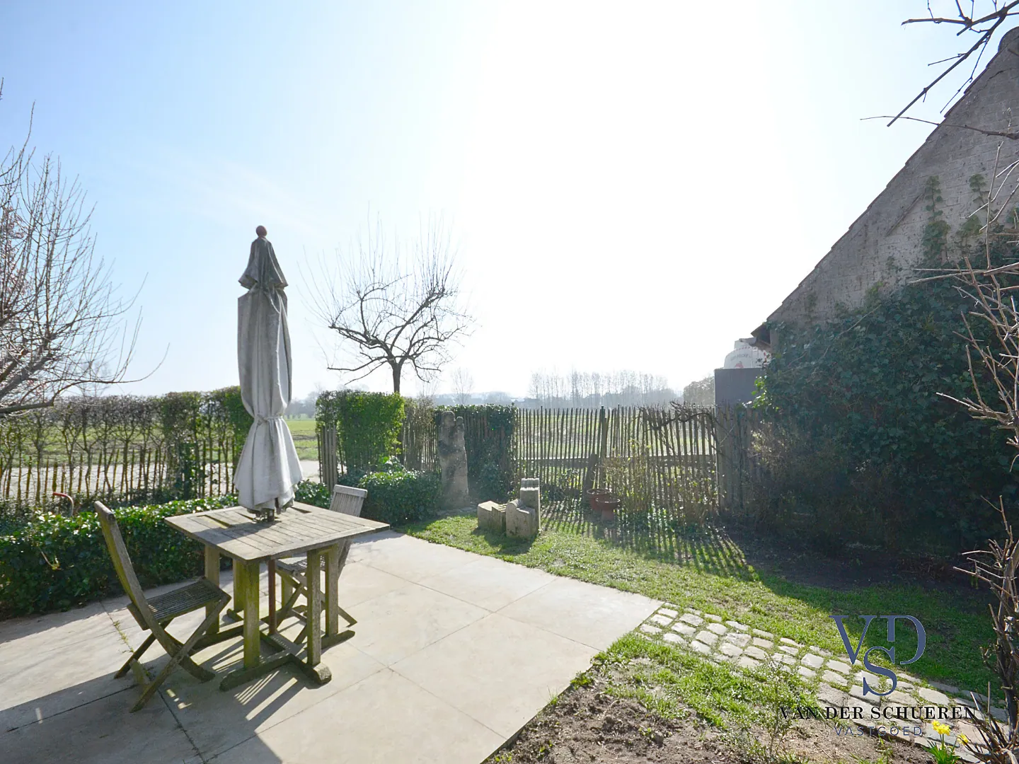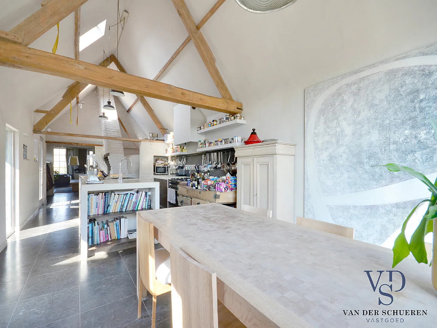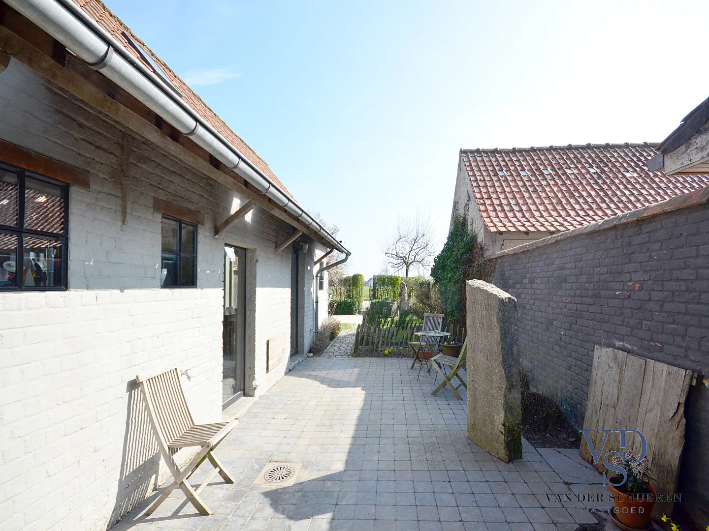 De ruime, bijzonder aangename leef- en zitruimte sluit aan op de thans als bureau ingerichte voute-kamer (met mortex-vloer). De praktische keuken baadt eveneens in stijl en licht. Deze huisstijl vinden we ook in tuin en terras terug.