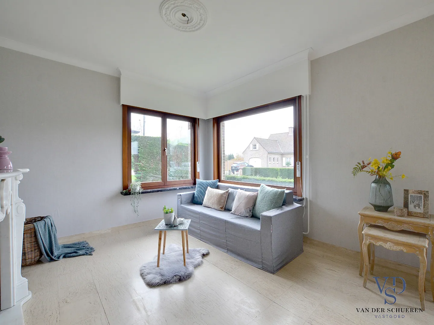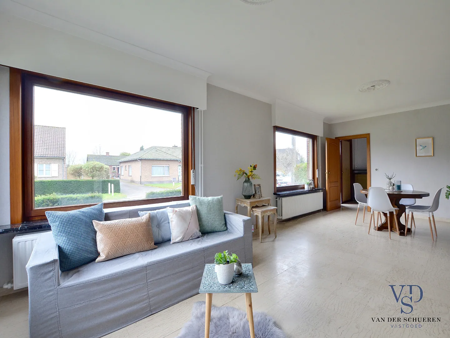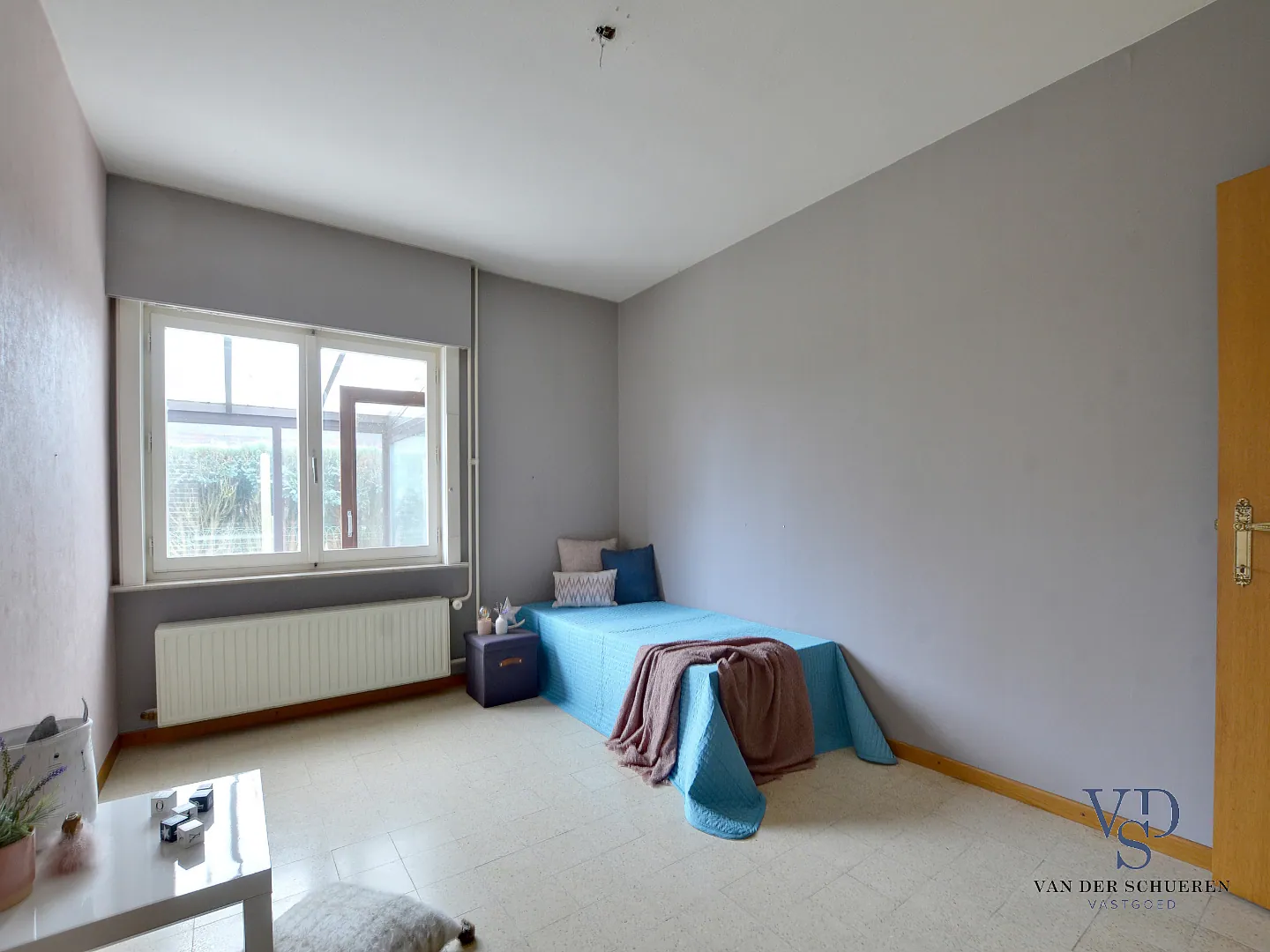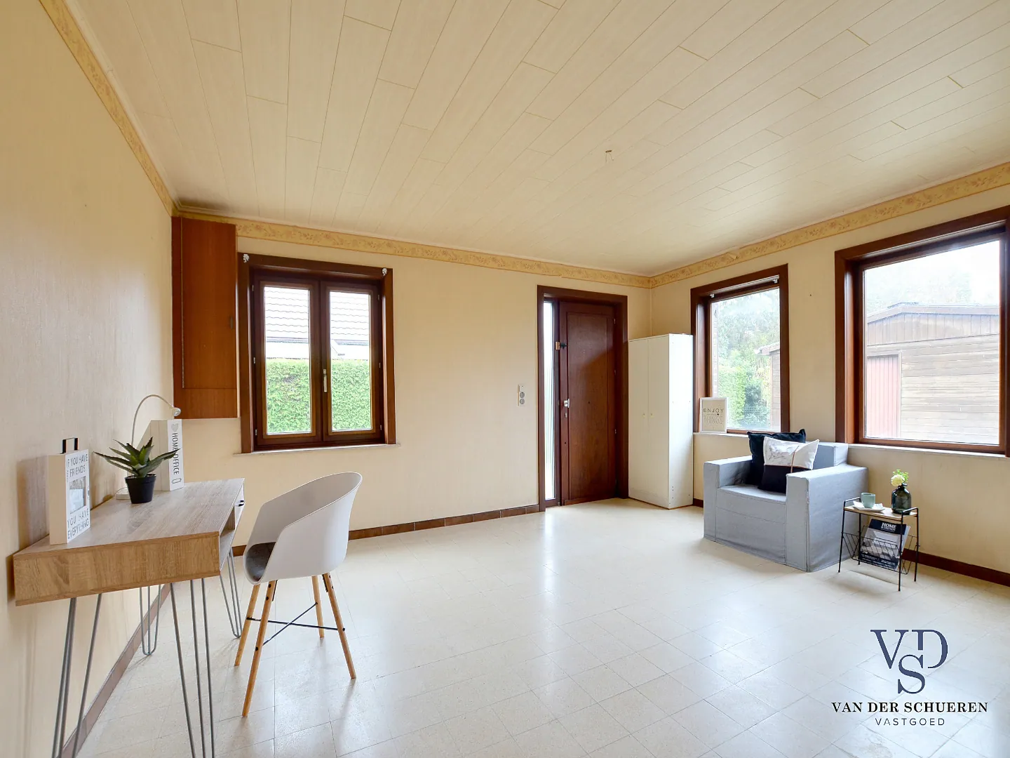 Deze woning is op het gelijkvloers voorzien van een inkomhal, ruime leefruimte, afzonderlijke keuken, badkamer, 2 slaapkamers, bureel (slaapkamer), berg/wasruimte en lichtrijke veranda.