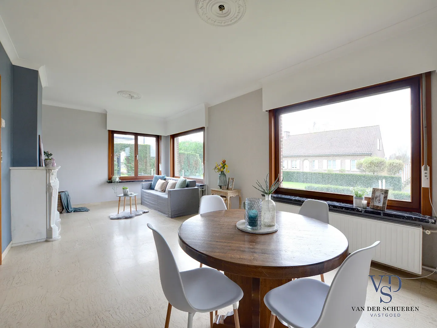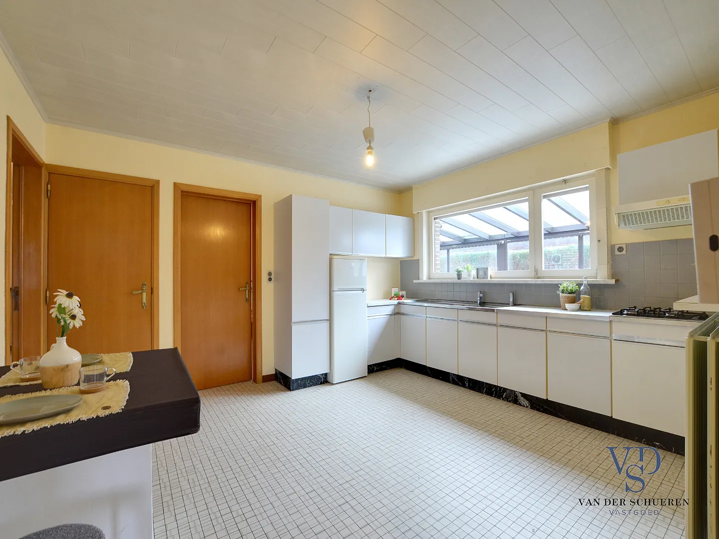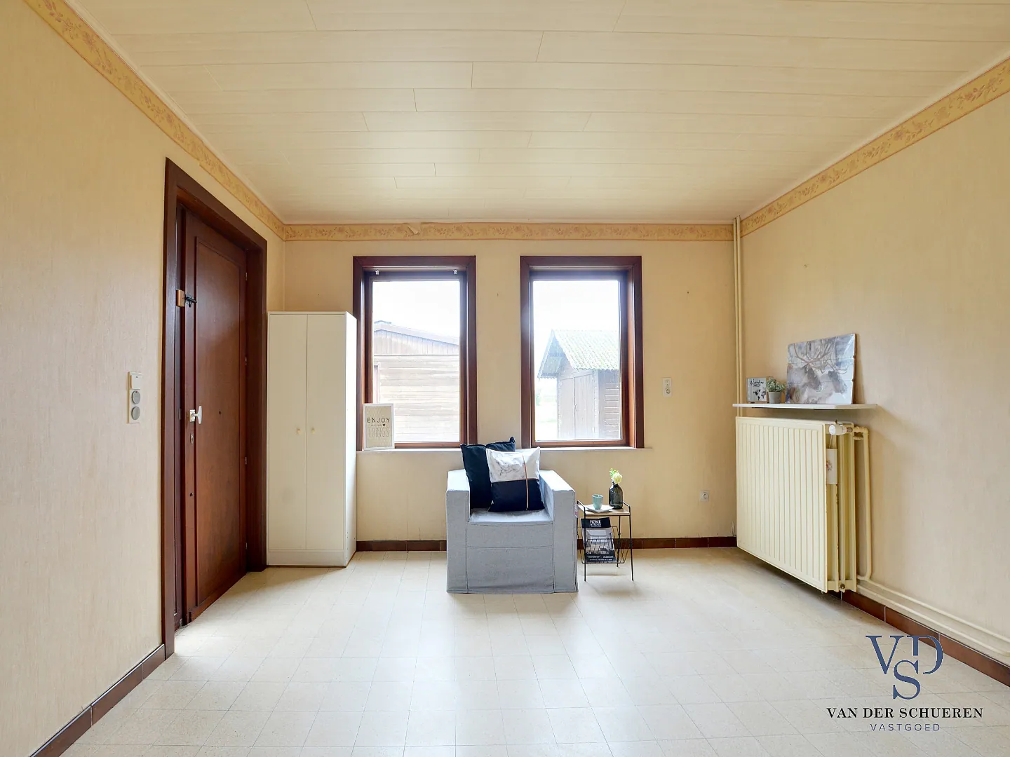 Deze woning is op het gelijkvloers voorzien van een inkomhal, ruime leefruimte, afzonderlijke keuken, badkamer, 2 slaapkamers, bureel (slaapkamer), berg/wasruimte en lichtrijke veranda.