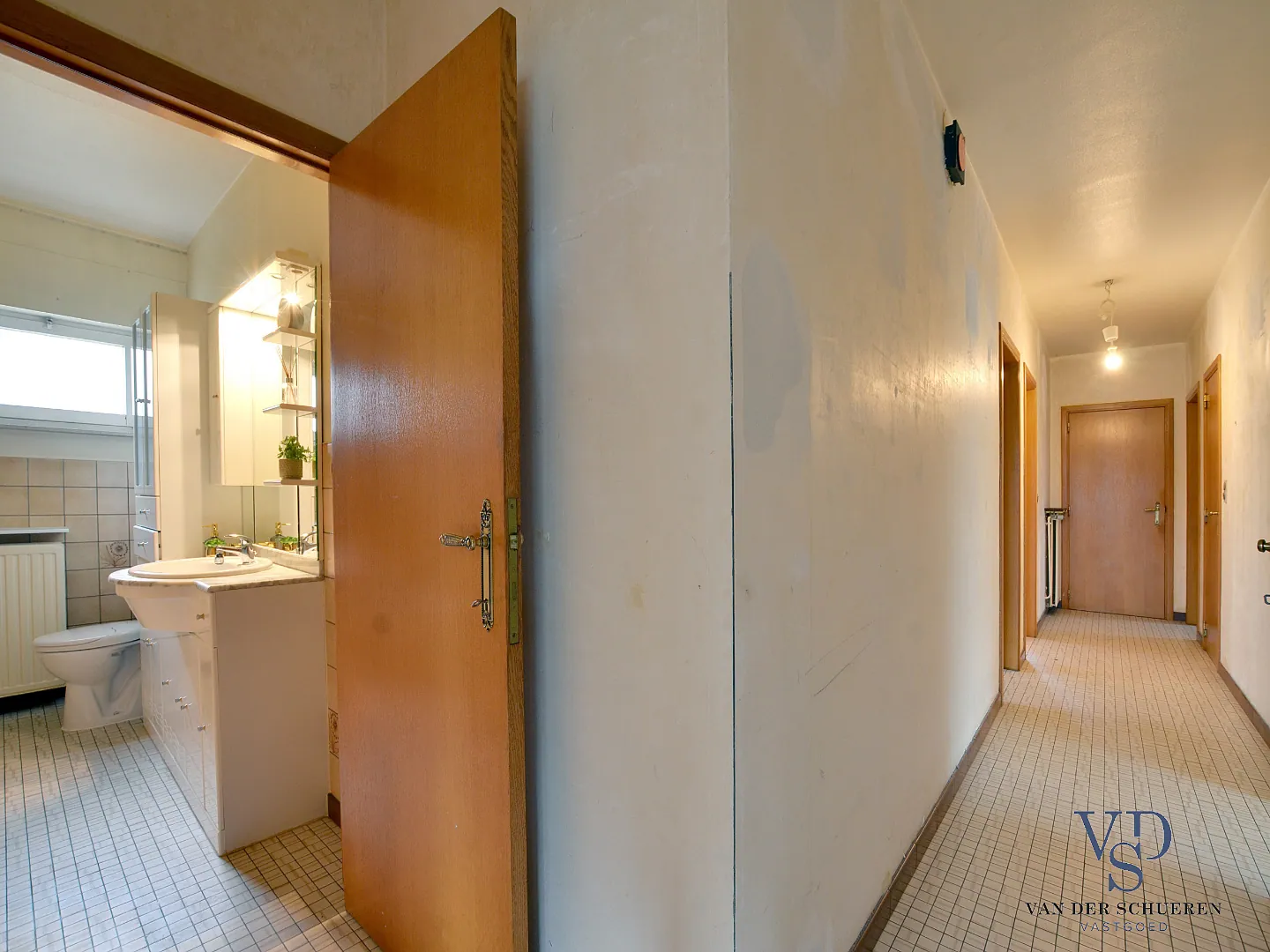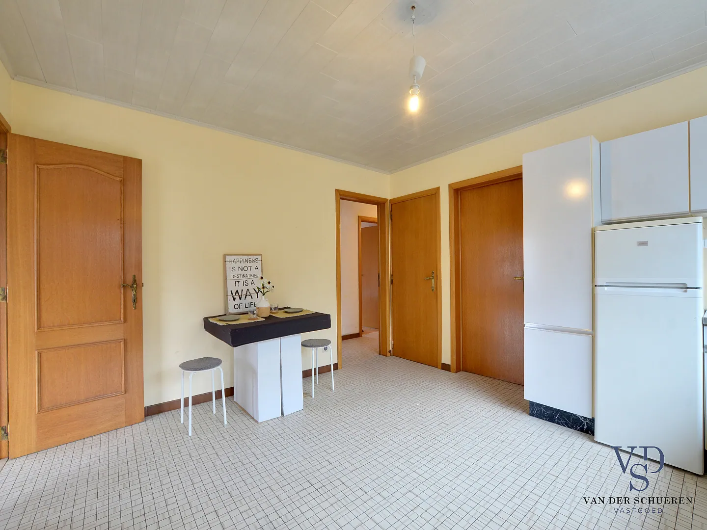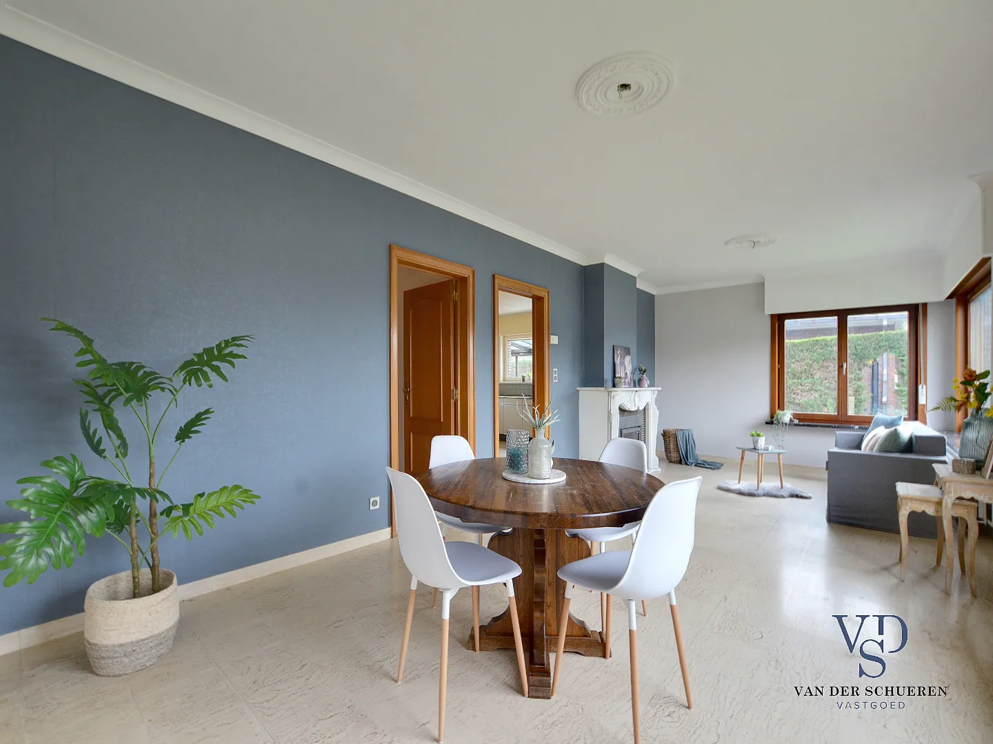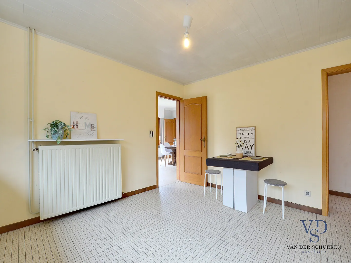 Deze woning is op het gelijkvloers voorzien van een inkomhal, ruime leefruimte, afzonderlijke keuken, badkamer, 2 slaapkamers, bureel (slaapkamer), berg/wasruimte en lichtrijke veranda.