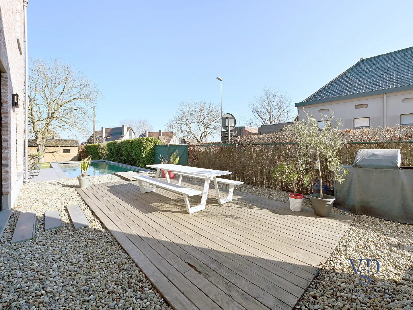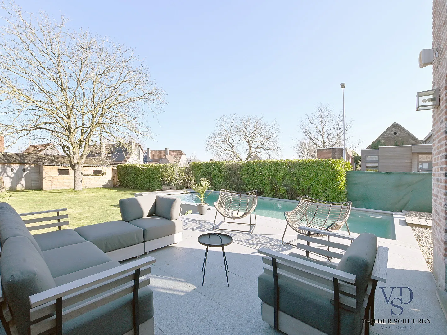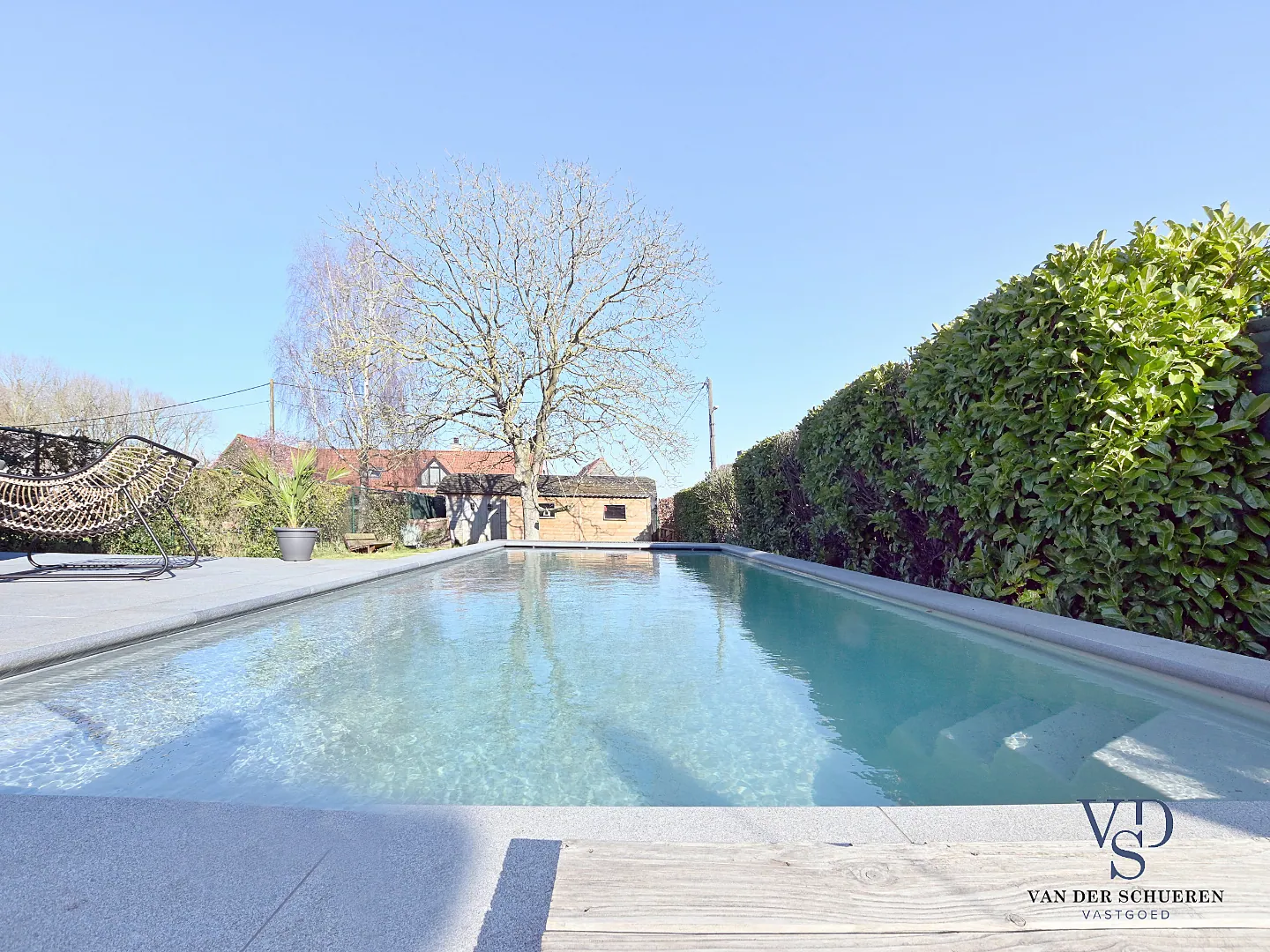 Bijkomend beschikt deze eigendom over een bijzonder aangename tuin met een recent (2 jaar) aangelegd zwembad (met warmtepomp; variërende diepte van 1,5 tot 1,8 m), alsook een stijlvol tuinhuis en garage.