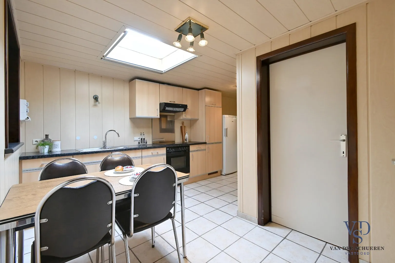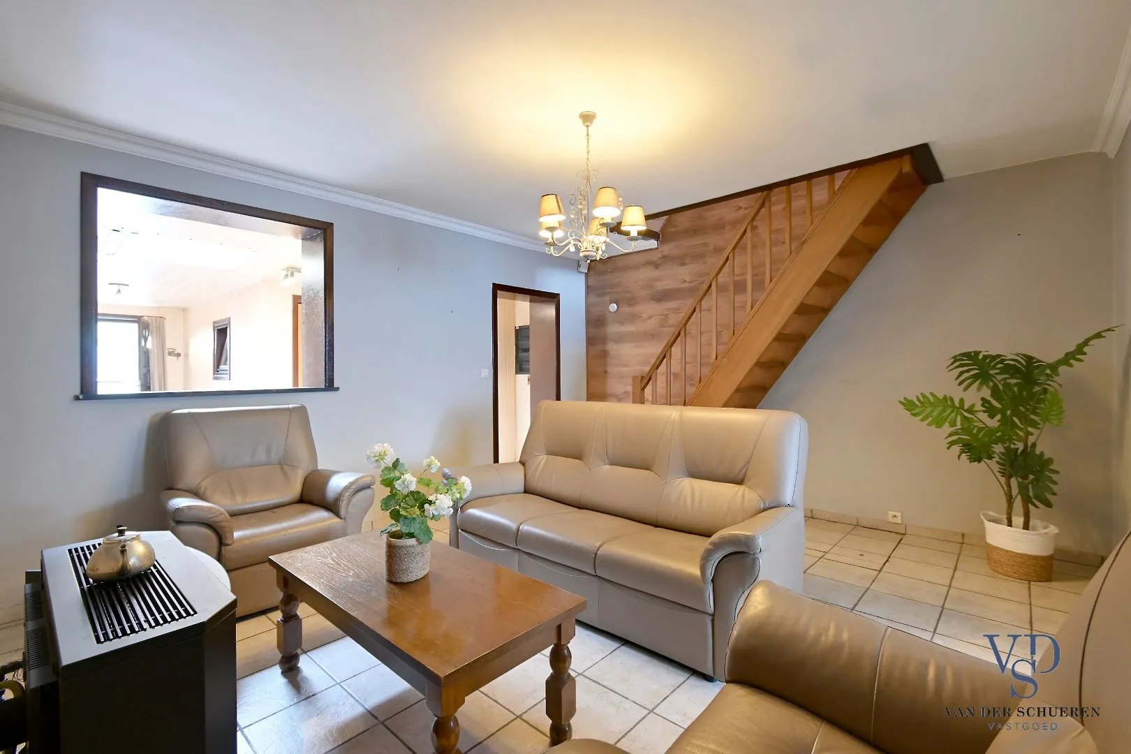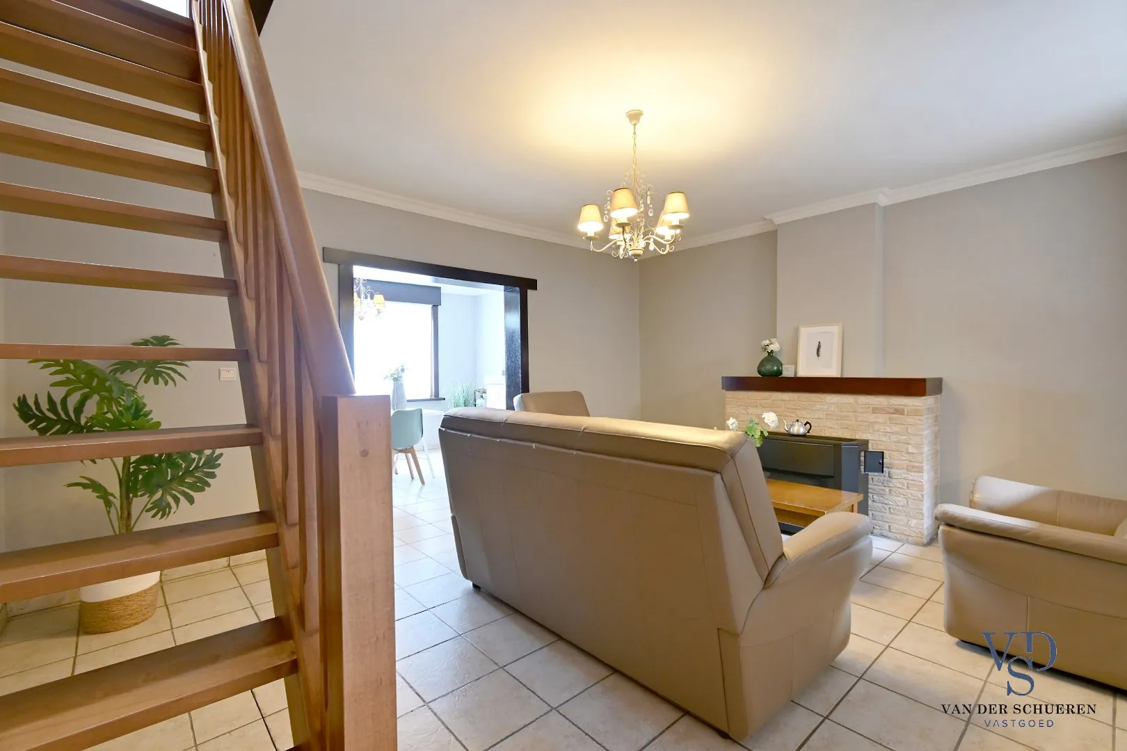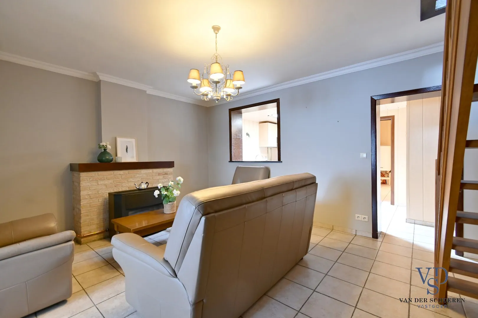 Het gelijkvloers omvat een ruime leefruimte met aansluitend een ruime keuken en een praktische badkamer.
