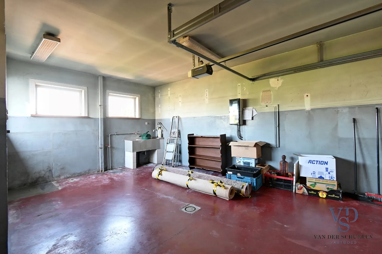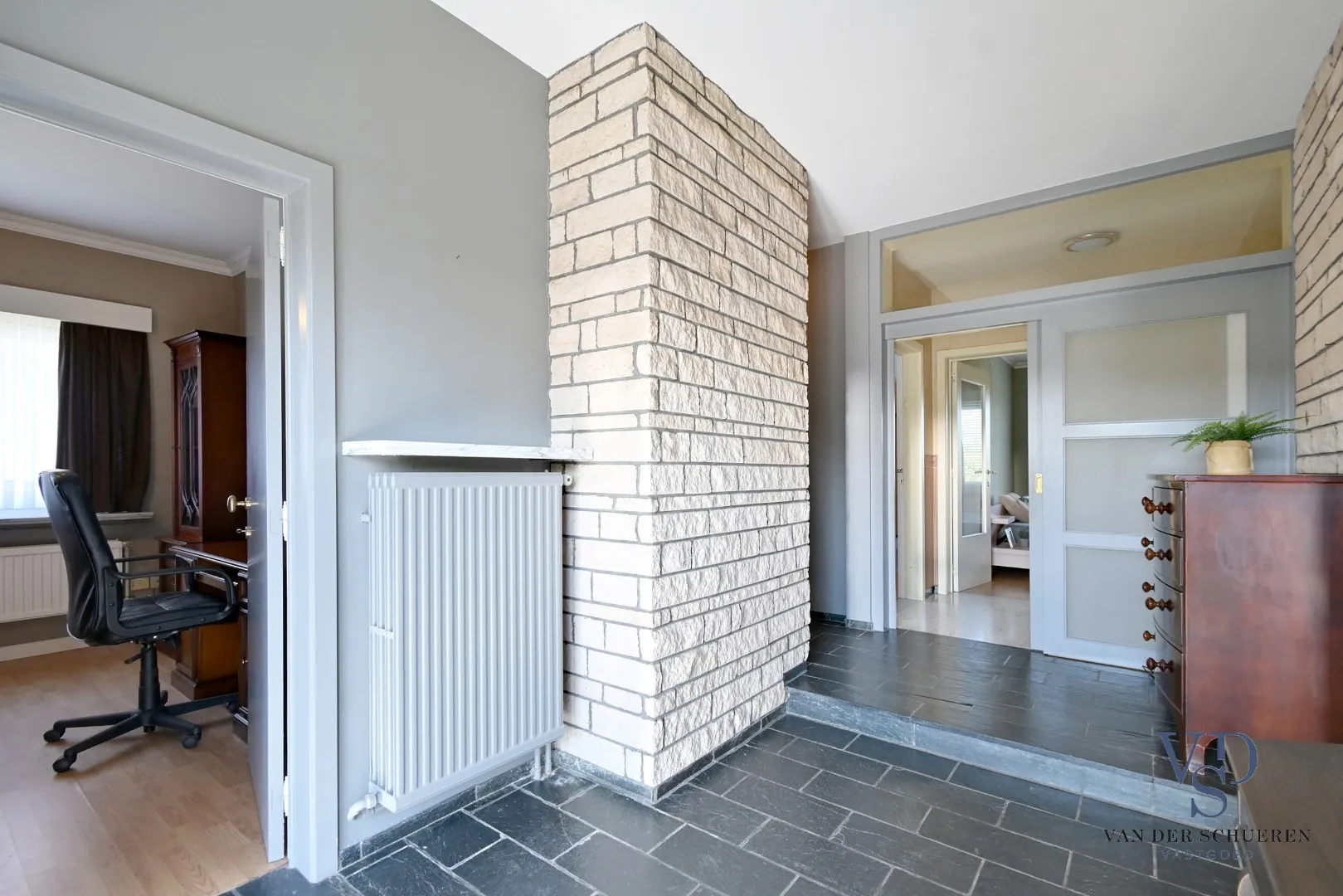 Bij het binnenwandelen treffen we o.a. een lichtrijke inkomhal, een ruime leefruimte, een afzonderlijke keuken met aanpalende berging, een bureel, een badkamer, twee slaapkamers, een inpandige garage en een afzonderlijk toilet. Bij het doorlopen komen we terecht in een tweede bureel (multifunctionele ruimte), een slaapkamer, een leefruimte, een afzonderlijke keuken, een badkamer en een apart toilet.