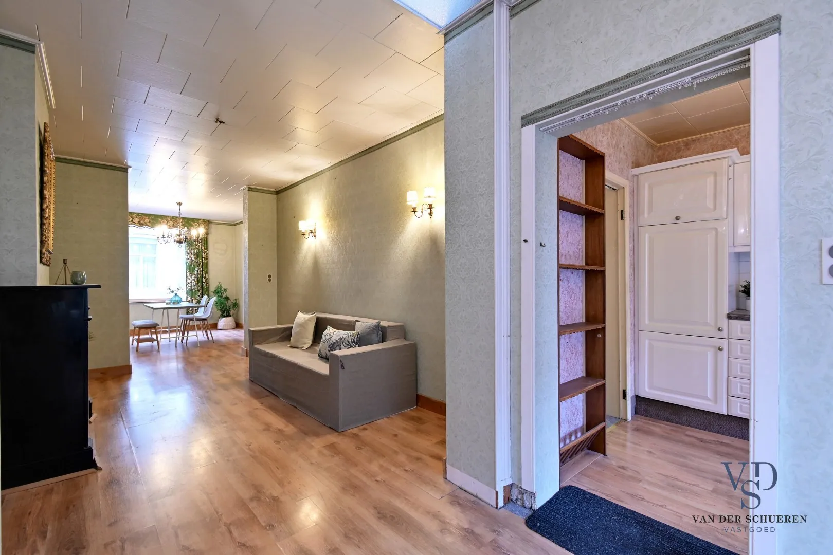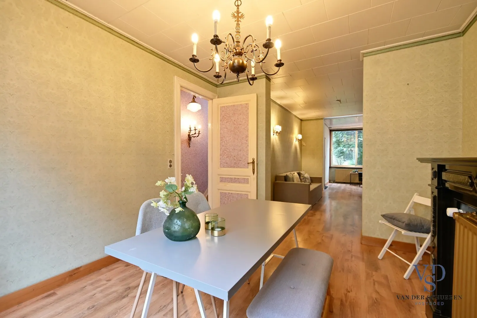 De aangename, statige inkomhal geeft toegang tot de ruime leefruimte en afzonderlijke keuken. De 2 verdiepingen tellen samen 3 slaapkamers en een badkamer.