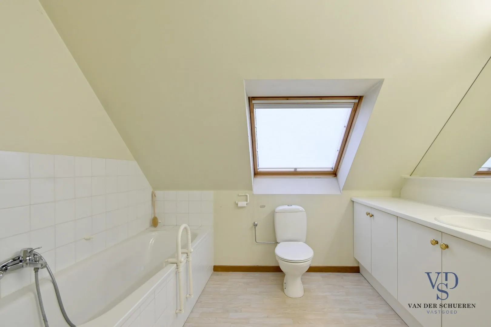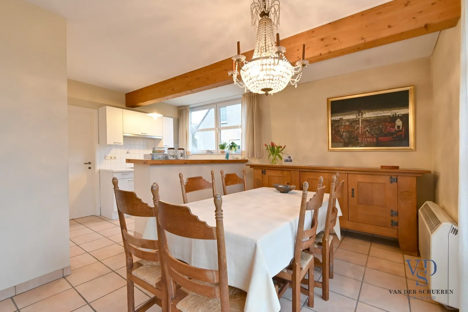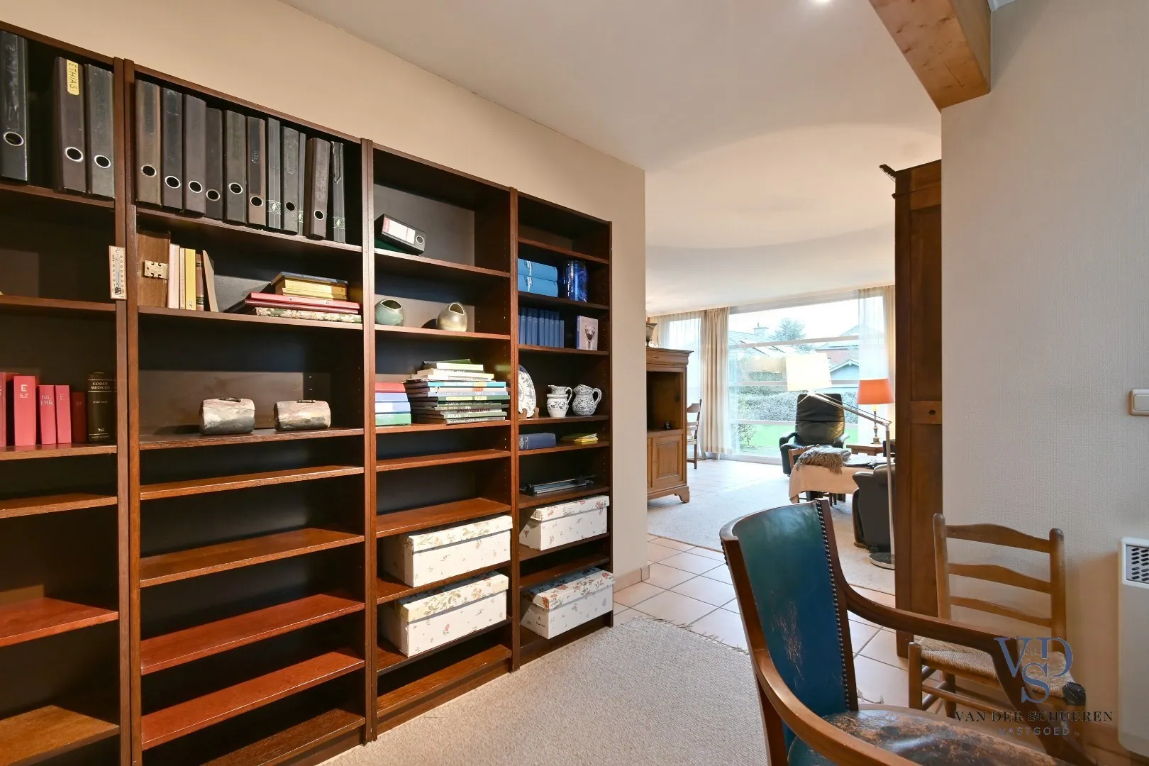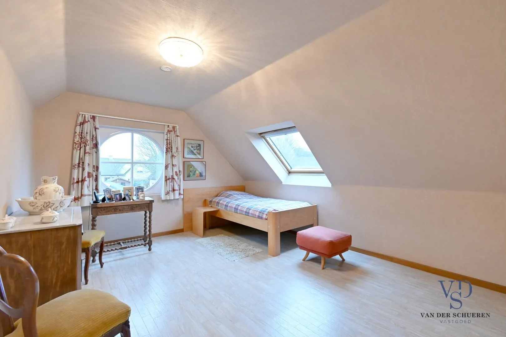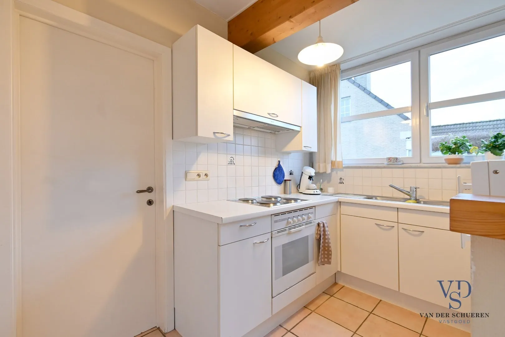 De woning beschikt over een praktische indeling: het gelijkvloers is voorzien van een aangename inkomhal met gastentoilet, ruime leefruimte met geïntegreerd bureel, open keuken en afzonderlijke berging. De verdieping telt vervolgens twee ruime slaapkamers (waarvan één met aansluitende berging), een nachthal voorzien van ingemaakte kasten en badkamer.