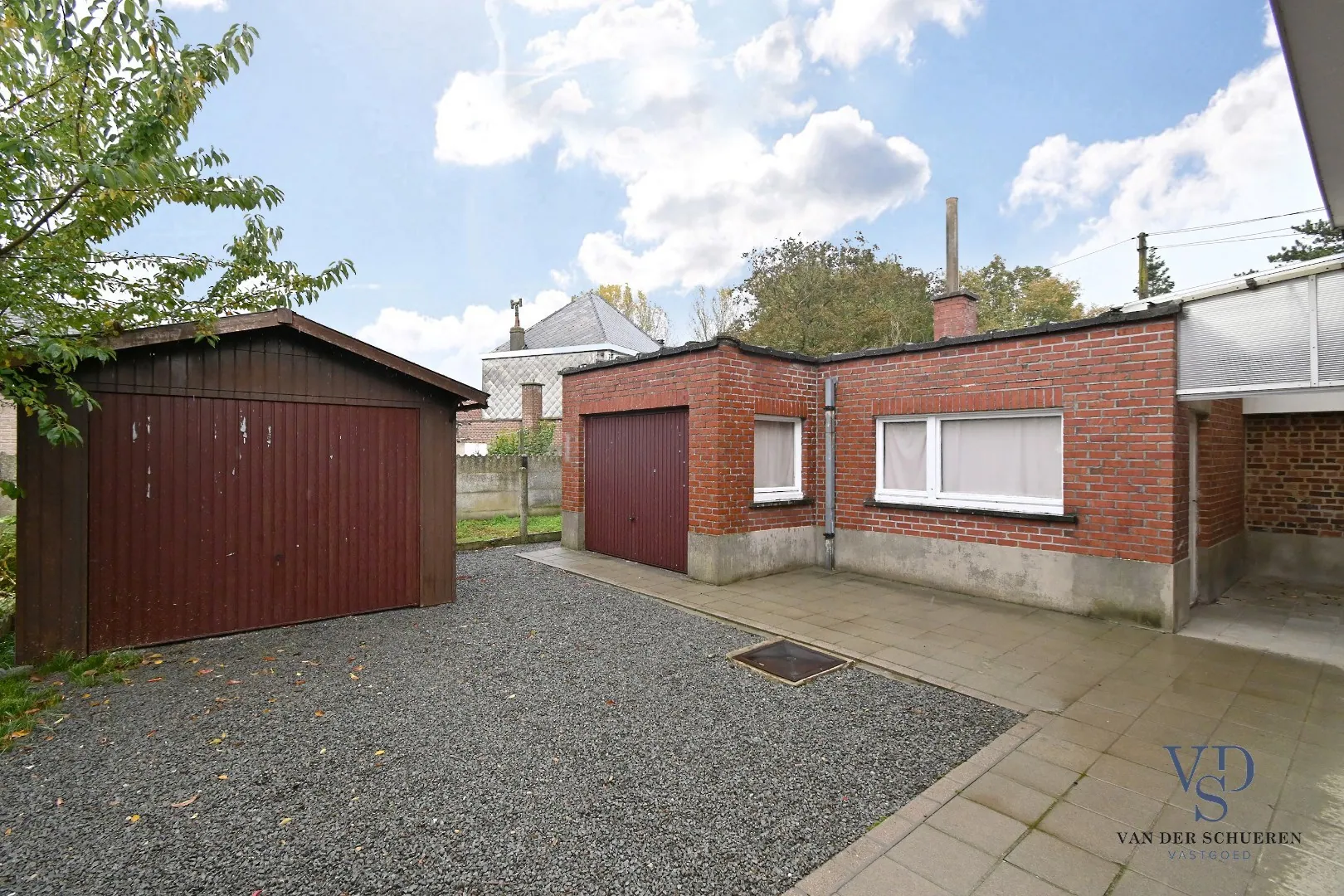 Buiten is er een terras met tuin en 2 garages. De eerste garage met plaats voor een auto, fietsen en extra bergruimte; de tweede garage met plaats voor een wagen.