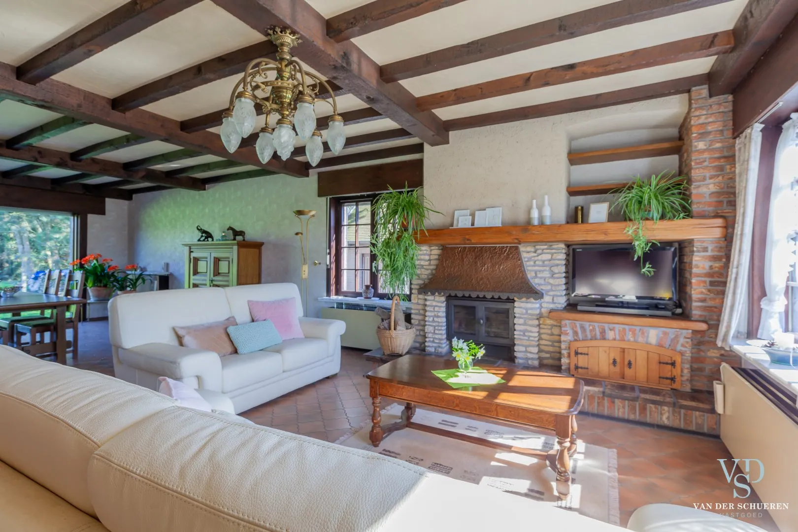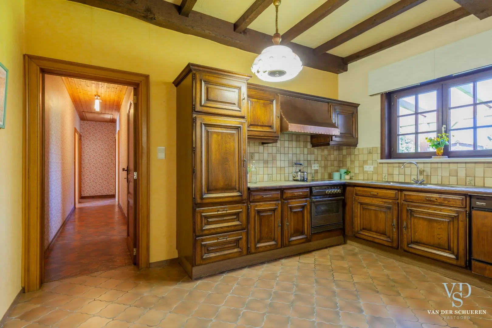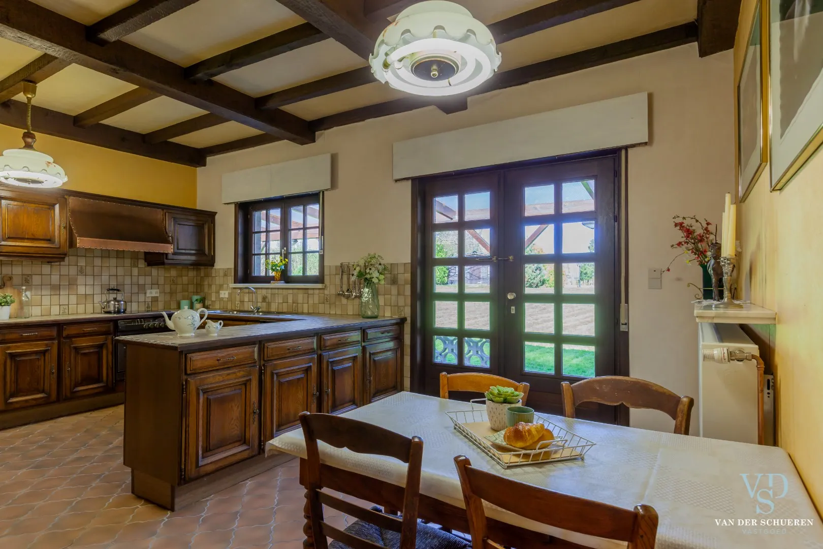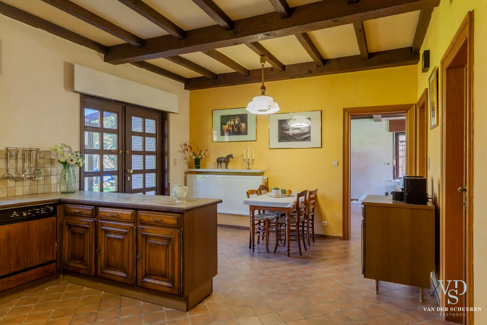 Deze in Letterhoutem gelegen eigendom beschikt o.a. over een stijlvolle inkomhal met gastentoilet die enerzijds toegang biedt tot het bureel en anderzijds tot de ruime, lichtrijke living (met open haard) en de landelijke keuken die in rechtstreekse verbinding staat met het terras en de tuin.