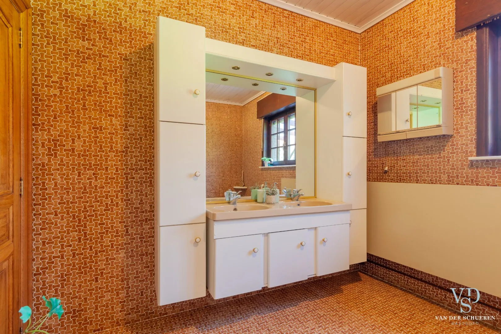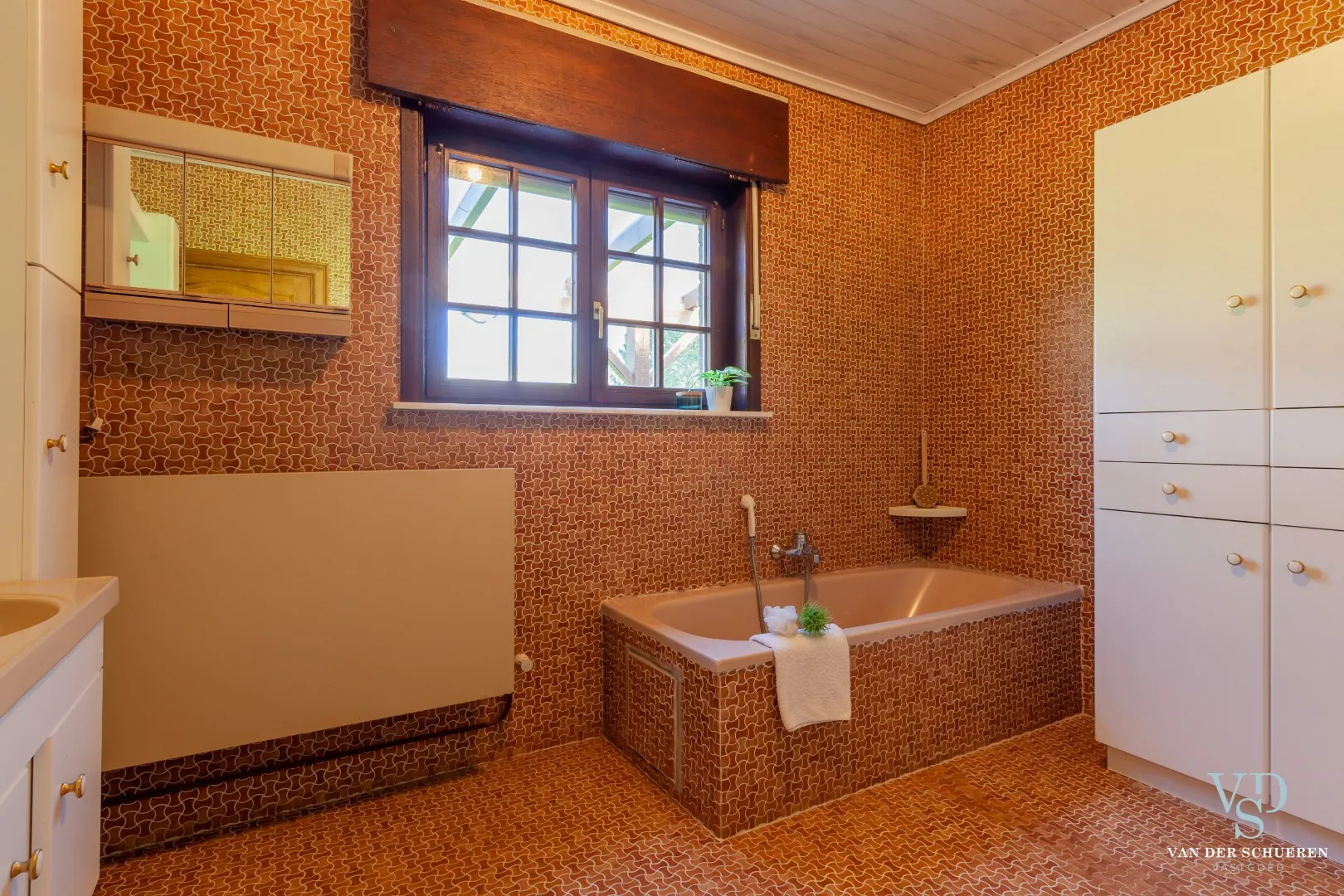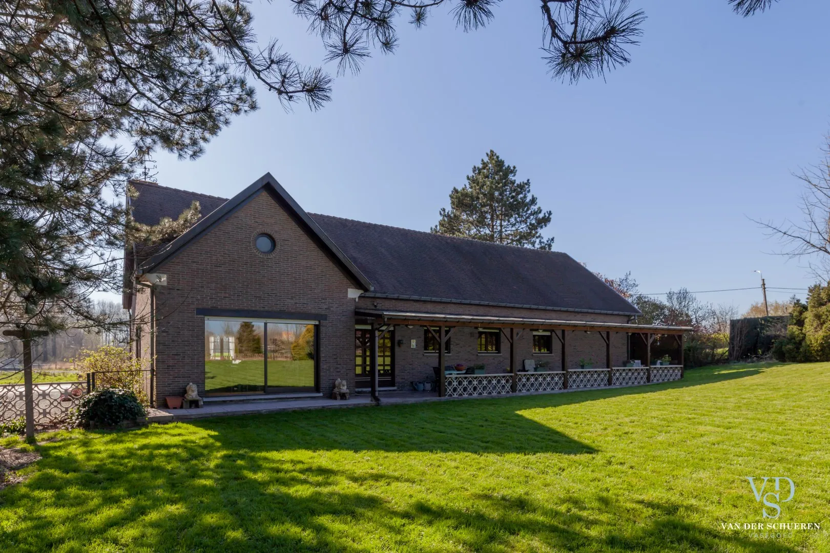Deze in Letterhoutem gelegen eigendom beschikt o.a. over een stijlvolle inkomhal met gastentoilet die enerzijds toegang biedt tot het bureel en anderzijds tot de ruime, lichtrijke living (met open haard) en de landelijke keuken die in rechtstreekse verbinding staat met het terras en de tuin.