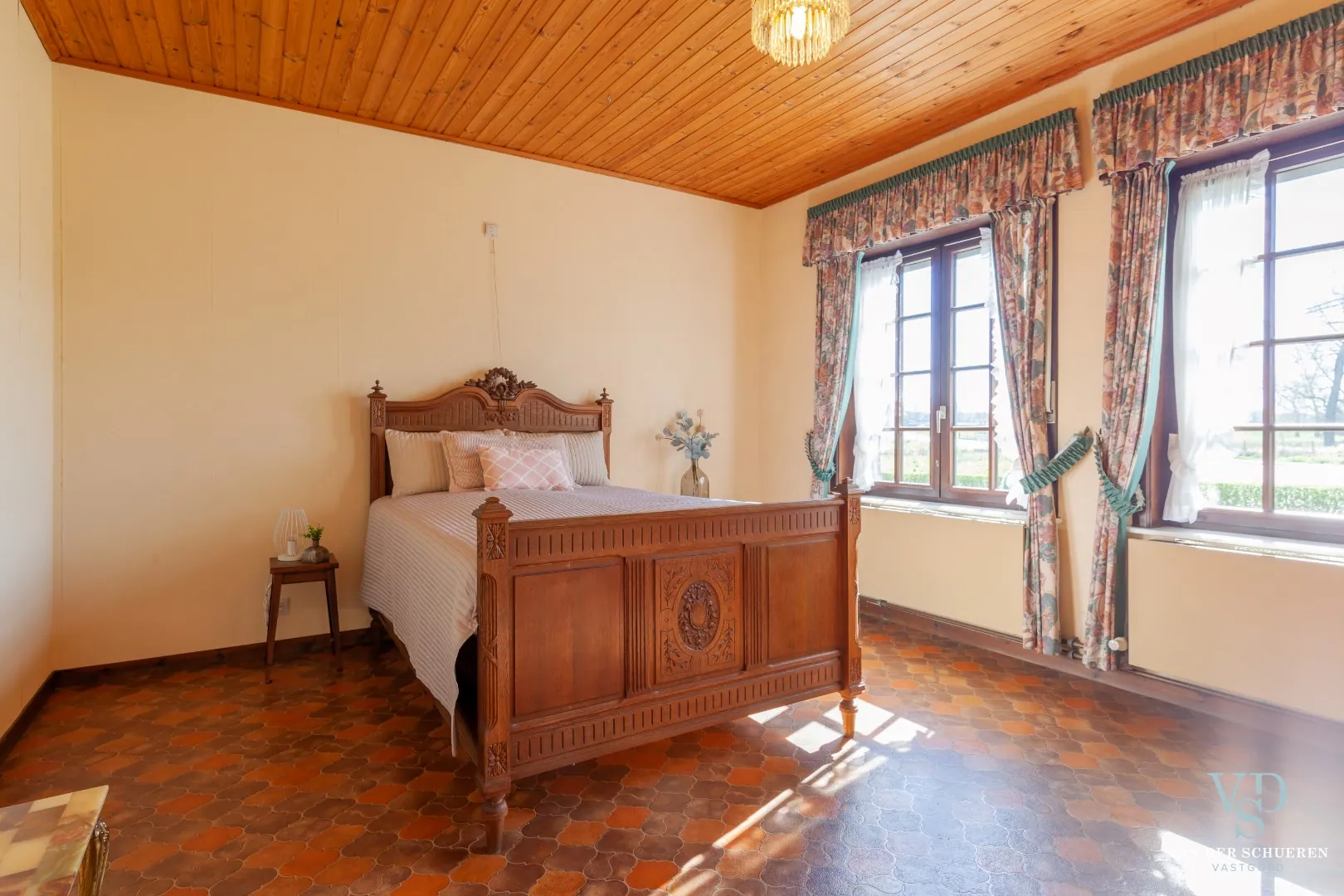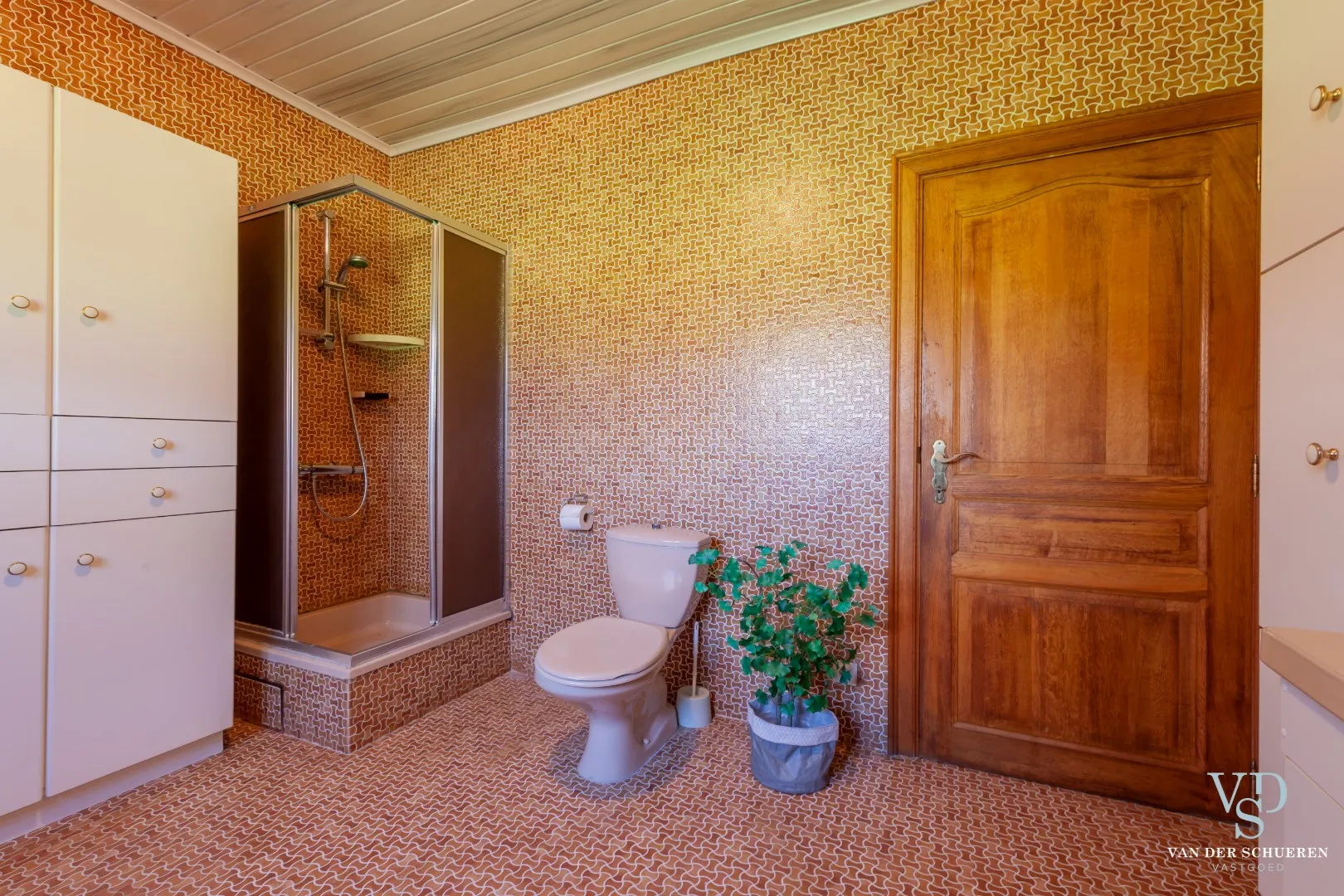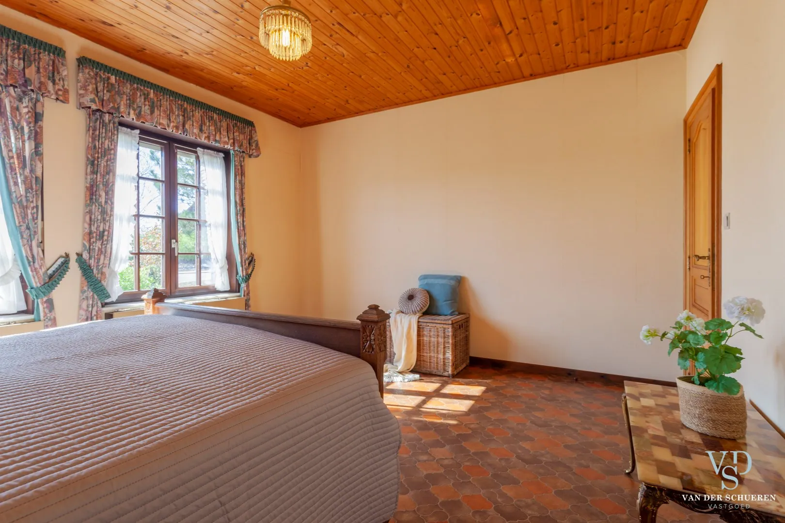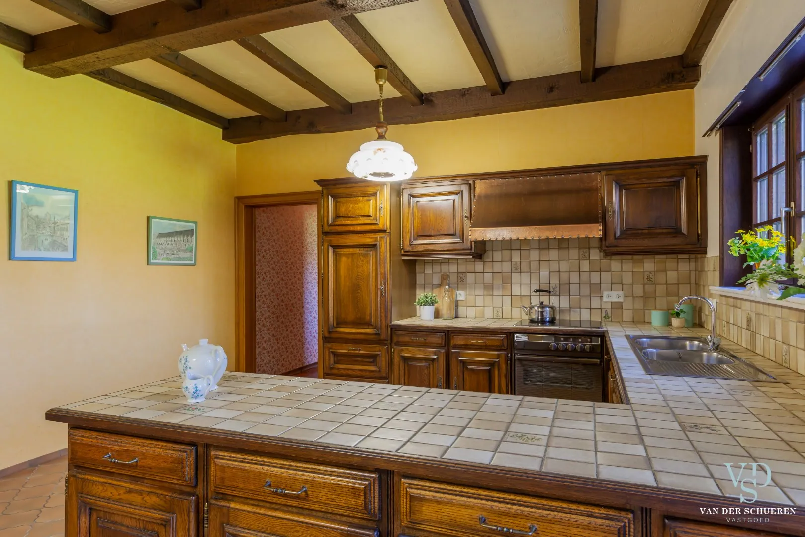 Deze in Letterhoutem gelegen eigendom beschikt o.a. over een stijlvolle inkomhal met gastentoilet die enerzijds toegang biedt tot het bureel en anderzijds tot de ruime, lichtrijke living (met open haard) en de landelijke keuken die in rechtstreekse verbinding staat met het terras en de tuin.