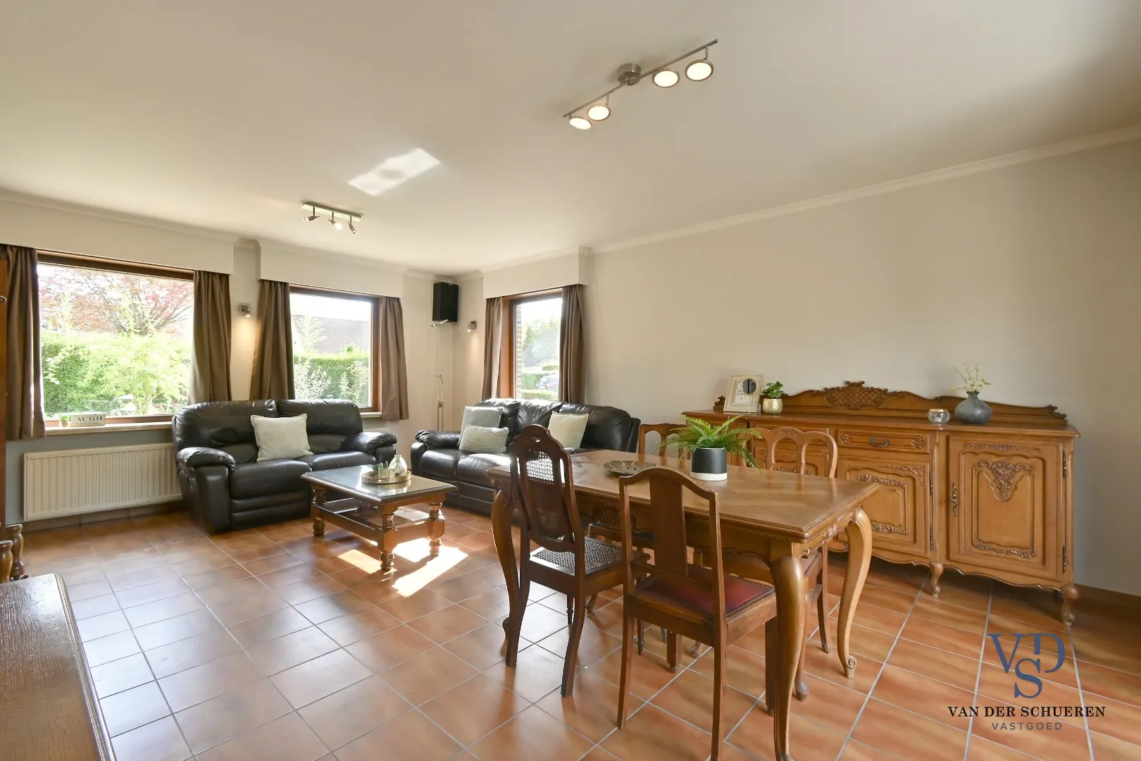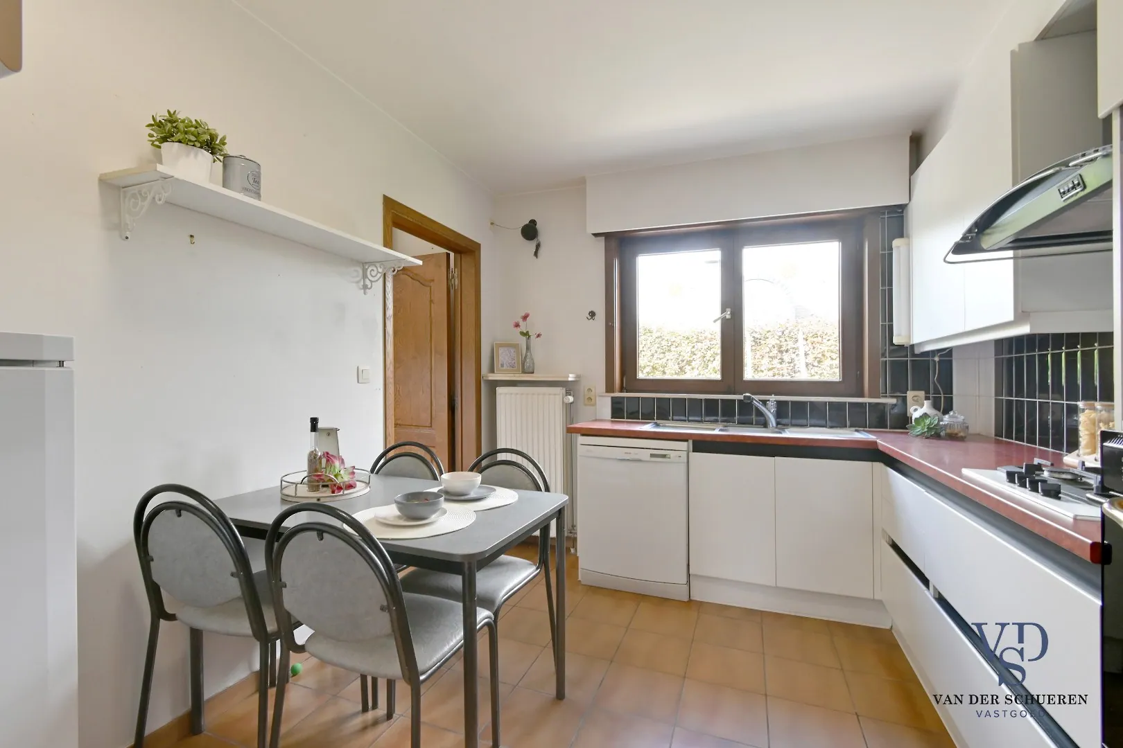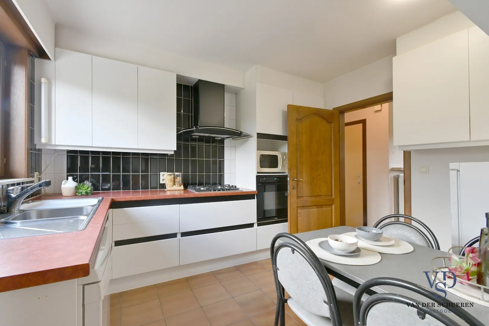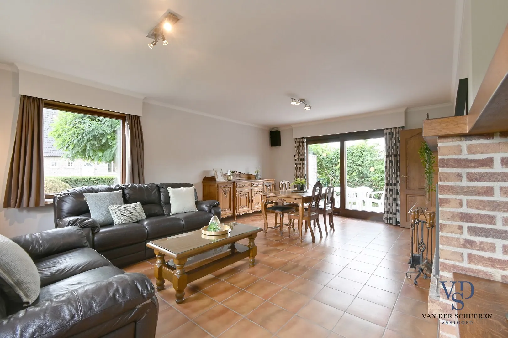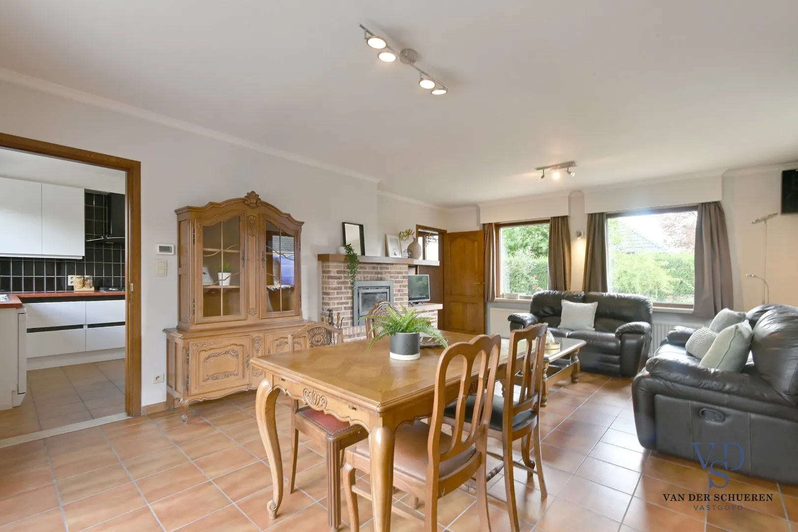 De woning verwelkomt je in een lichtrijke leefruimte die rechtstreeks aansluit op het terras naast de woning – perfect om in alle rust te genieten van de buitenruimte. Daarnaast is er een afzonderlijke keuken.
