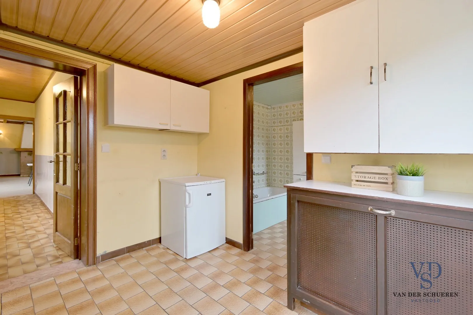 Deze te renoveren woning combineert een centrale ligging met een praktische indeling. Het gelijkvloers omvat een lichtrijke en ruime leefruimte, een afzonderlijke keuken, een praktische wasplaats, een badkamer, een apart toilet en een gelijkvloerse slaapkamer.