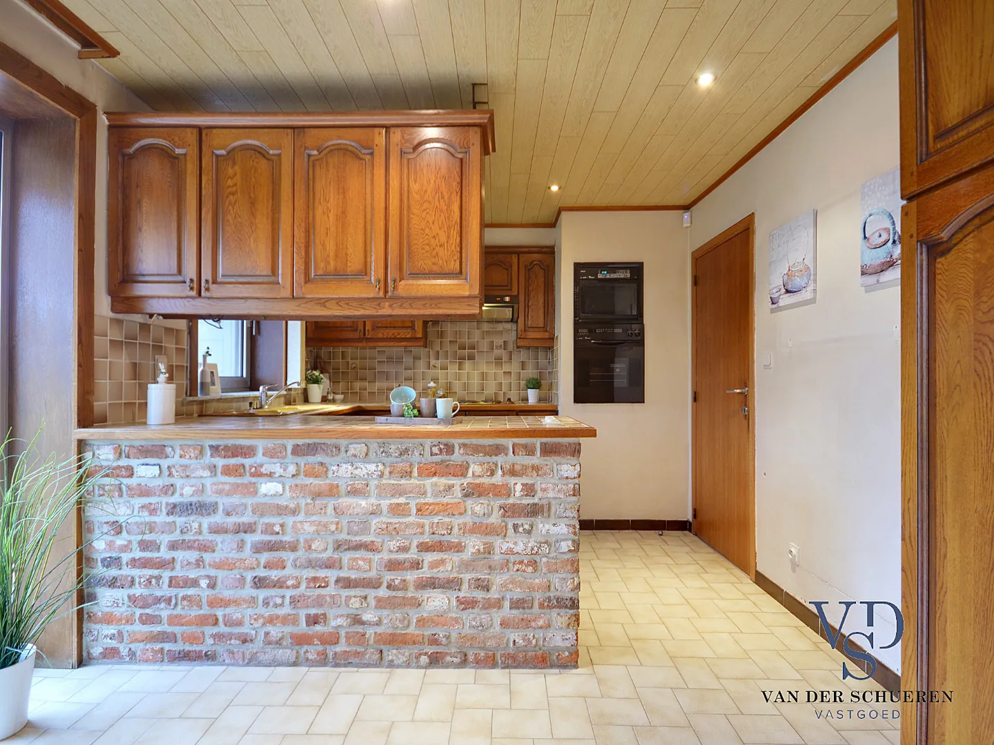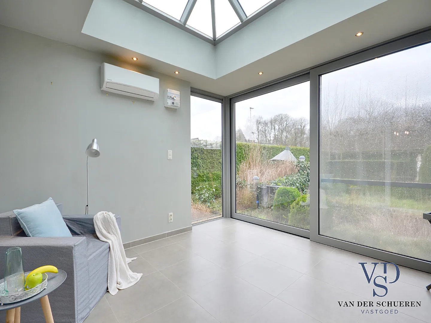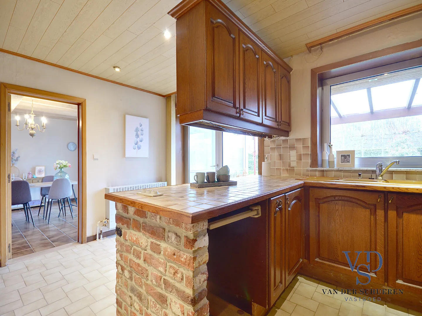 Deze eigendom is op het gelijkvloers voorzien van een ruime leefruimte (met bar) met een aangesloten, recente eigentijdse leefveranda, alsook een praktische keuken.