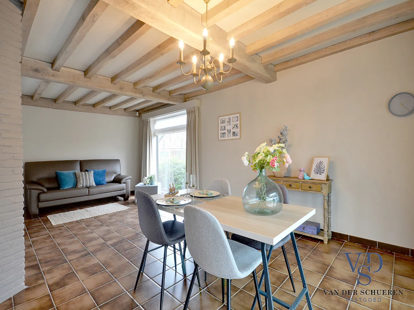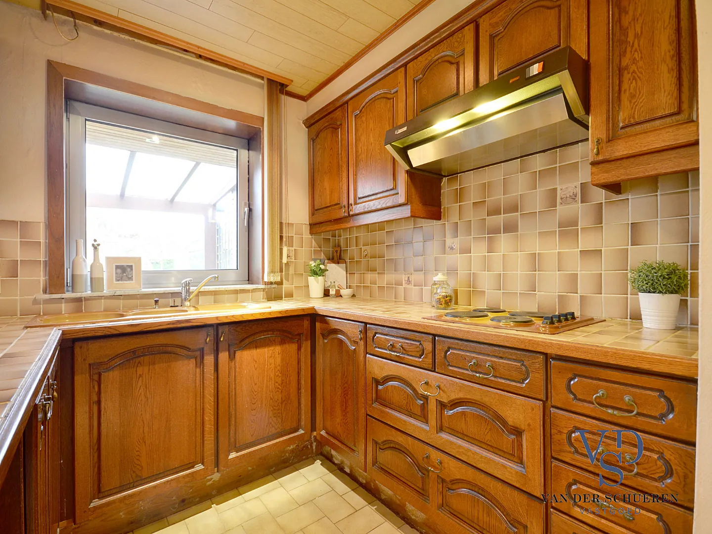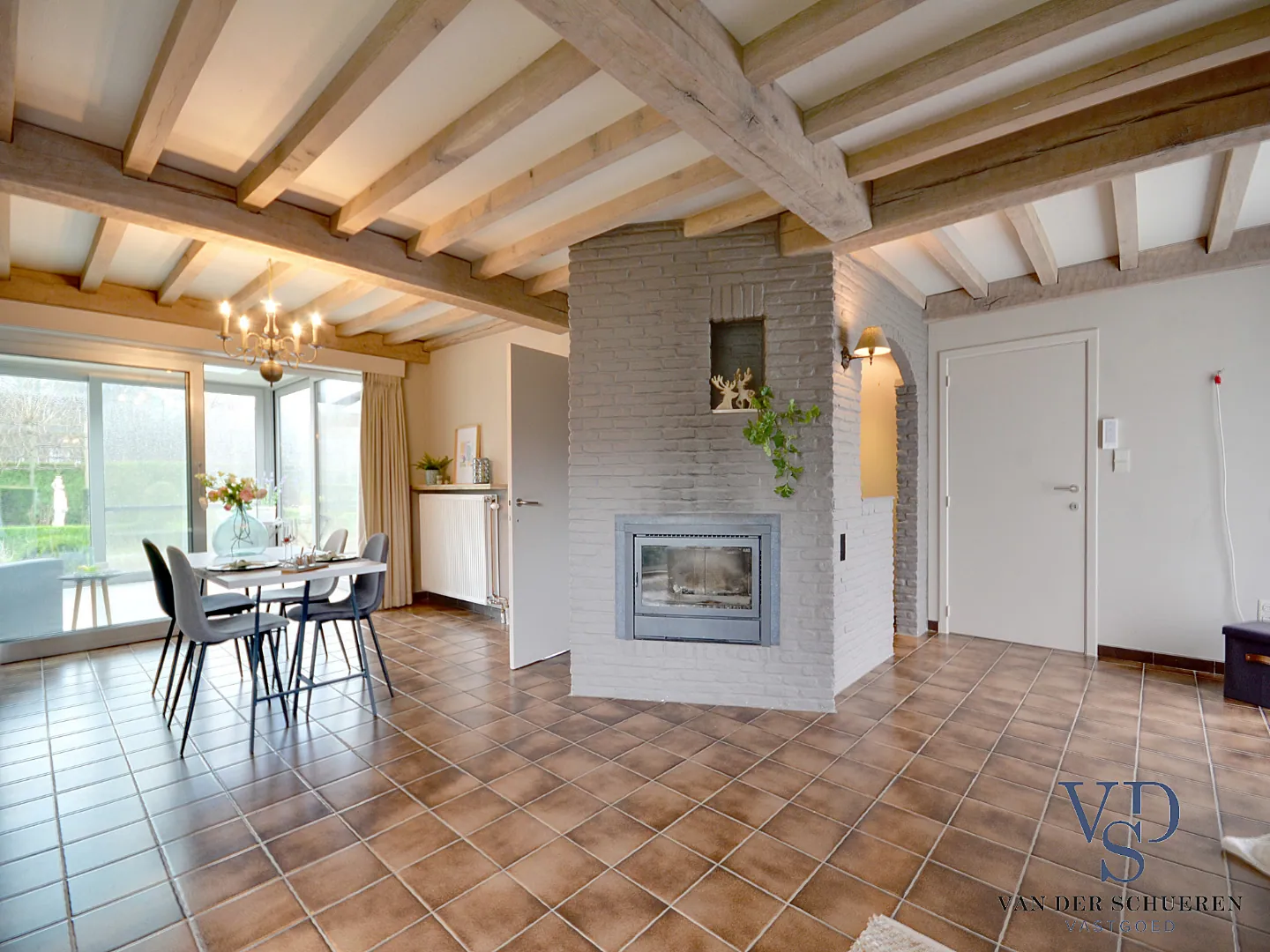 Deze eigendom is op het gelijkvloers voorzien van een ruime leefruimte (met bar) met een aangesloten, recente eigentijdse leefveranda, alsook een praktische keuken.