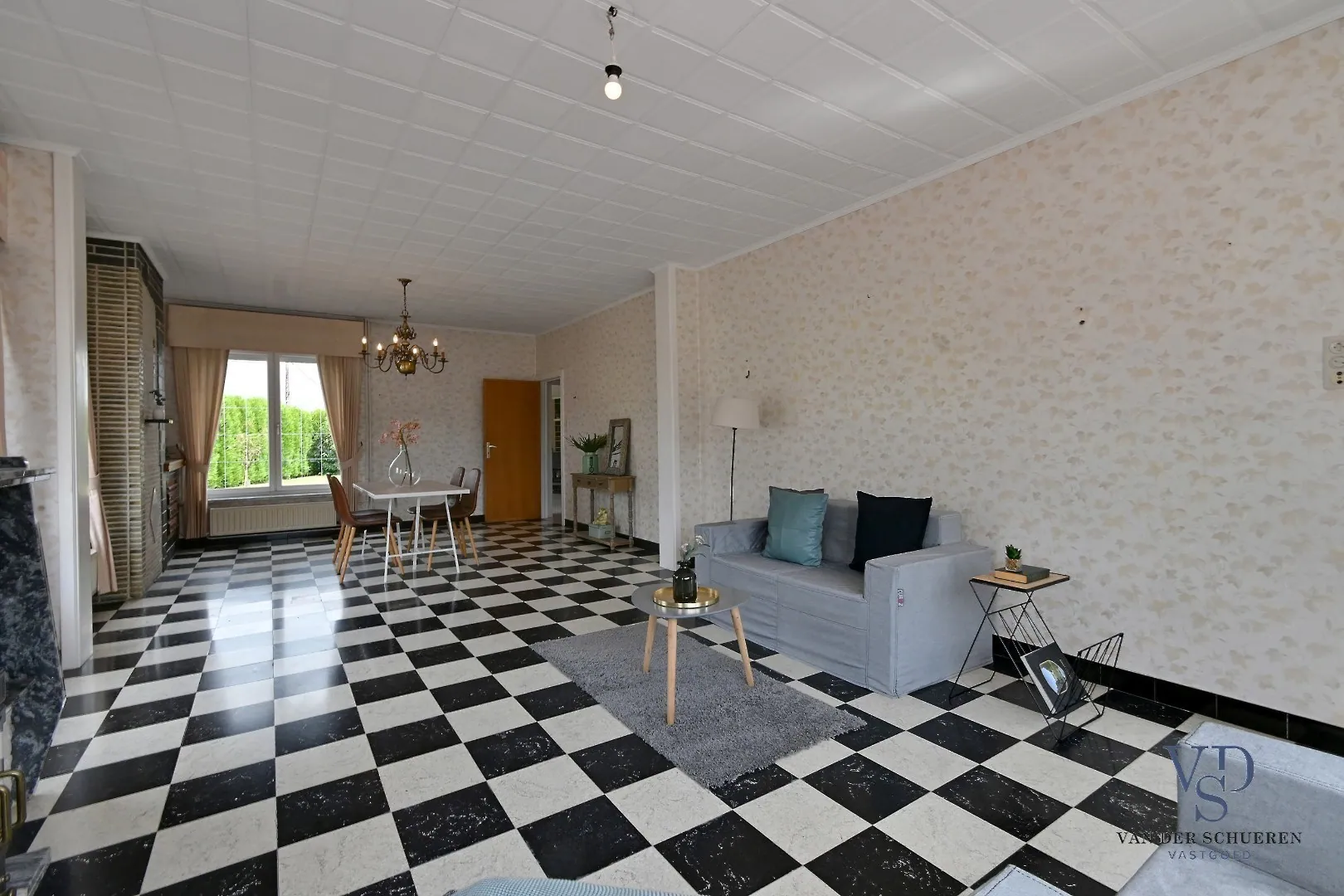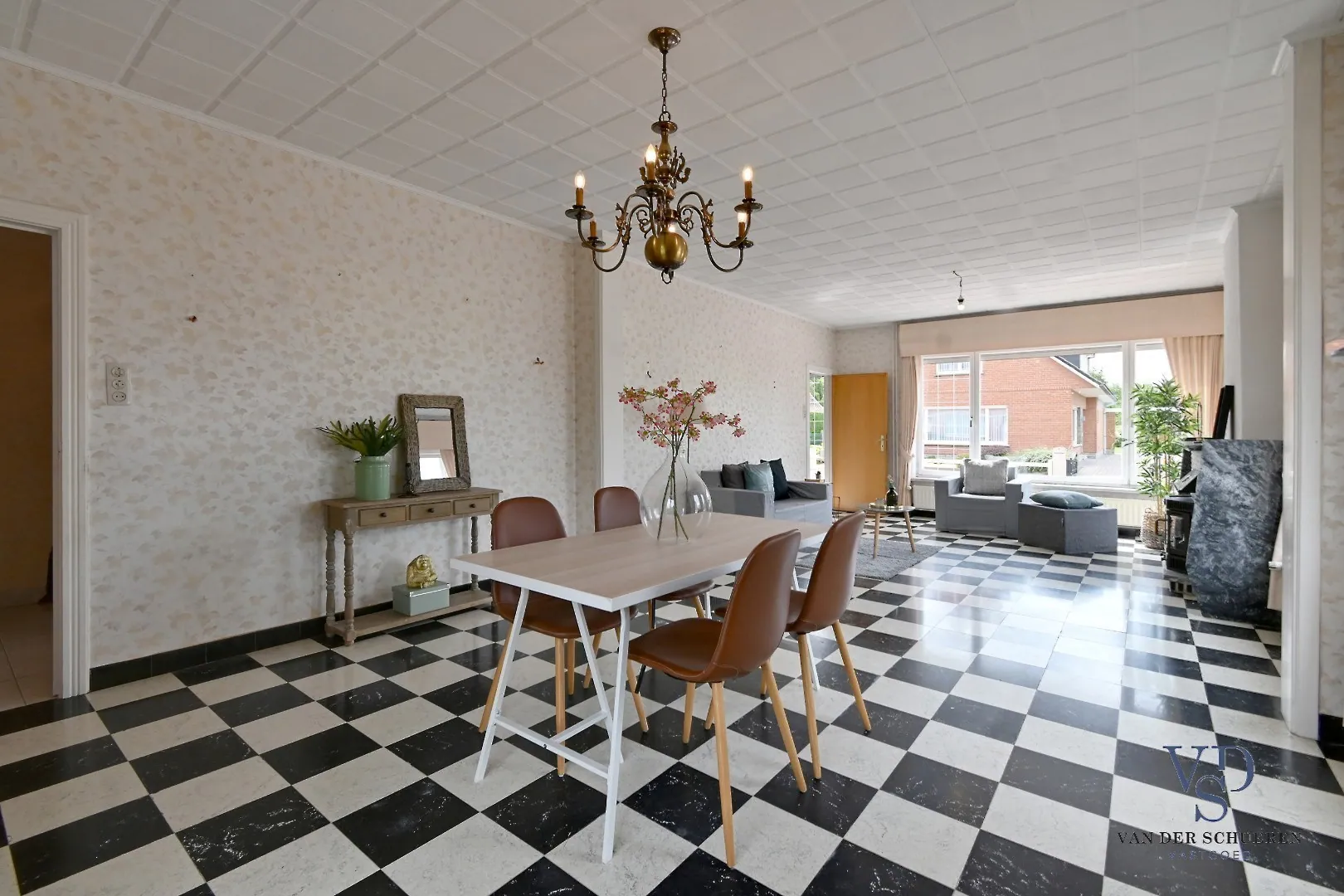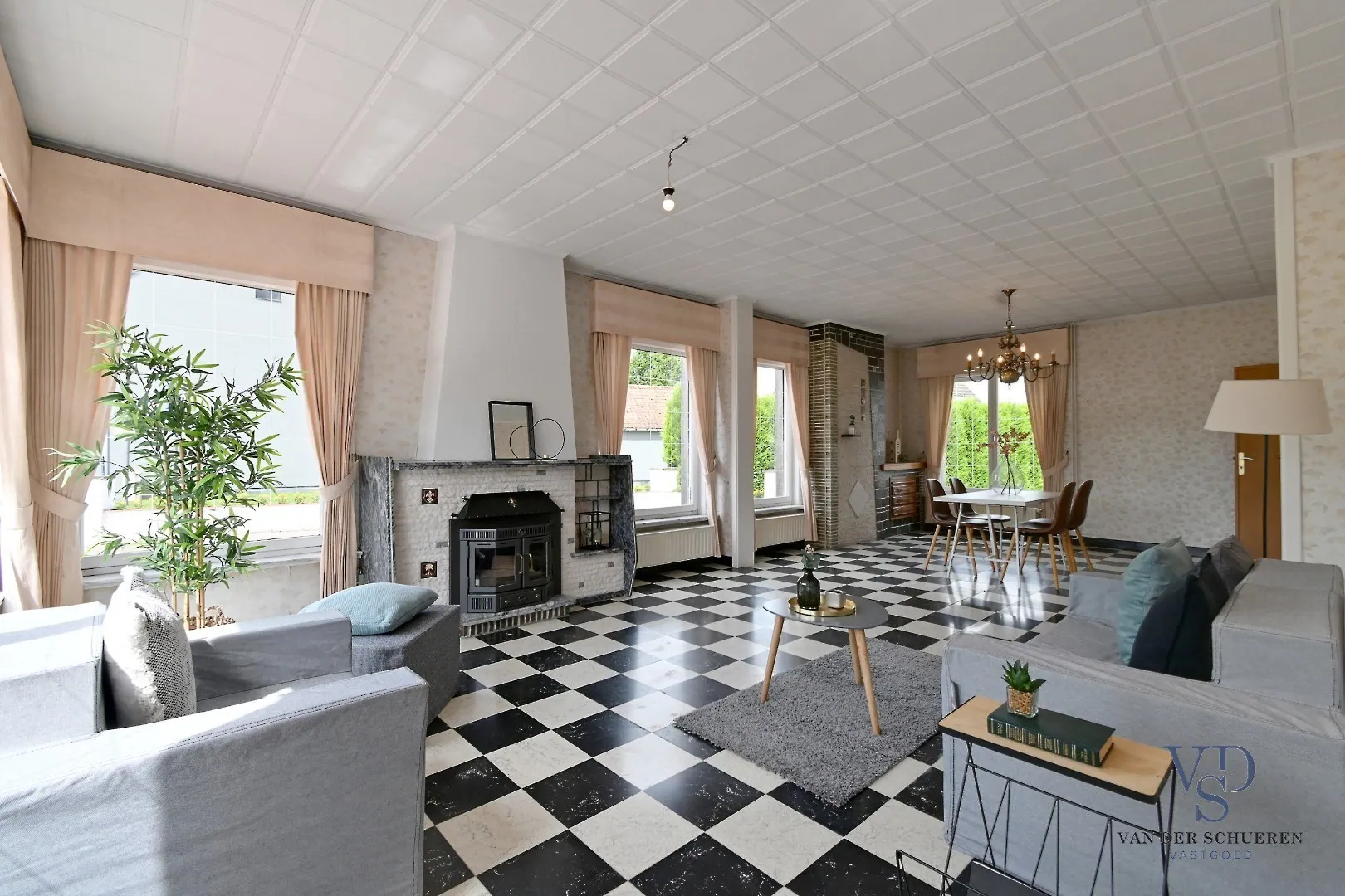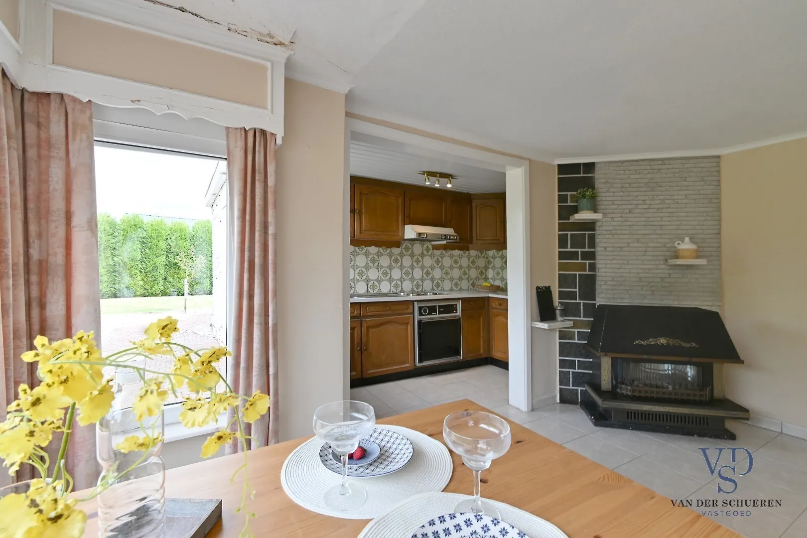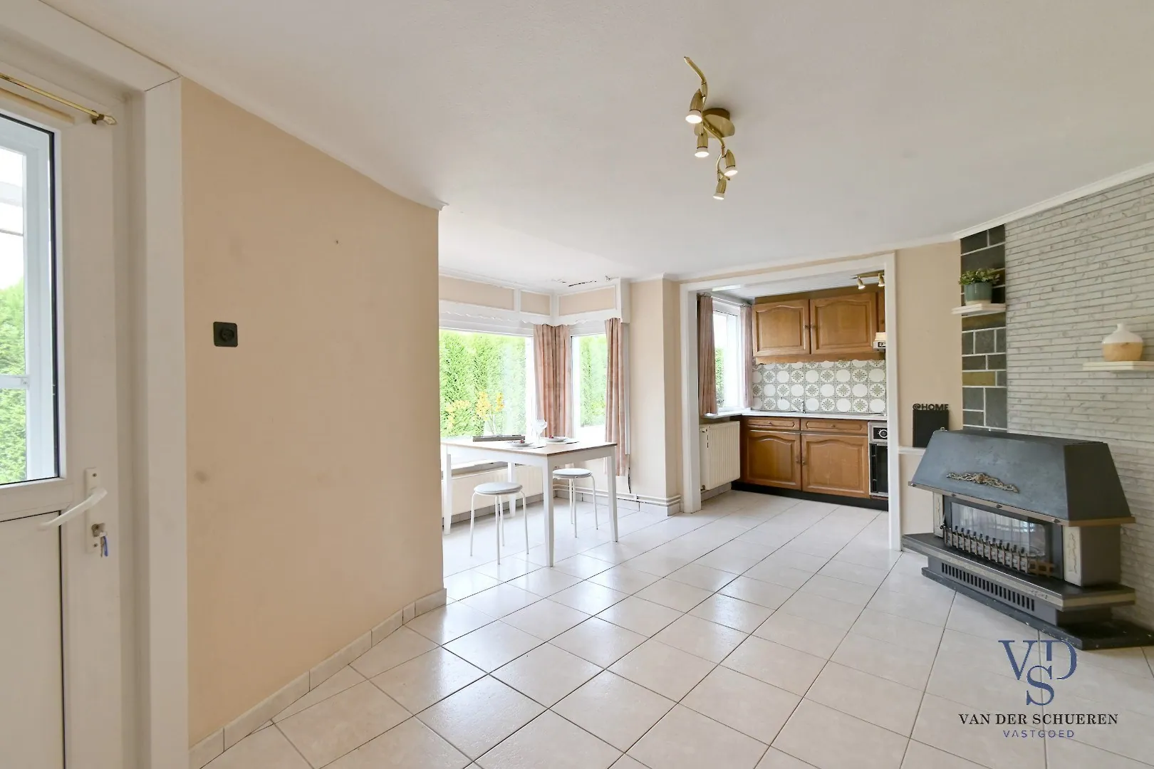 Ruime, lichtrijke leefruimte (naast CV eveneens een houtkachel aanwezig), die aansluit op de achteraan gesitueerde keuken.