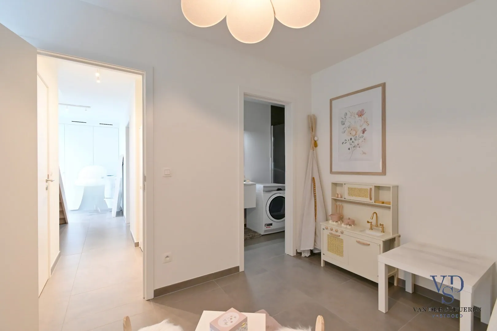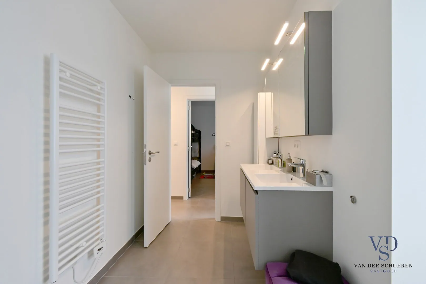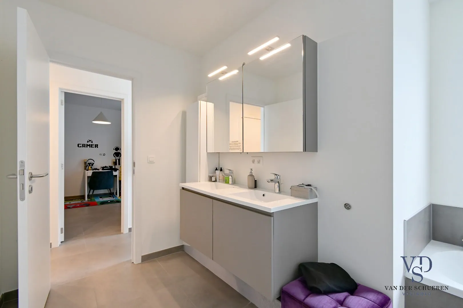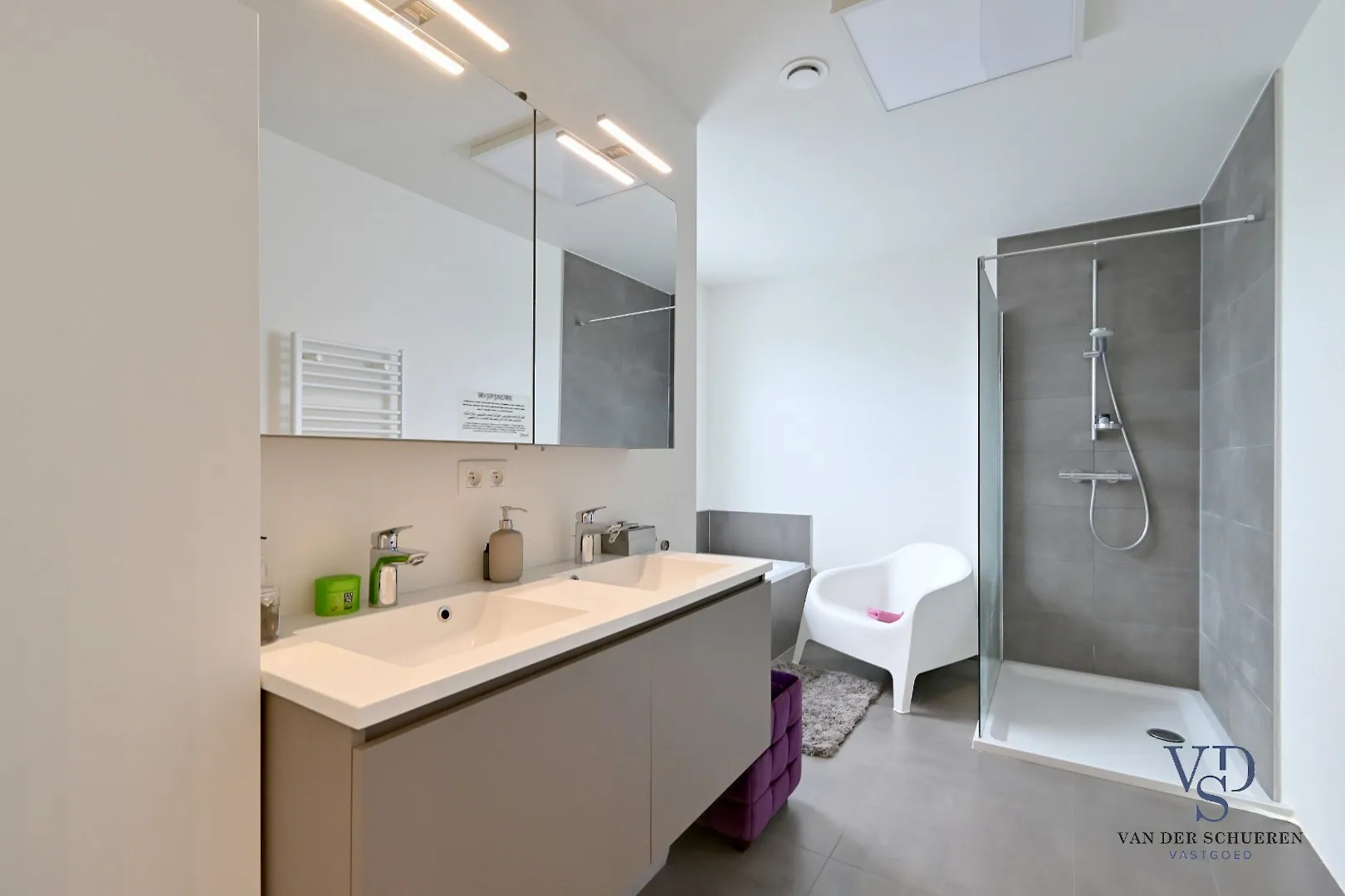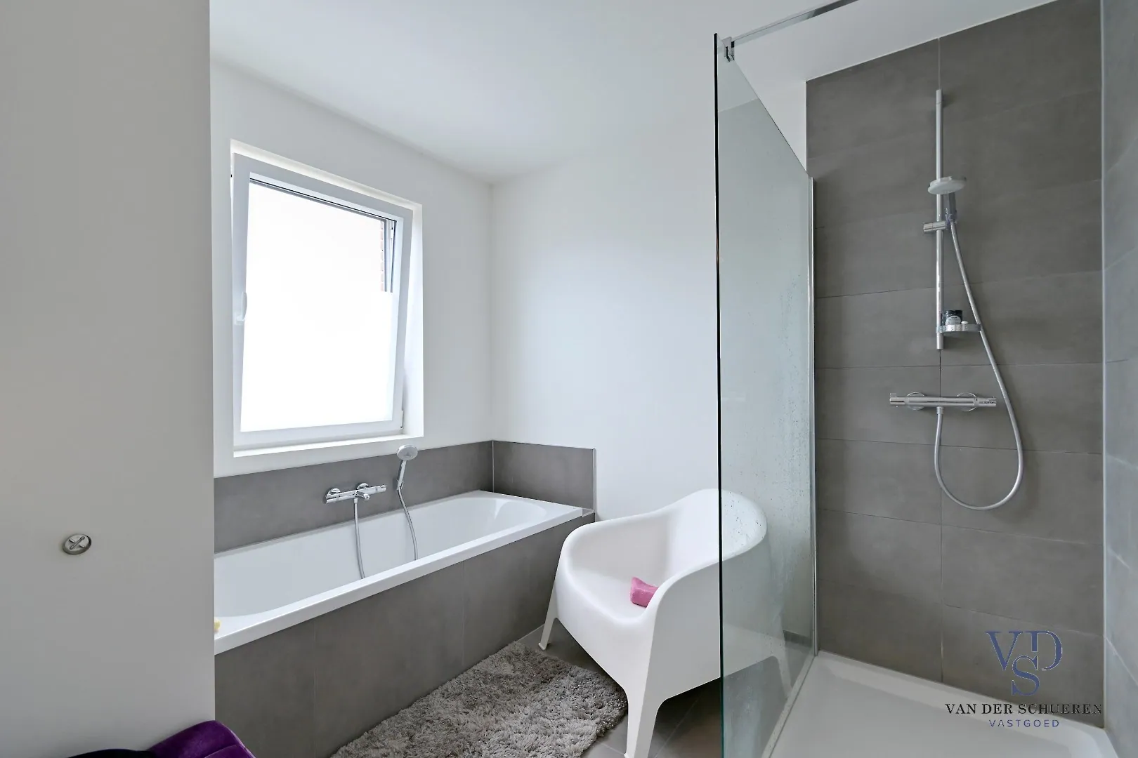 Op de verdieping vindt u drie comfortabele slaapkamers, elk met voldoende ruimte en lichtinval. De ruime badkamer op deze verdieping is uitgerust met zowel een douche als een bad, een badkamermeubel en een handdoekradiator. Verder is er een ook een afzonderlijk toilet en een technische ruimte. De woning is afgewerkt met stijlvolle tegels die een moderne uitstraling geven.