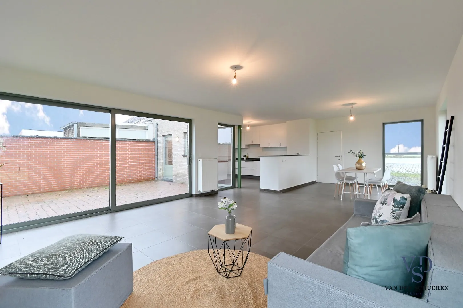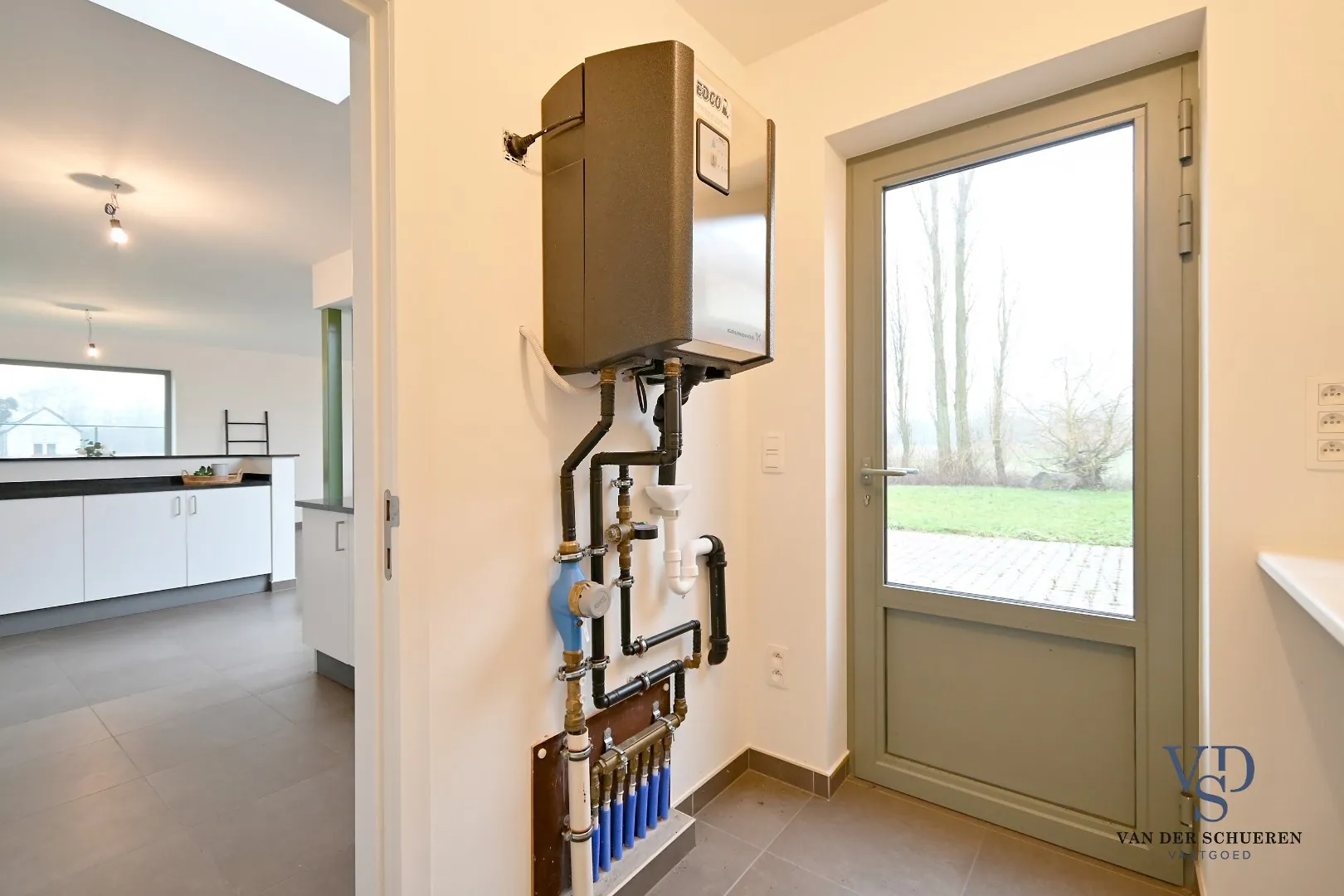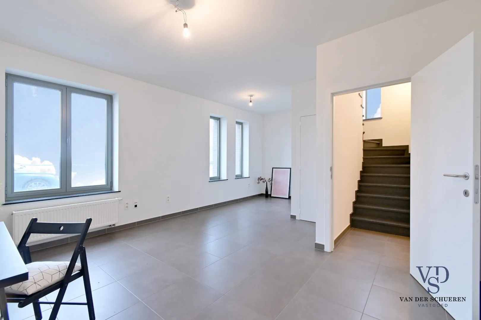 Zo beschikt het gelijkvloers over een inkomhal, ruime leefruimte met open keuken, wasplaats, afzonderlijke berging, toilet en slaapkamer/bureel.