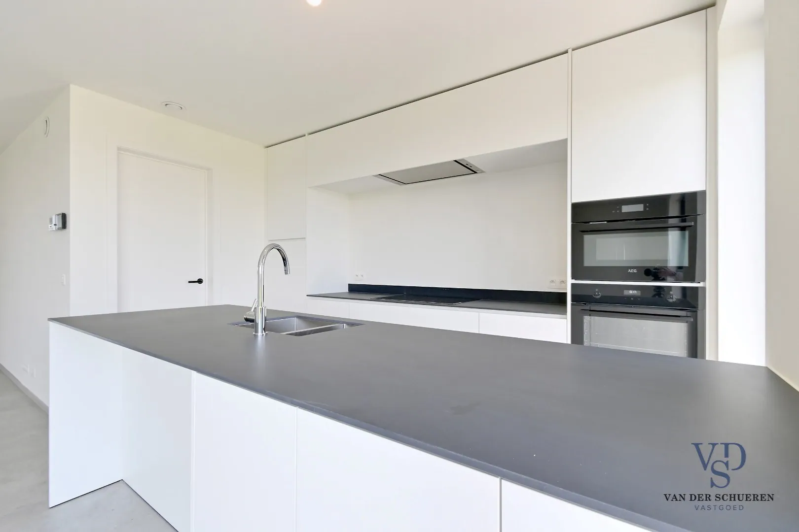 Bij binnenkomst wordt u verwelkomd in een ruime inkomhal met afzonderlijk toilet. De lichtrijke leefruimte sluit naadloos aan op de halfopen keuken, volledig uitgerust met kwalitatieve AEG-toestellen. Aansluitend is er een praktische berging.