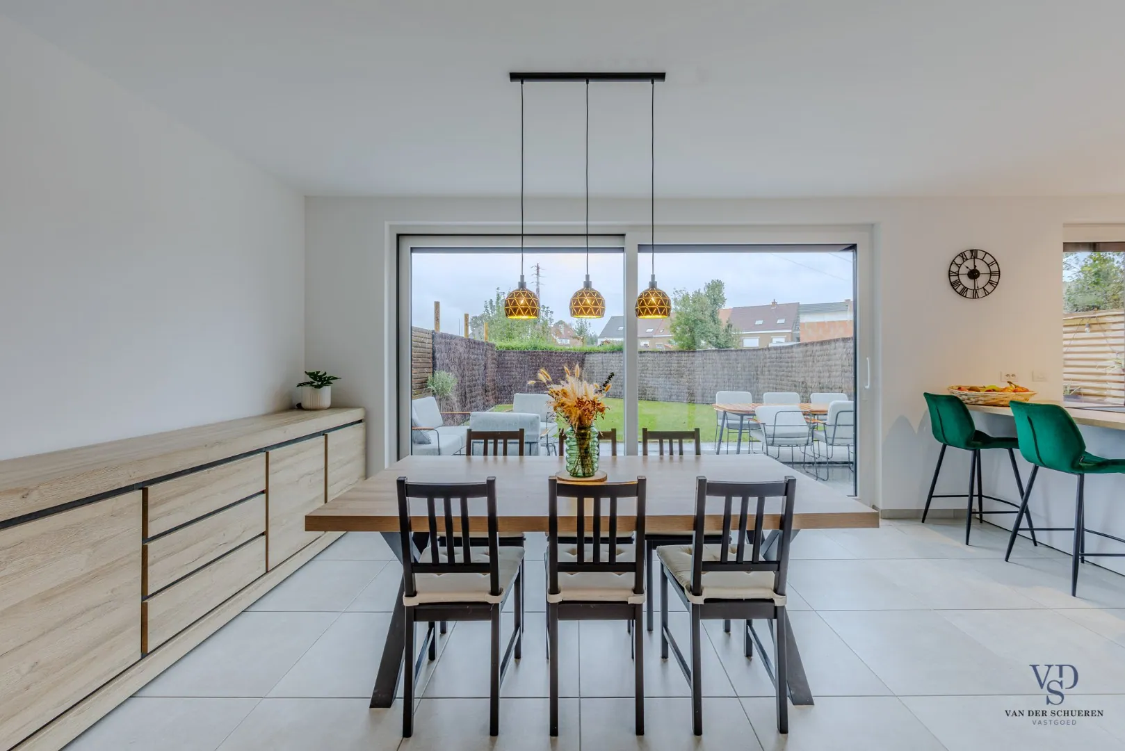 De lichtrijke leefruimte met open keuken biedt een aangename, open sfeer en een prachtig zicht op de tuin – ideaal om gezellig te tafelen of te ontspannen met familie en vrienden.
