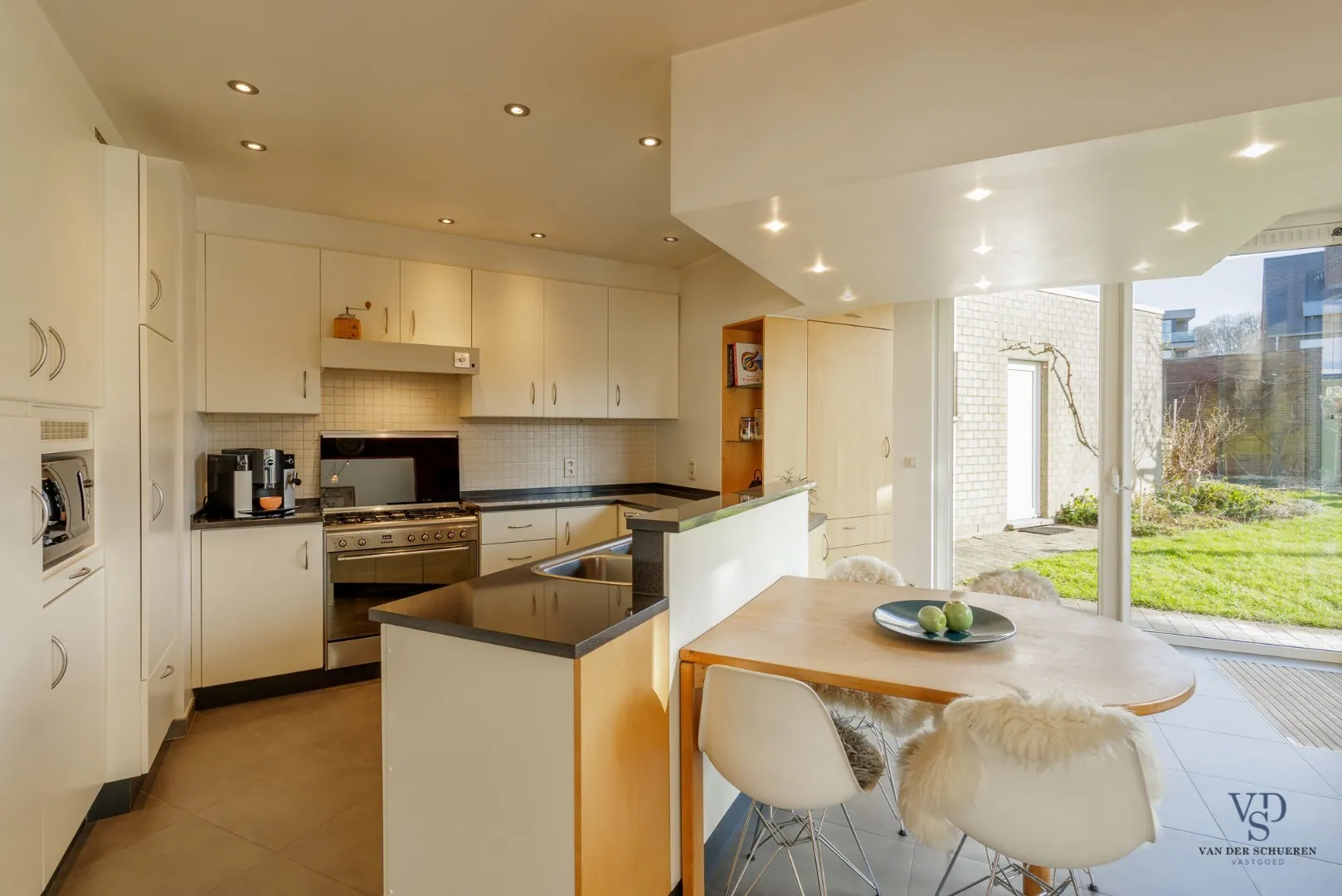 Het woongedeelte is toegankelijk via de zij-ingang. U komt binnen in de inkomhal, die voorzien is van een gastentoilet. Van daaruit bereikt u de riante en lichtrijke leefruimte, die aansluit op de keuken met eveneens zicht op de tuin. Naast de keuken bevindt zich een ruime berging/wasplaats. De twee praktijkruimtes (met bijhorende wachtruimte) bieden mogelijkheden als bvb. slaapkamers.