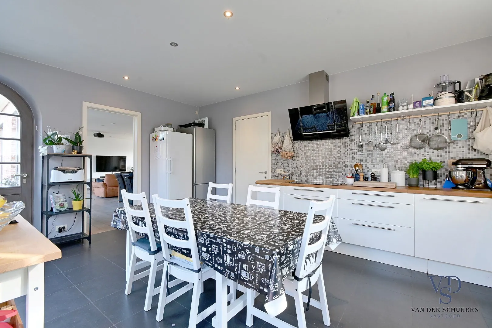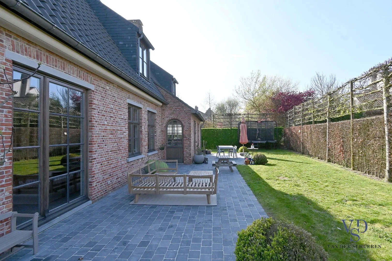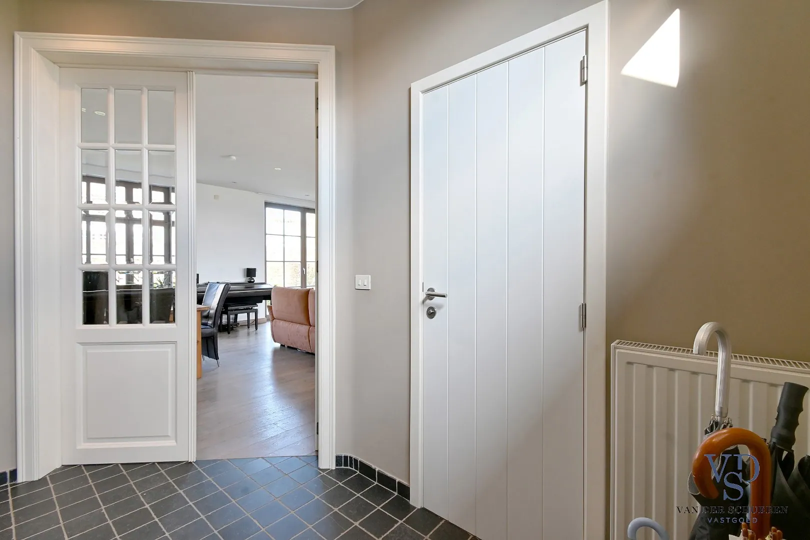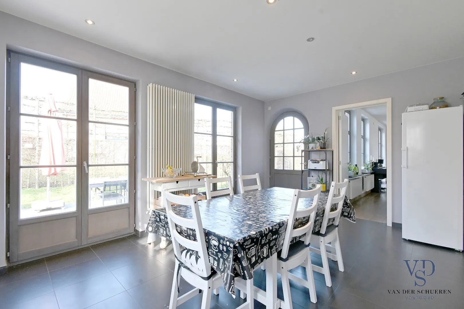 Passende inkomhal. Ruime, lichtrijke leefruimte. Afzonderlijke leefkeuken, met zicht op de tuin. Inpandige garage.