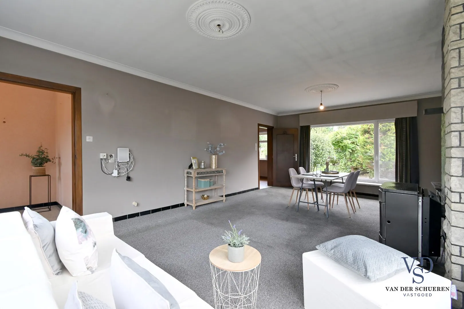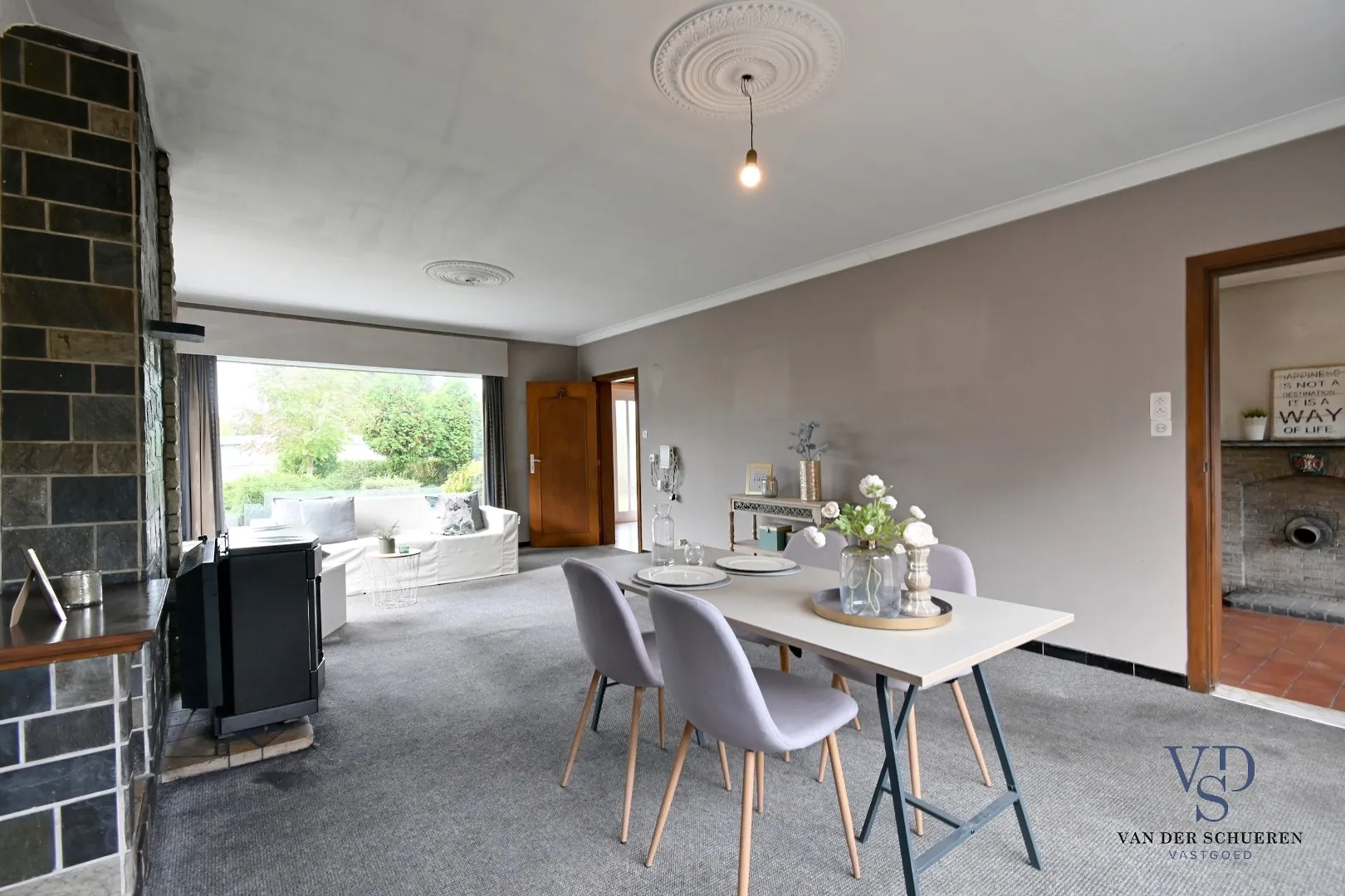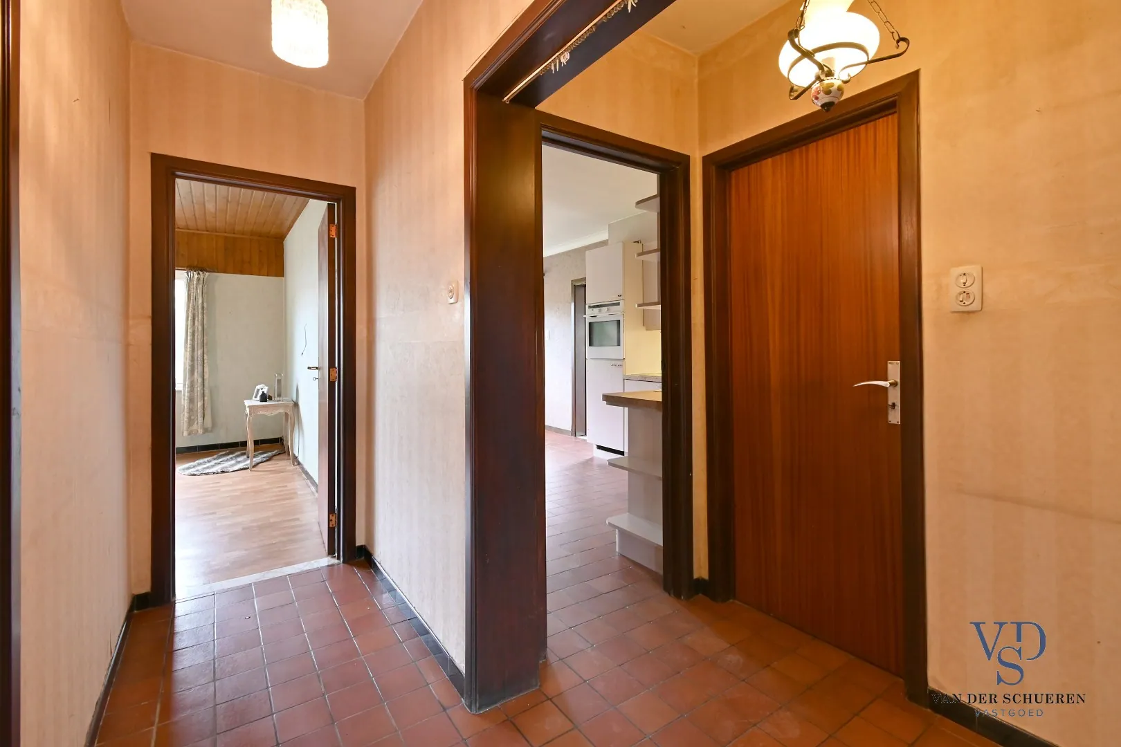 Via de inkomhal kom je in de ruime leefruimte, die grenst aan de keuken. Vanuit de keuken is er toegang tot de tuin via een buitendeur.