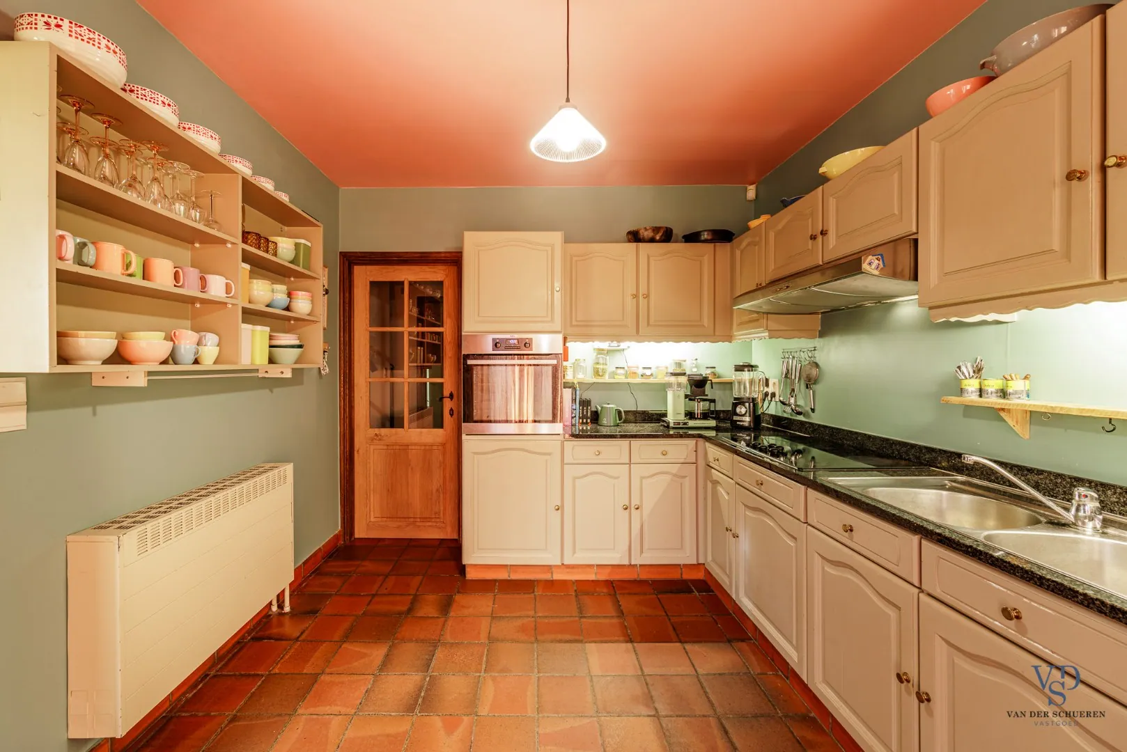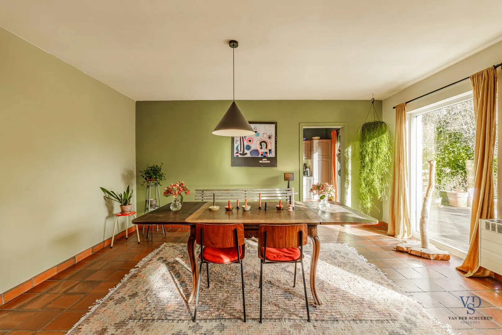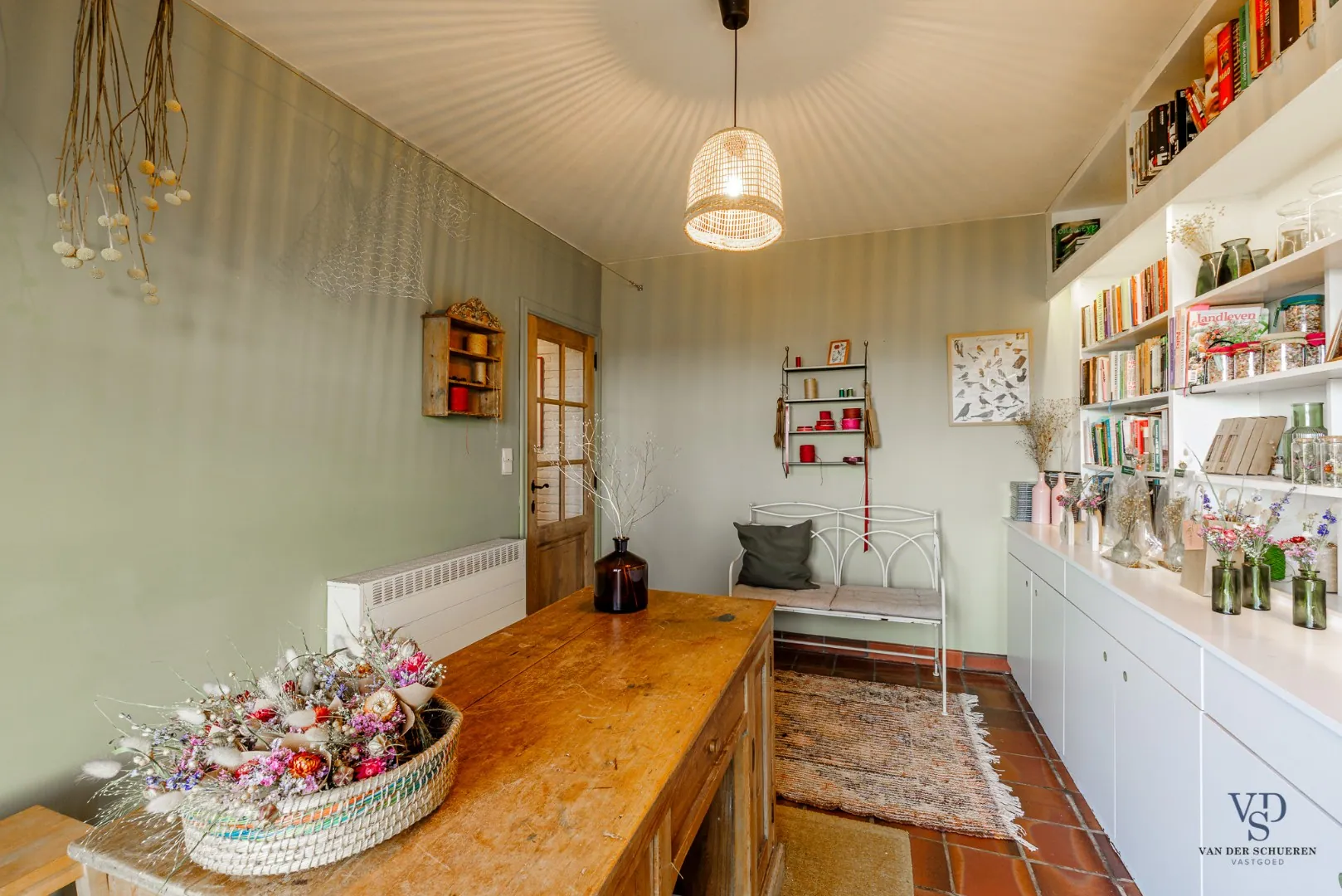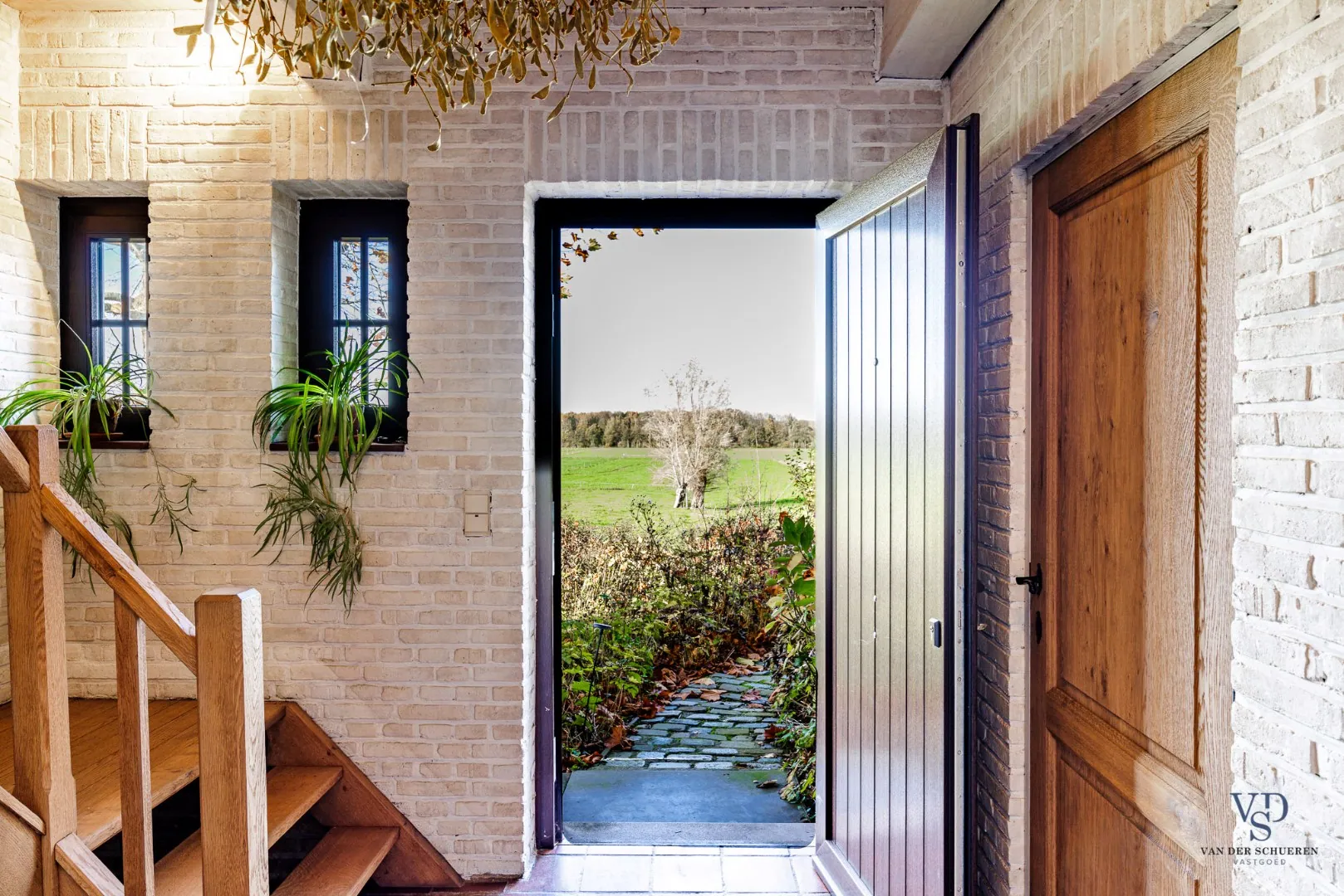 De stijlvolle inkomhal zet meteen een ruimtelijk accent en leidt naar een afzonderlijke bureauruimte of naar de leefruimte en keuken, die zich achteraan de woning bevinden. Het gelijkvloers beschikt bovendien over een aparte berging, een gastentoilet en een praktische inpandige garage.