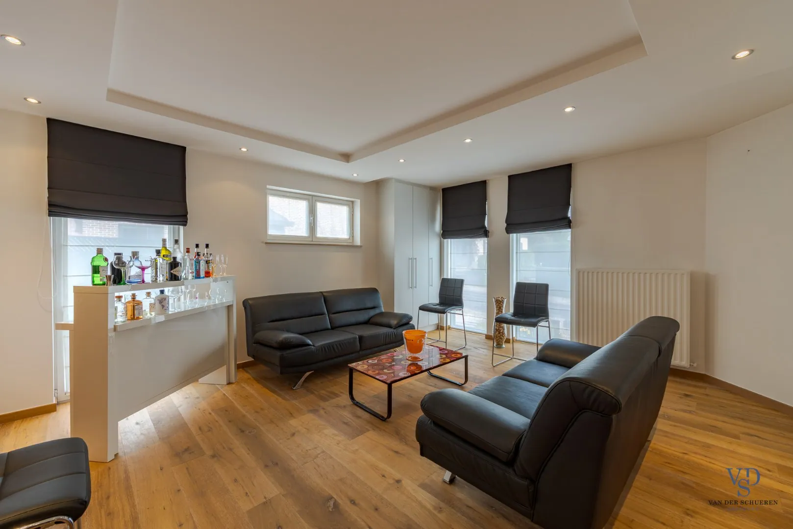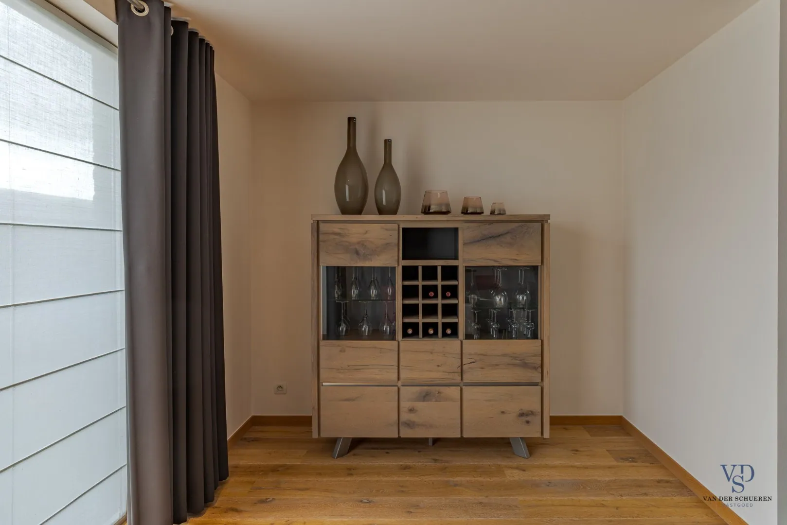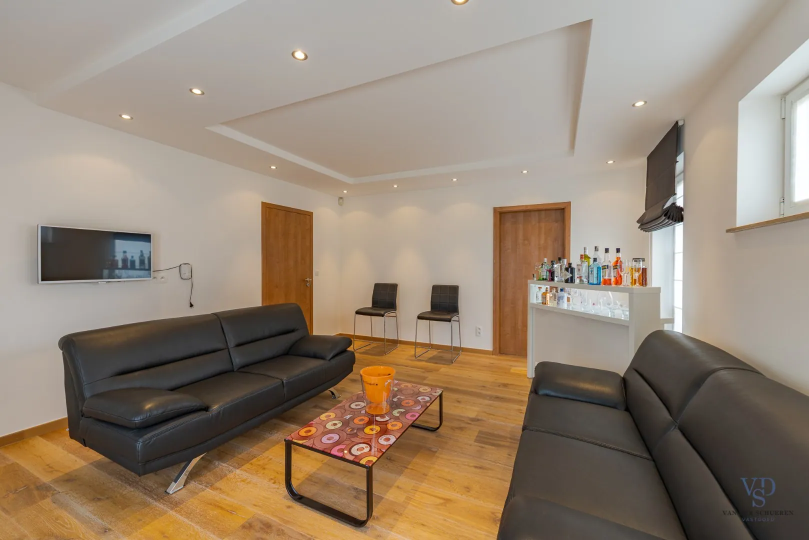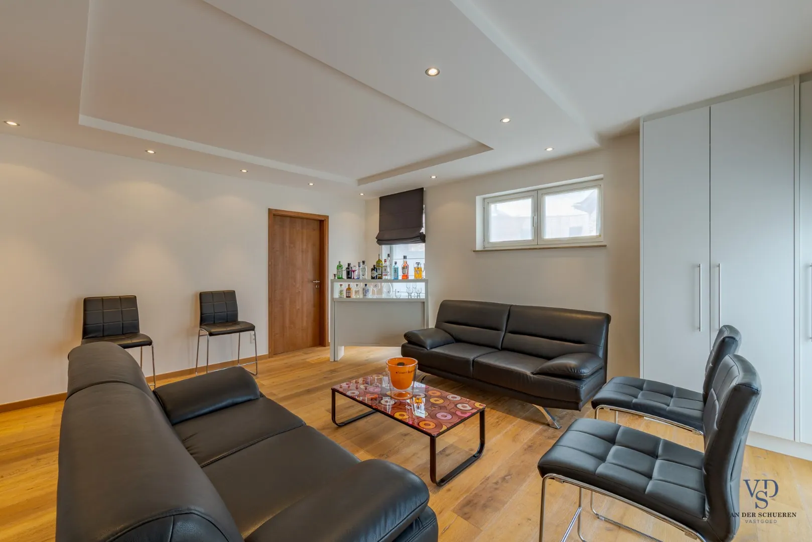 De centrale inkomhal brengt u naar de bar, een ruime plek met tal van invullingsmogelijkheden (zoals een bureel of hobbyruimte), die u vervolgens leidt naar de praktische keuken. De ruime lichtrijke leefruimte sluit hierop mooi aan.