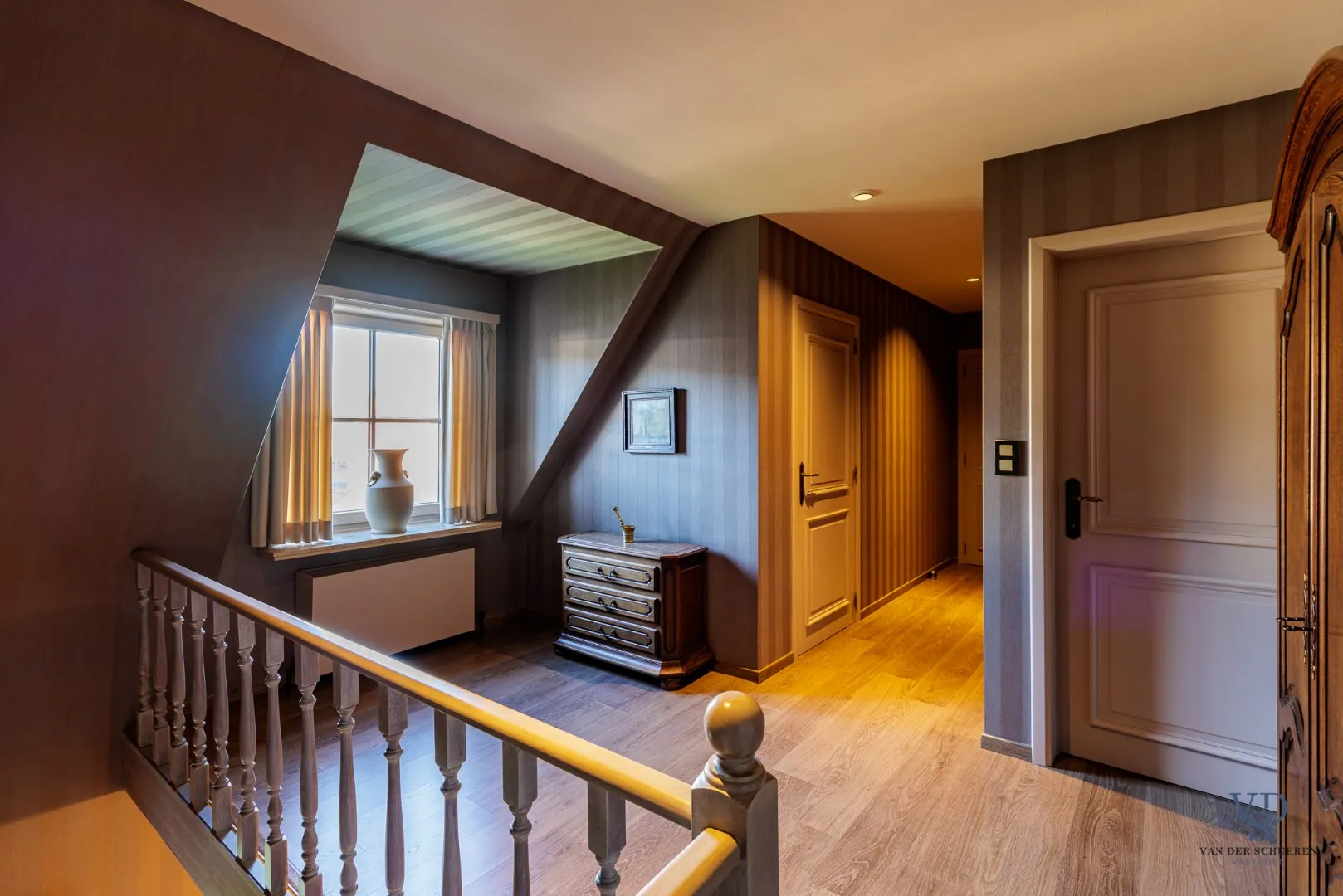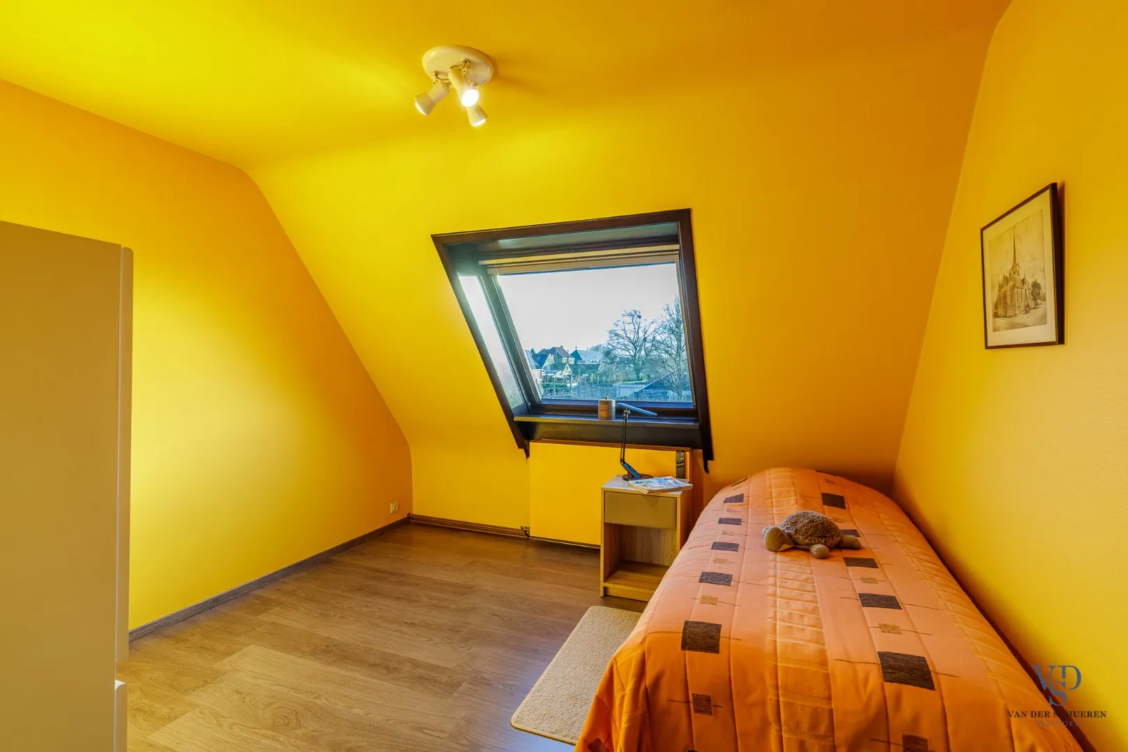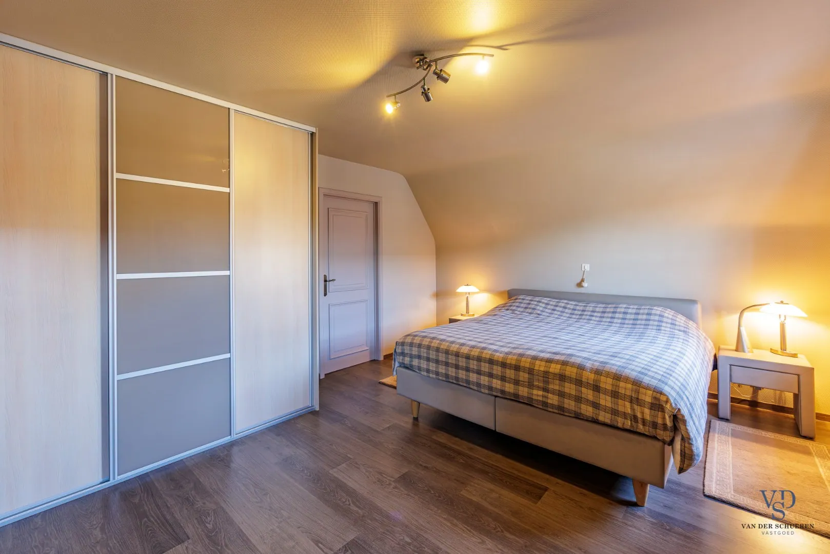 Op de verdieping leidt de nachthal naar drie volwaardige slaapkamers, een praktische berging en een comfortabele badkamer, uitgerust met dubbel lavabomeubel, ligbad, douche en toilet. Naast de centrale berging beschikken bovendien ook de twee buitenste slaapkamers elk over een bijkomende berging onder het dak wat bijdraagt aan het uitzonderlijke opbergcomfort van deze woning. Ook kan er eventueel optimaal gebruik gemaakt worden van de nokruimte waar het nu zolder is.