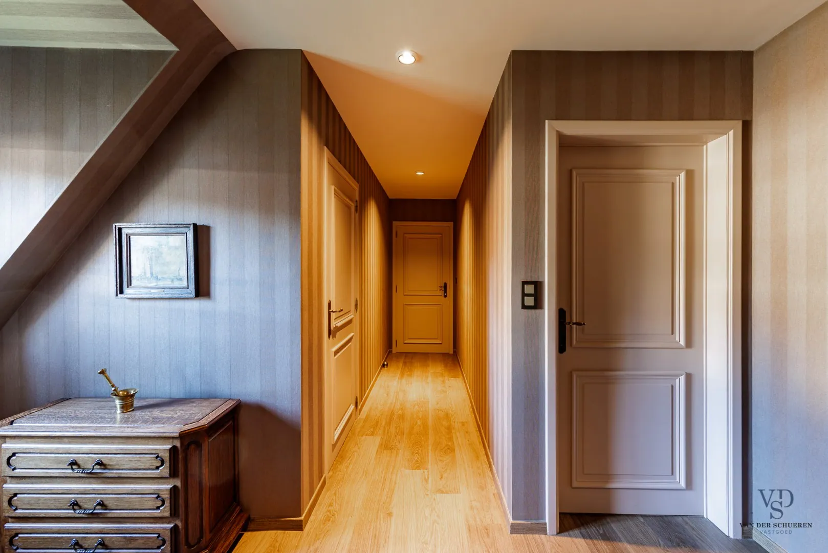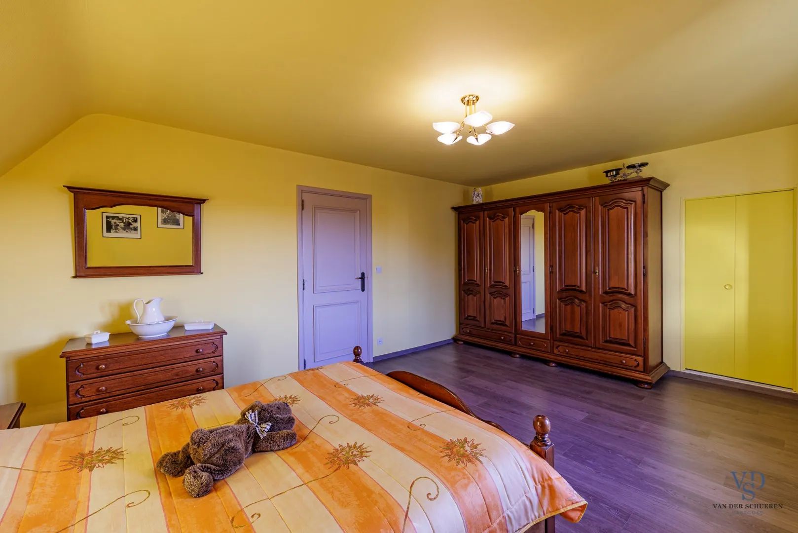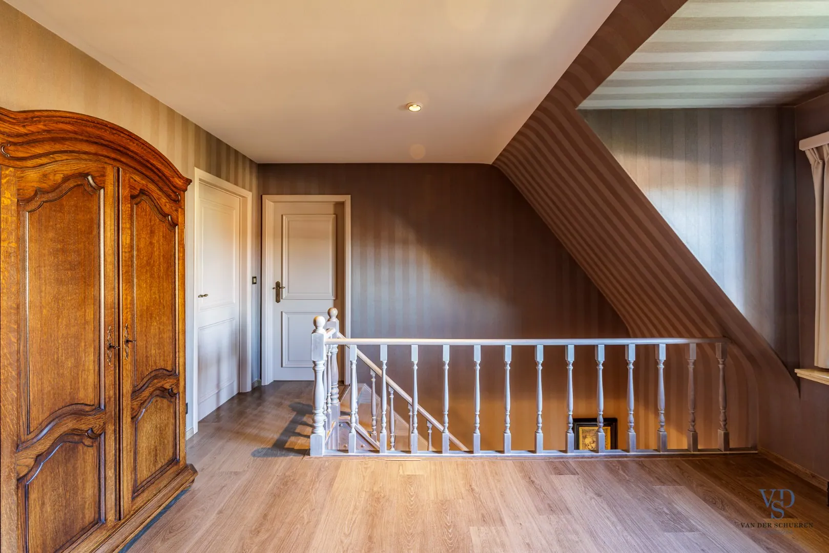 Op de verdieping leidt de nachthal naar drie volwaardige slaapkamers, een praktische berging en een comfortabele badkamer, uitgerust met dubbel lavabomeubel, ligbad, douche en toilet. Naast de centrale berging beschikken bovendien ook de twee buitenste slaapkamers elk over een bijkomende berging onder het dak wat bijdraagt aan het uitzonderlijke opbergcomfort van deze woning. Ook kan er eventueel optimaal gebruik gemaakt worden van de nokruimte waar het nu zolder is.