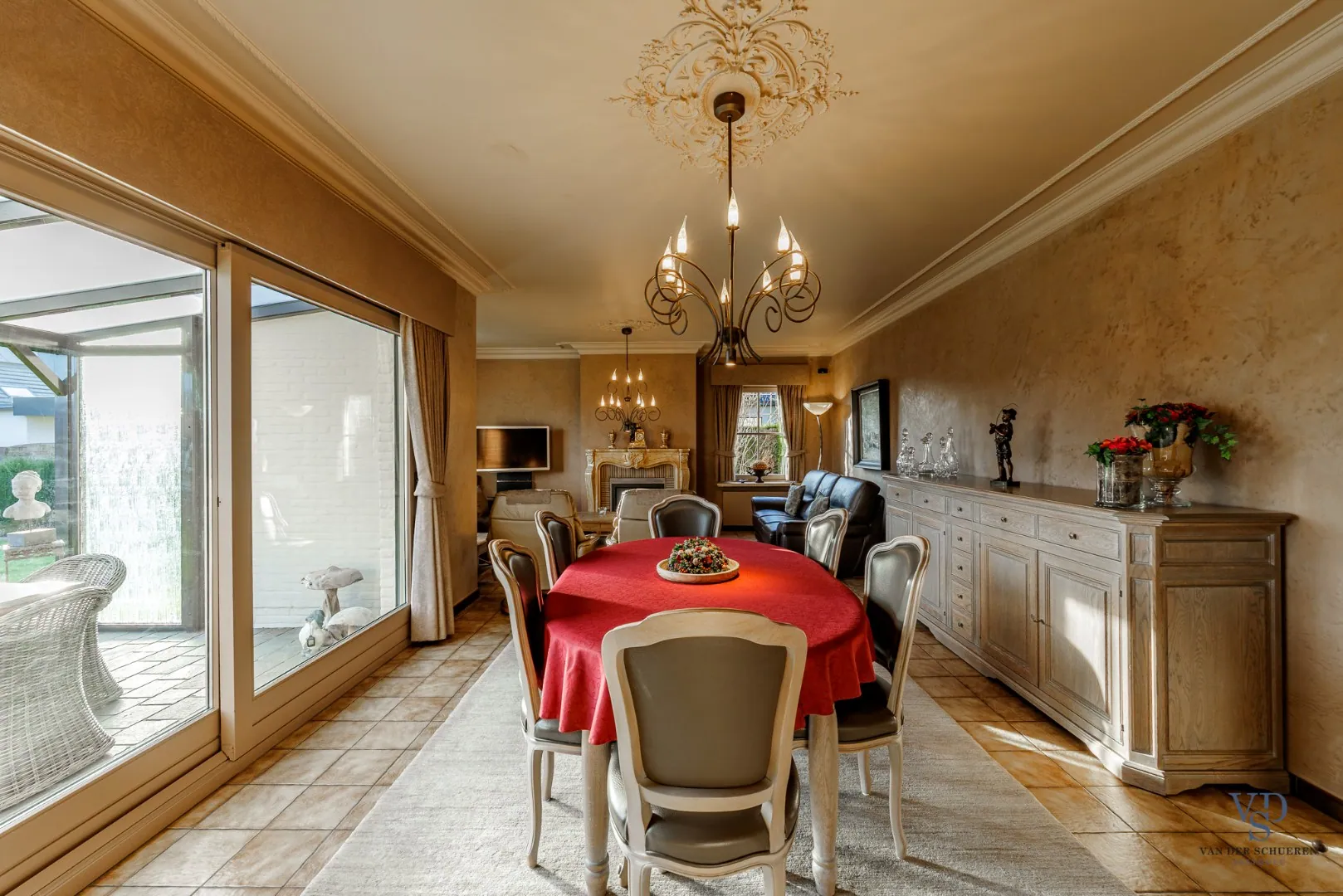 De royale leefruimte met gezellige zithoek en eetplaats vormt het warme hart van de woning en geniet van een aangename lichtinval.