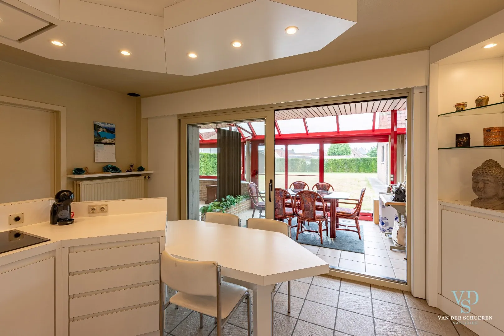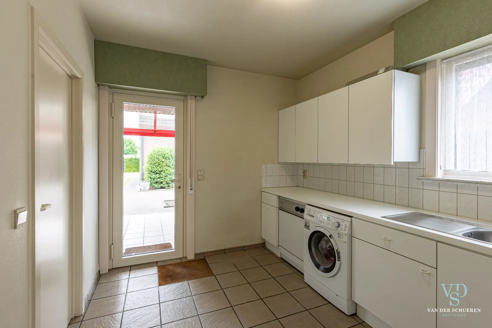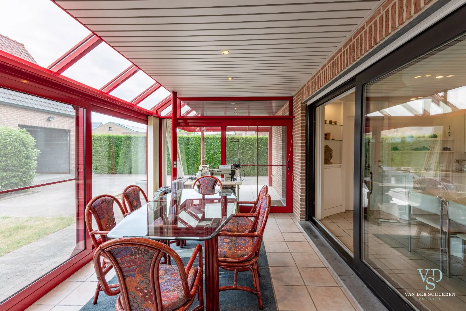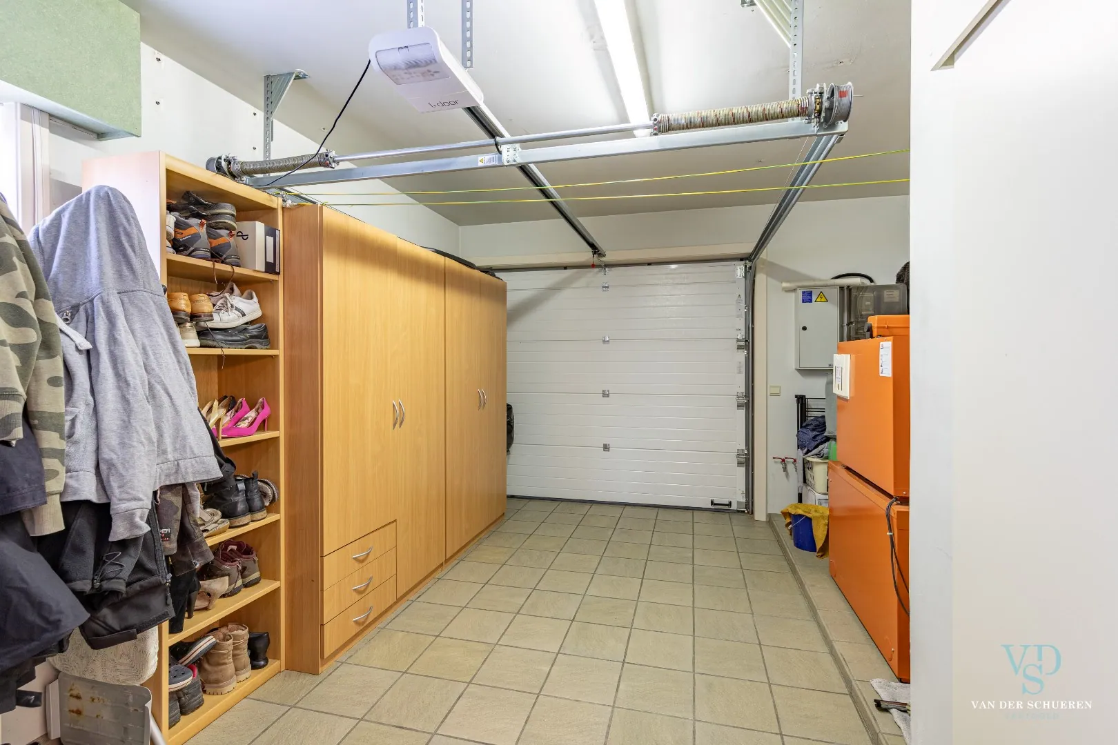 Deze eigendom beschikt op het gelijkvloers over een aangename inkomhal met gastentoilet, leefruimte, afzonderlijke keuken, ruime geïntegreerde leef-veranda, wasruimte, berging en een inpandige garage mét sanitaire hoek.