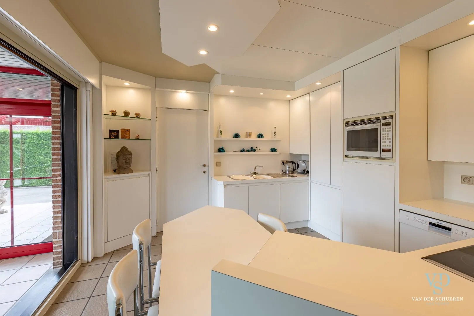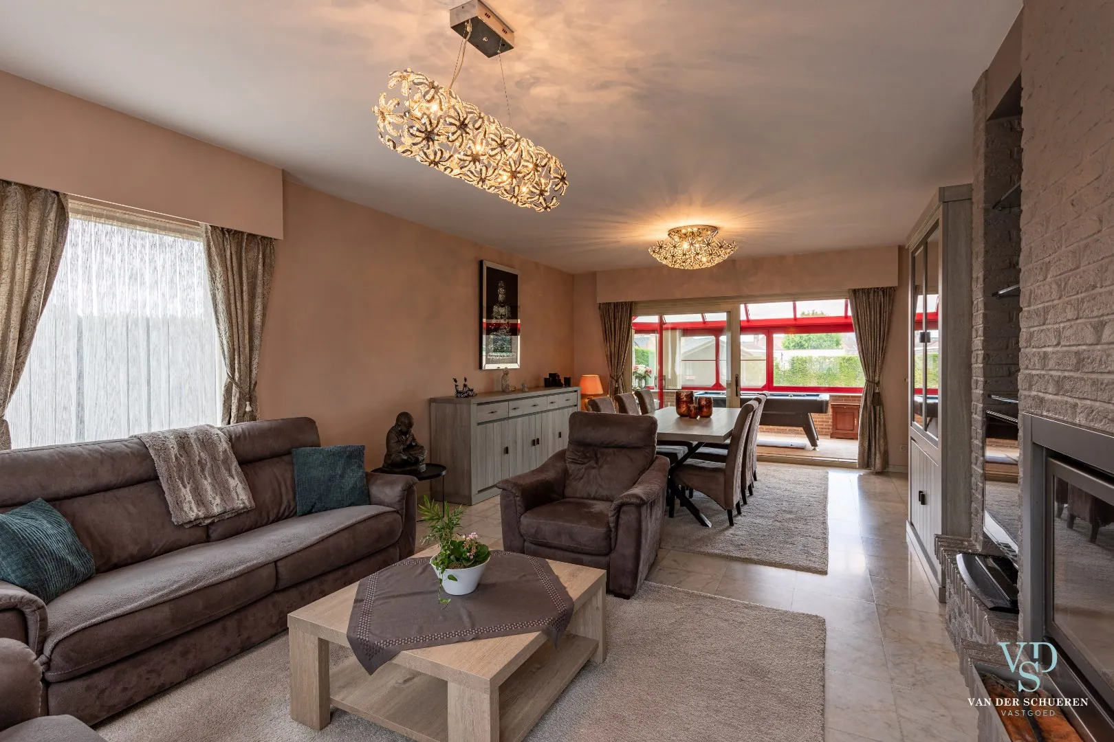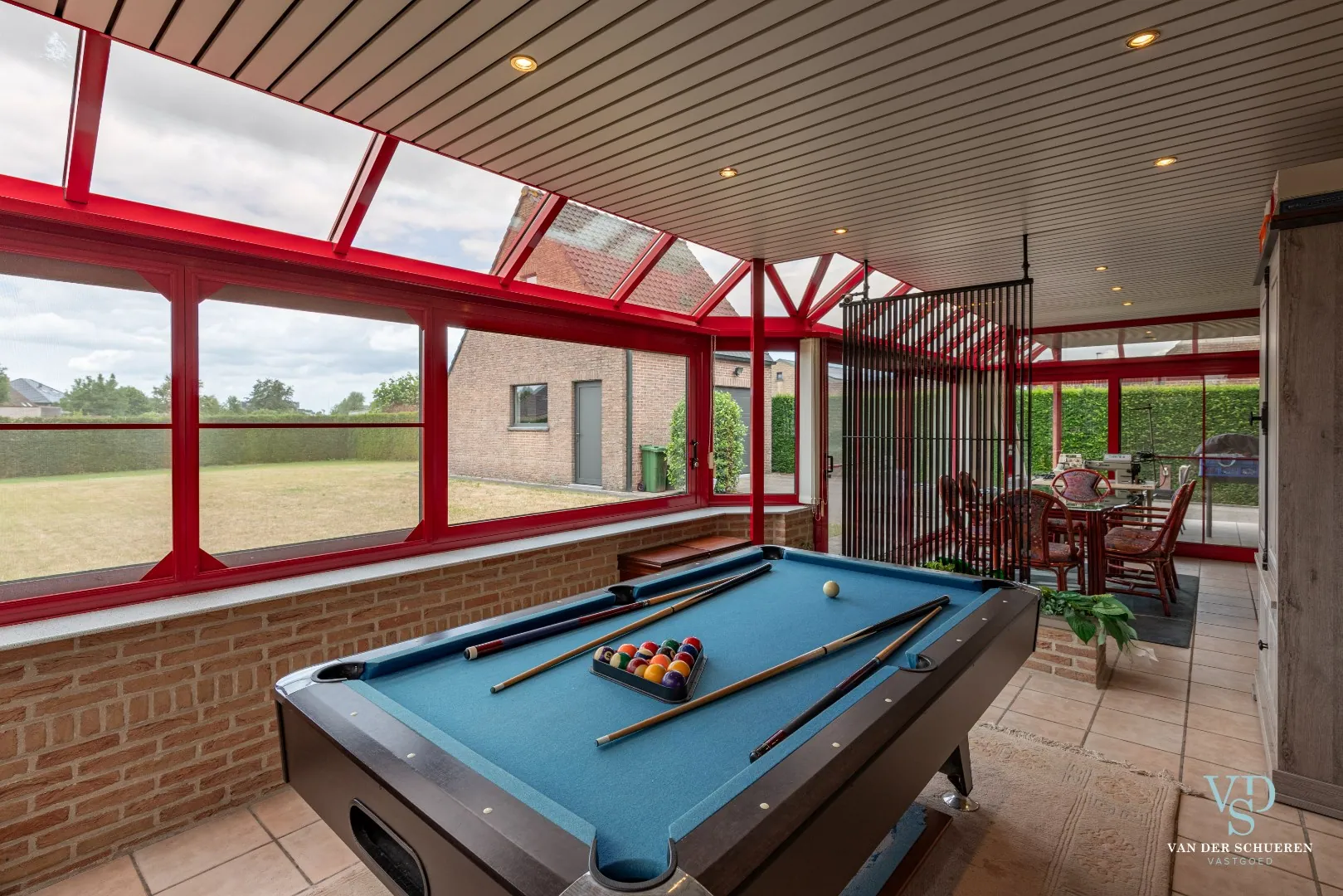 Deze eigendom beschikt op het gelijkvloers over een aangename inkomhal met gastentoilet, leefruimte, afzonderlijke keuken, ruime geïntegreerde leef-veranda, wasruimte, berging en een inpandige garage mét sanitaire hoek.