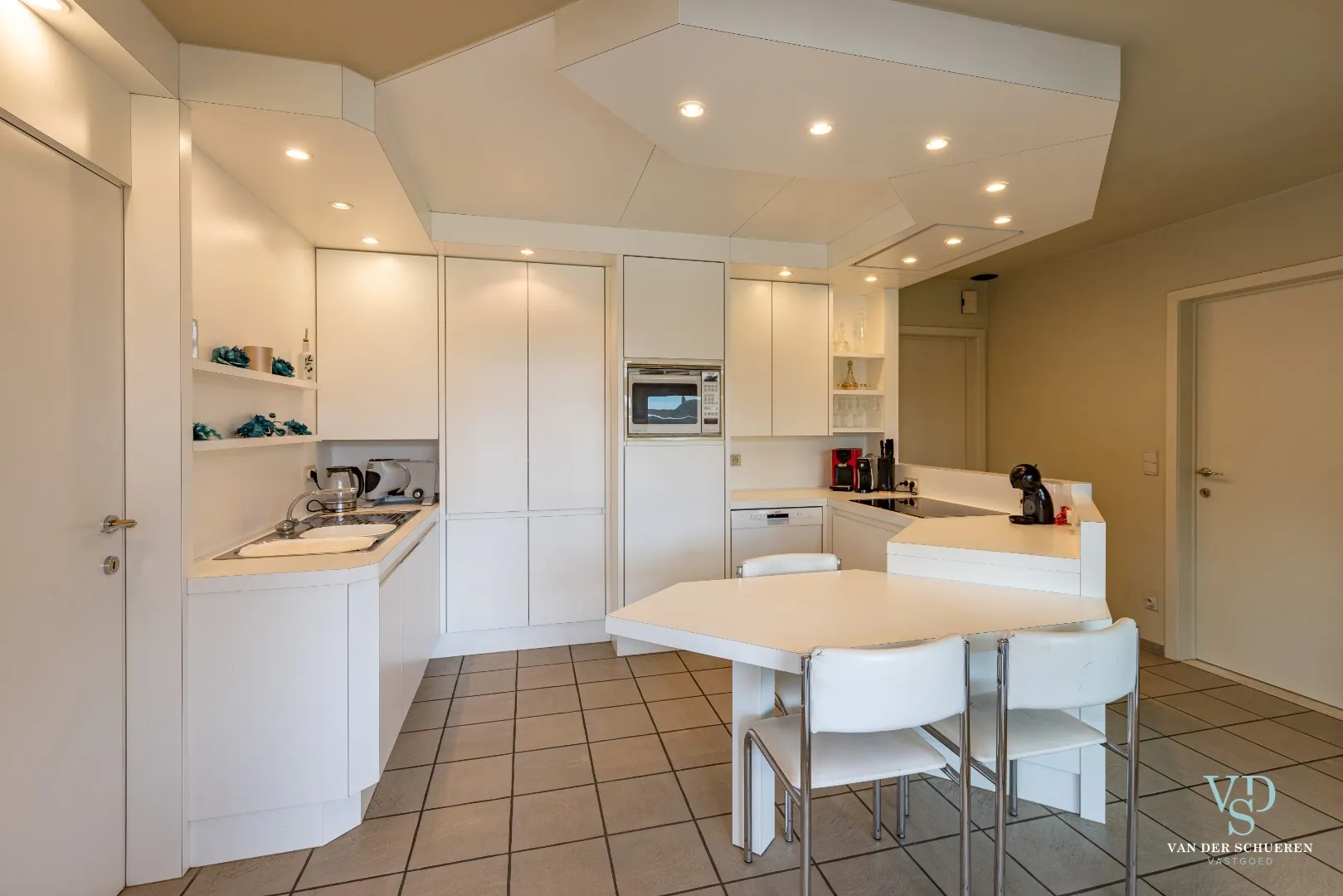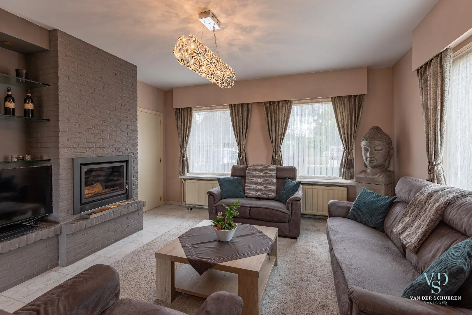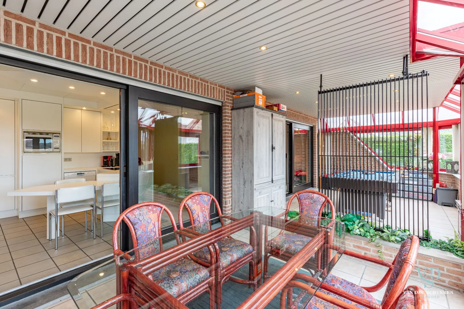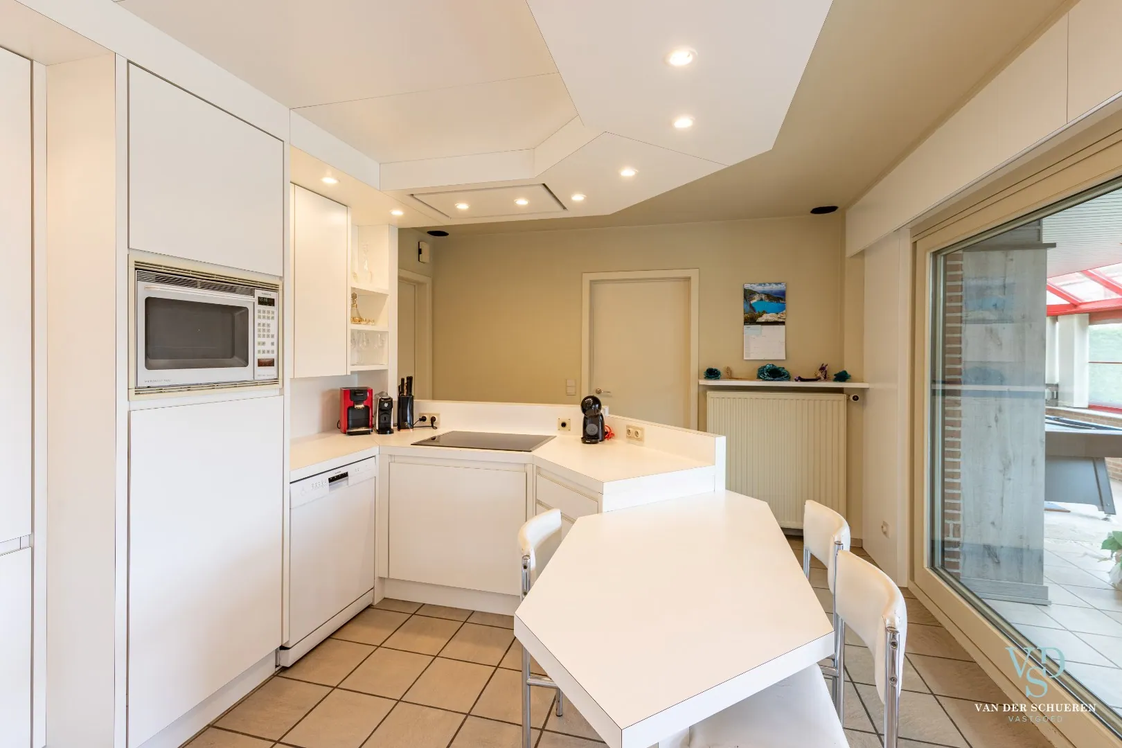 Deze eigendom beschikt op het gelijkvloers over een aangename inkomhal met gastentoilet, leefruimte, afzonderlijke keuken, ruime geïntegreerde leef-veranda, wasruimte, berging en een inpandige garage mét sanitaire hoek.