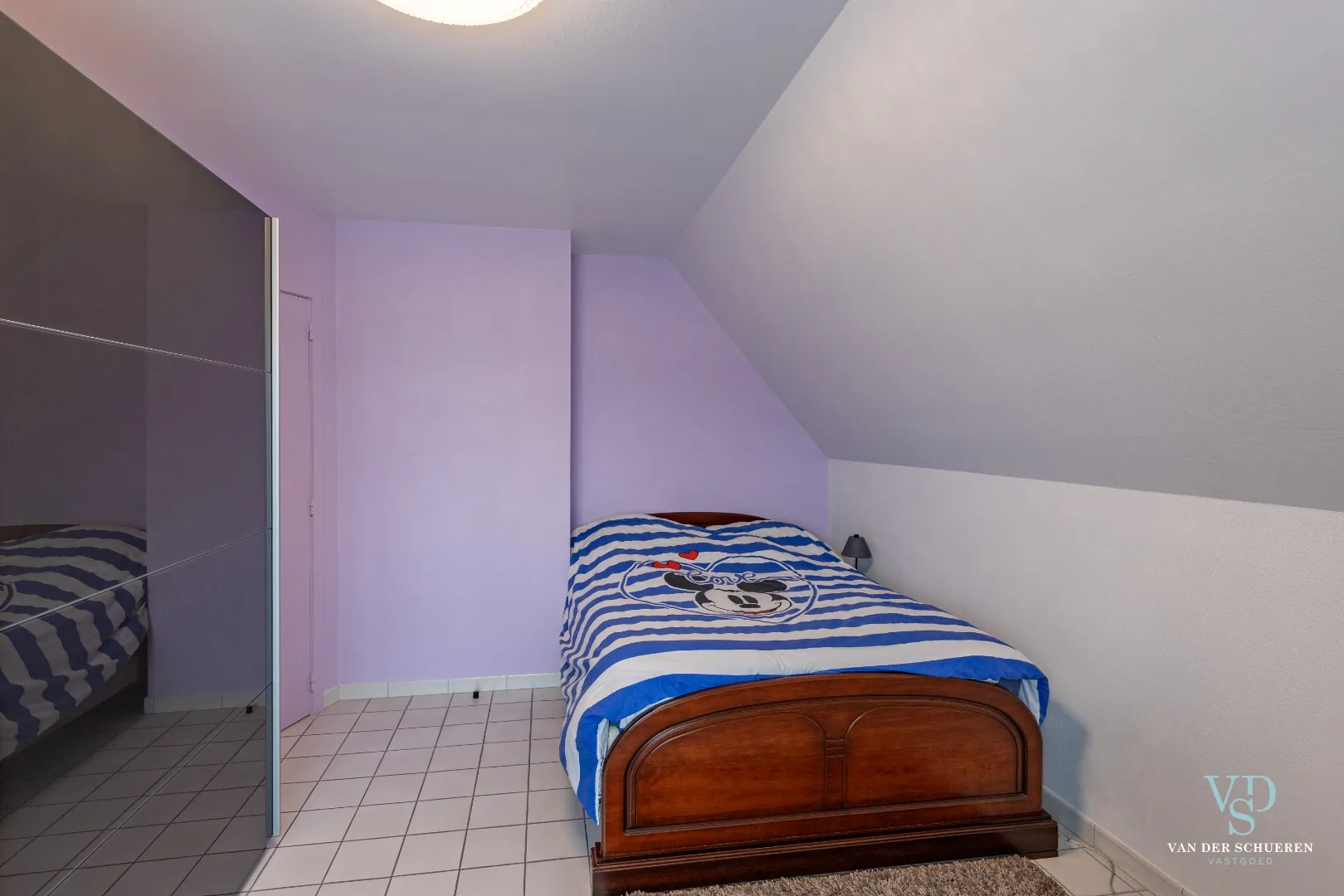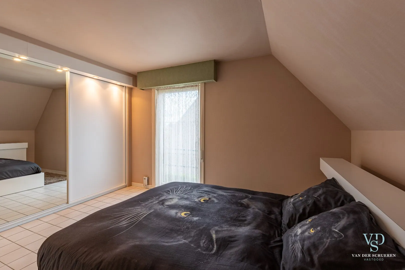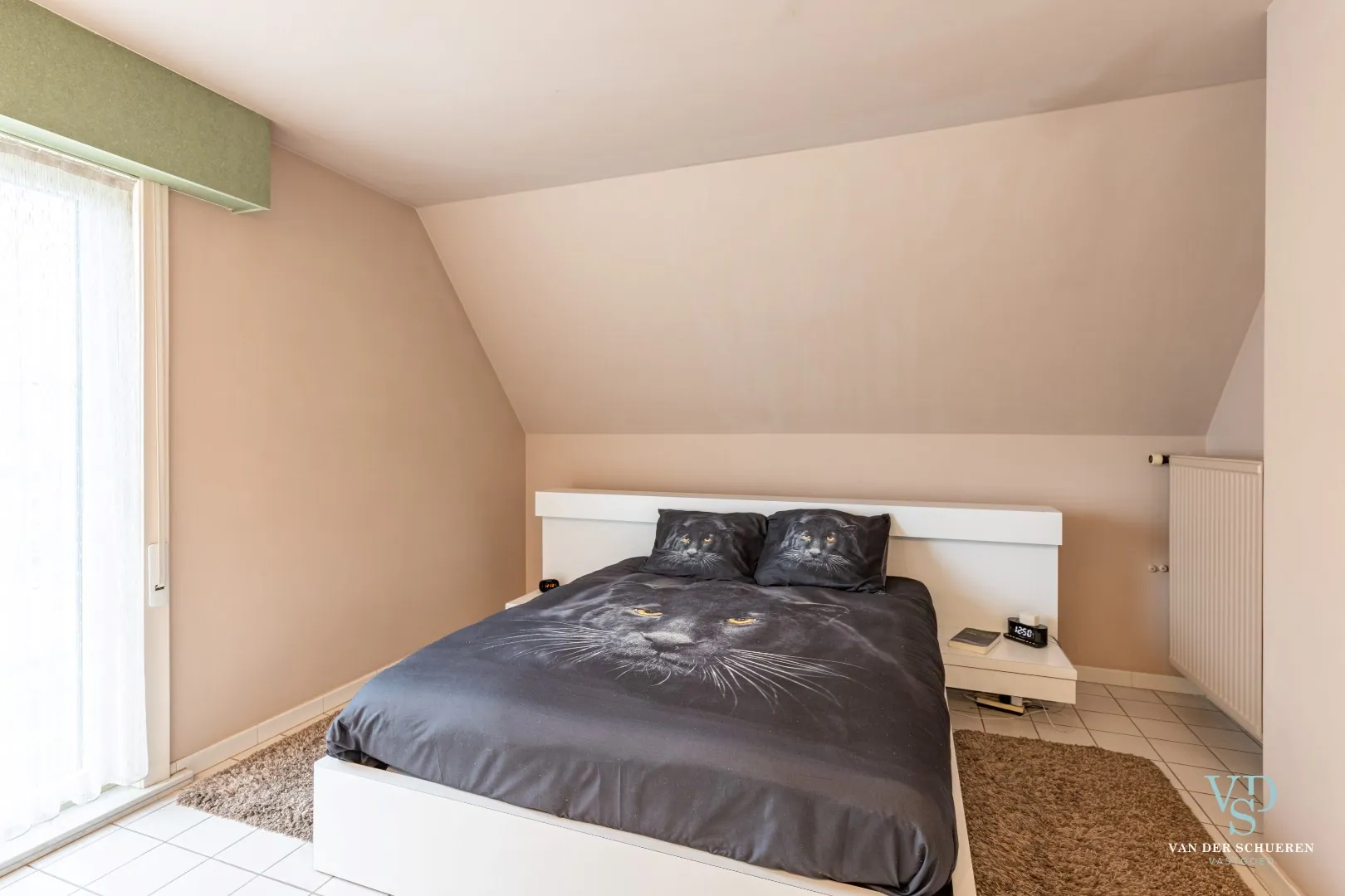 De verdieping is voorzien van een masterbedroom met vast bed en ingemaakte kasten, 2 slaapkamers, een bureel met aanpalende bergruimte en een badkamer met o.a. bad én douche.