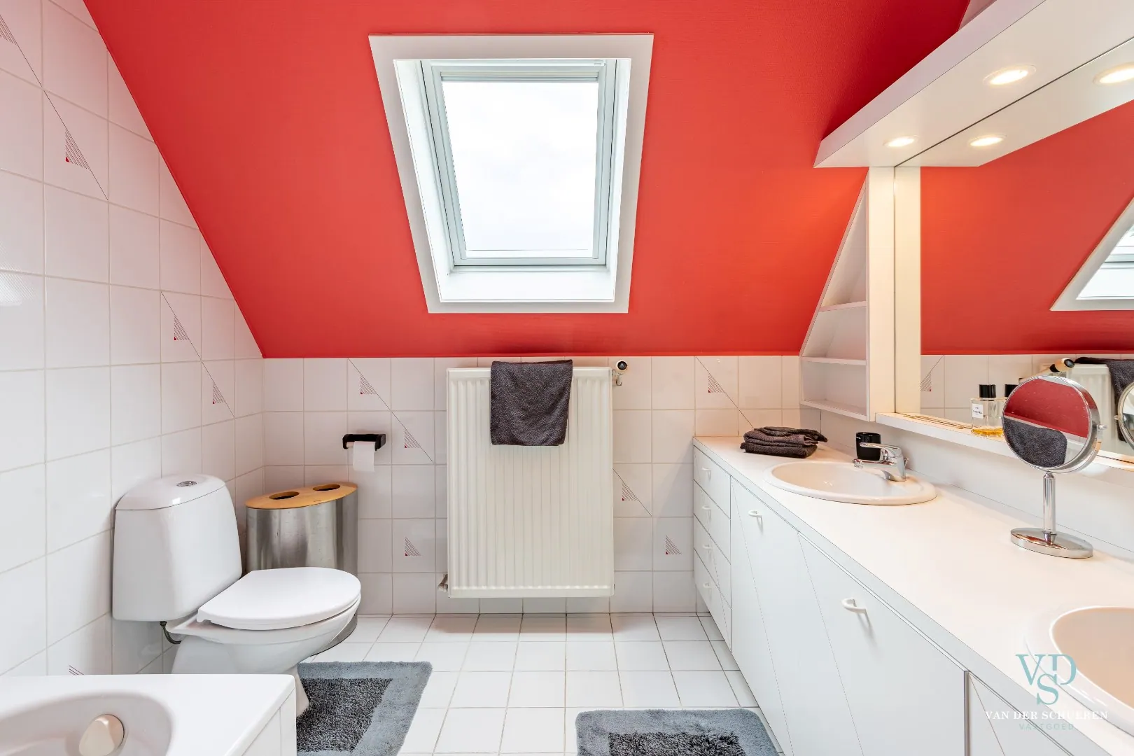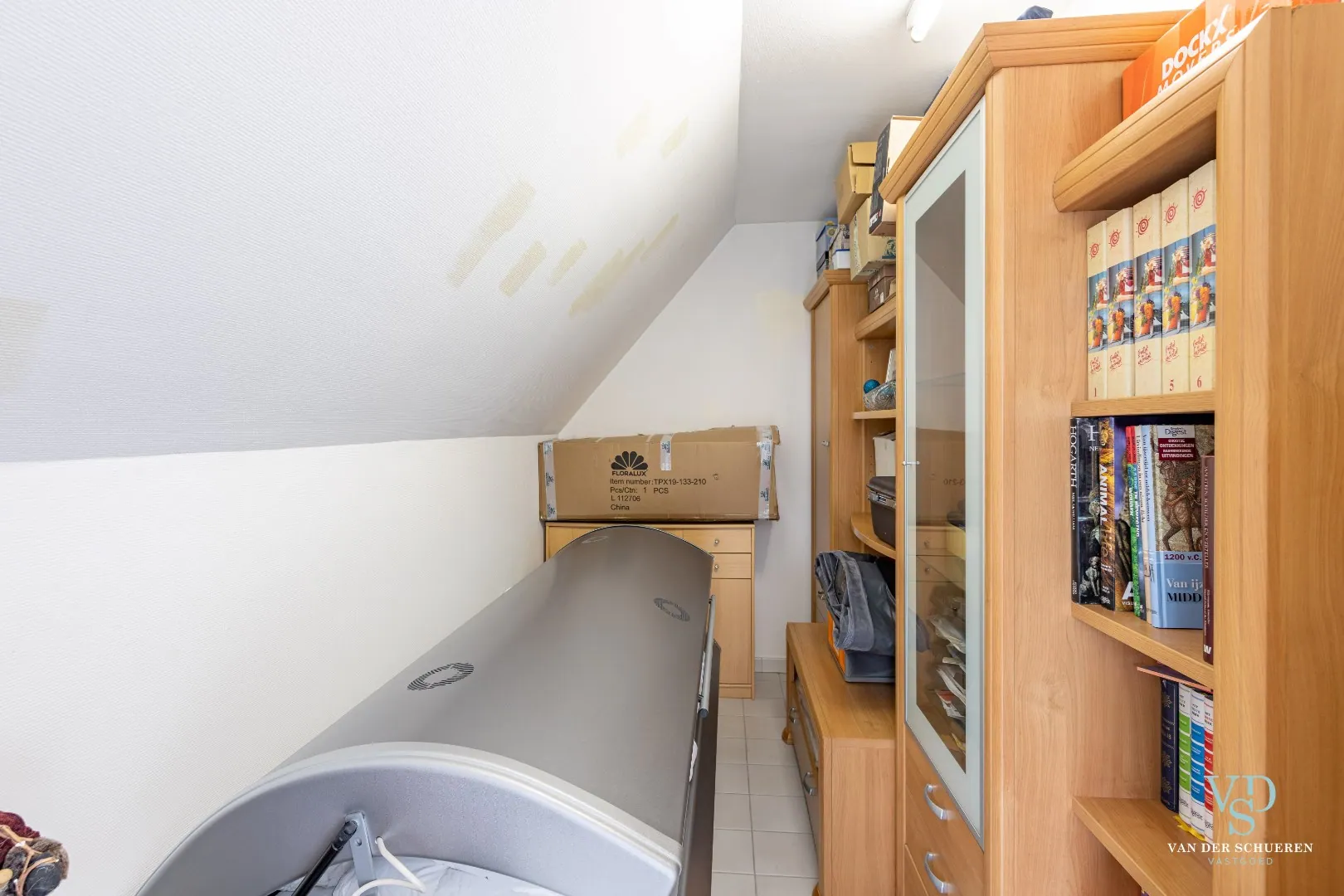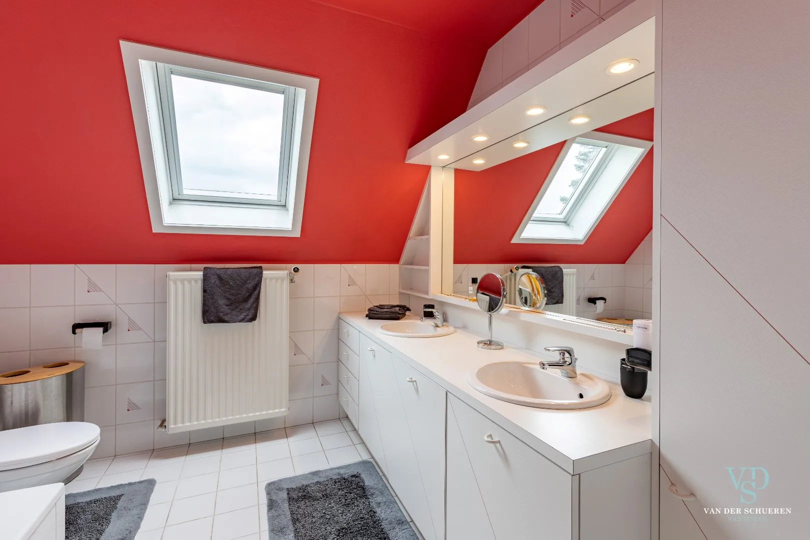 De verdieping is voorzien van een masterbedroom met vast bed en ingemaakte kasten, 2 slaapkamers, een bureel met aanpalende bergruimte en een badkamer met o.a. bad én douche.