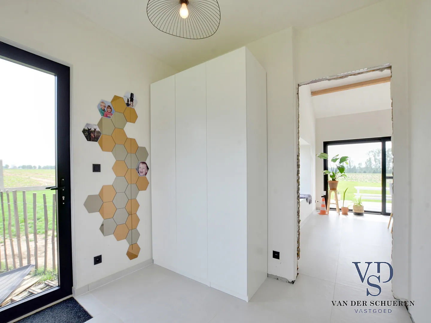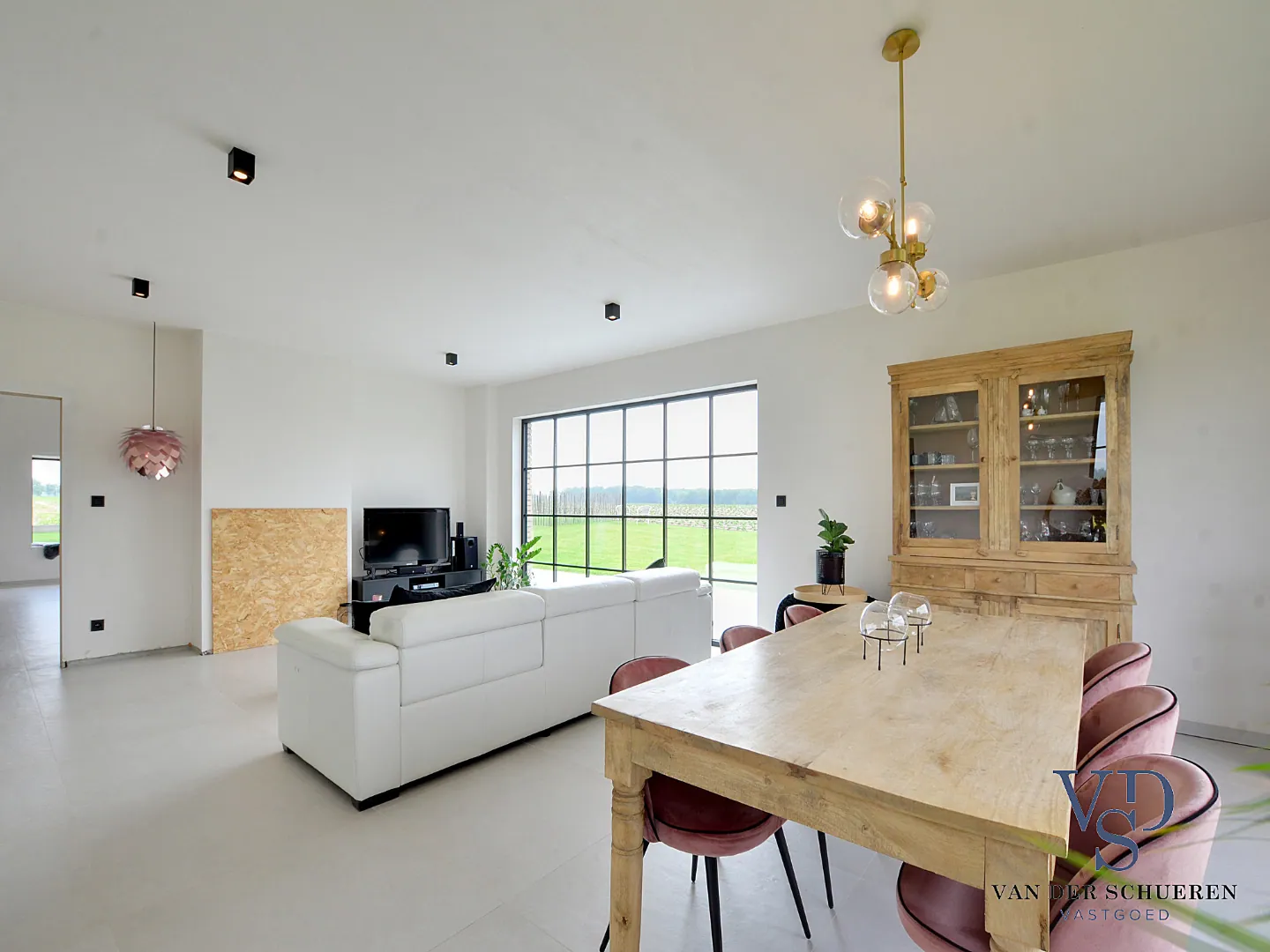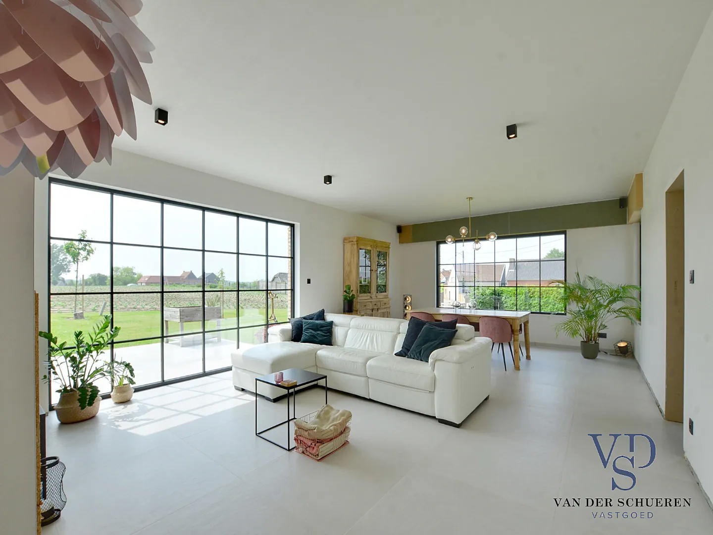 De inkom brengt ons naar de zithoek, opnieuw rijk aan licht en ruimte. Ook hier versterkt de natuurlijke omgeving de woonbeleving.